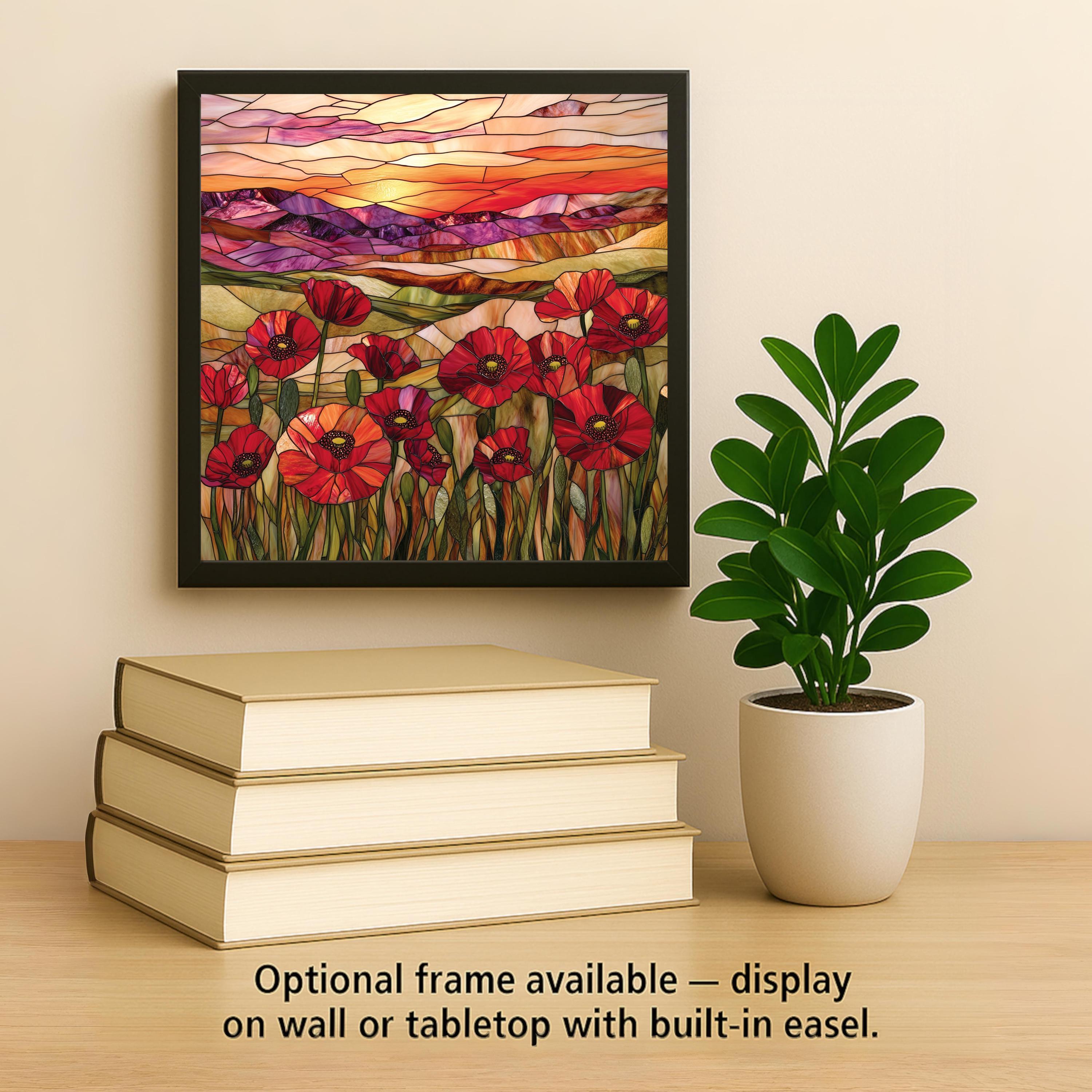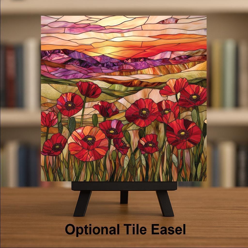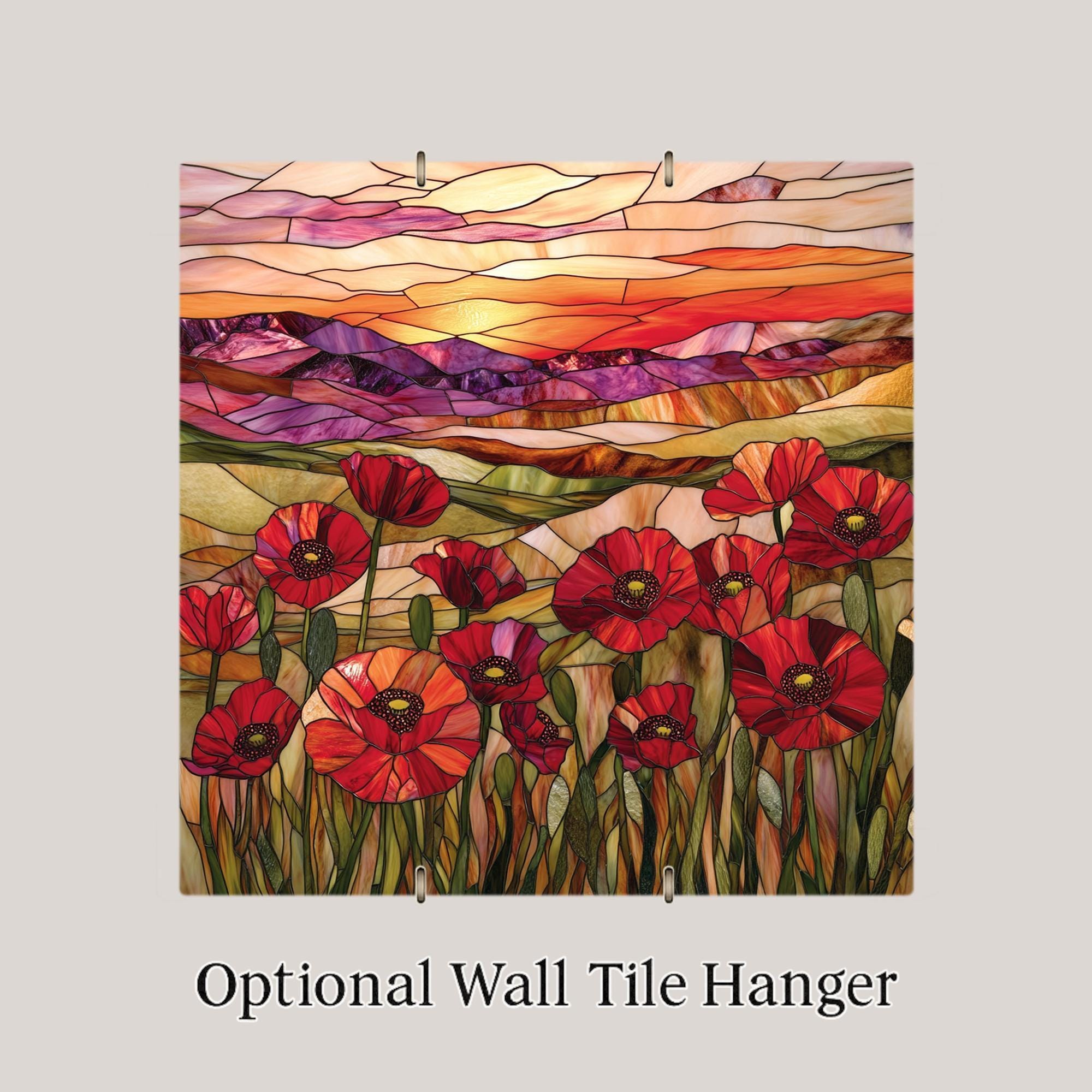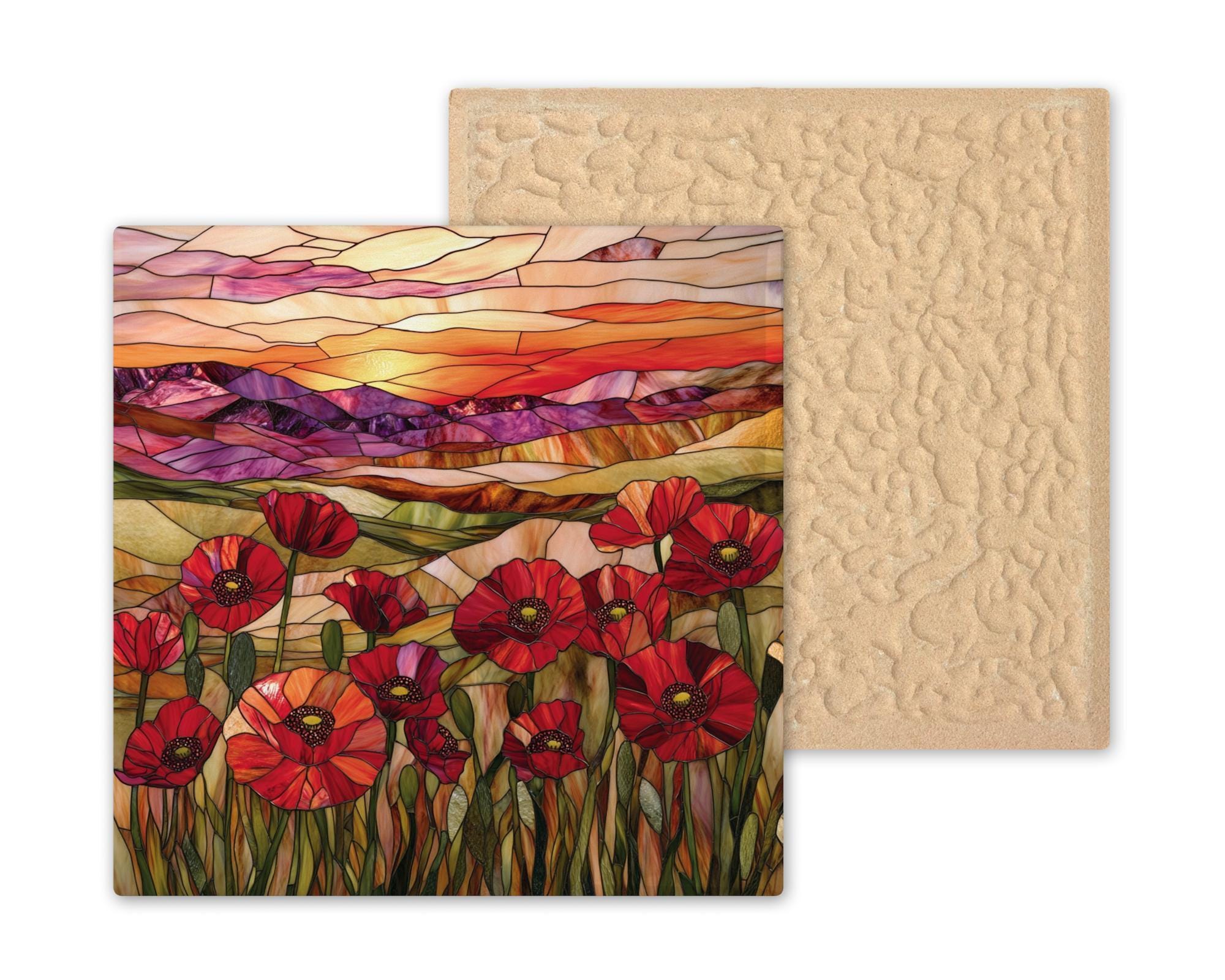 Inspired by traditional stained glass art, the design blends the warmth of a fading sun with the bold textures of wildflowers in bloom. The background transitions from deep purples and rose golds to gentle peach and lavender, while the foreground bursts with vivid red poppies—symbols of remembrance, renewal, and beauty. Whether you’re decorating a nature-inspired space or gifting a flower enthusiast, this tile brings the outdoors inside in a timeless, meaningful way.