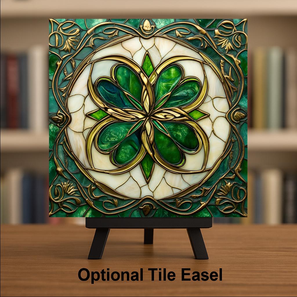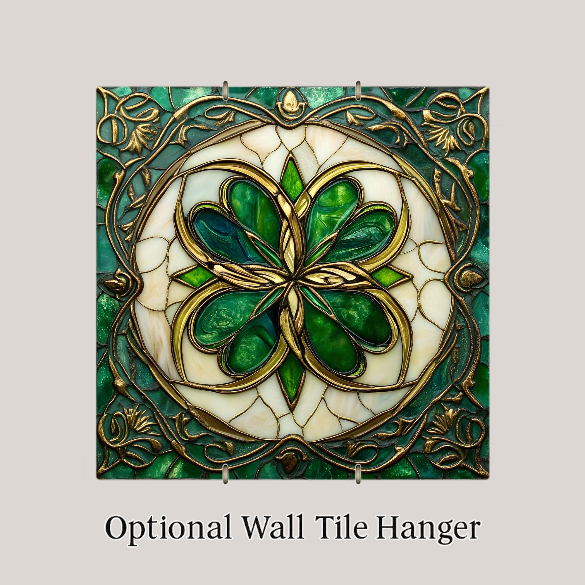 Infuse your home with Celtic spirit and vibrant Irish design through this handcrafted ceramic tile featuring a Celtic shamrock. The central shamrock is rendered in rich green marbled tones with a golden interlaced knot design, framed by ornate scrollwork in a stained glass mosaic style. It’s the perfect decorative piece to honor St. Patrick’s Day, your Irish roots, or a love for mystical, symbolic art.