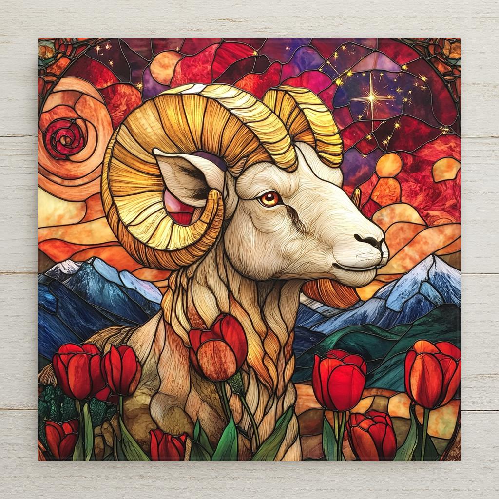 Bold and brilliant, this Aries wall art tile features a ram set against a stained glass backdrop of swirling reds, golds, and purples. A constellation sparkles above, while tulips bloom below, echoing the vitality of spring and Aries’ spirited personality. Every detail—from the ram’s confident posture to the glowing sky—captures the essence of this zodiac sign.