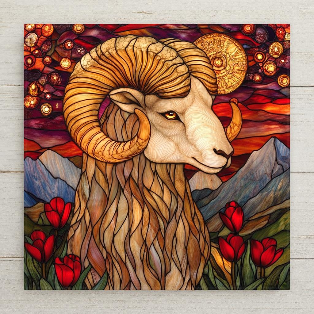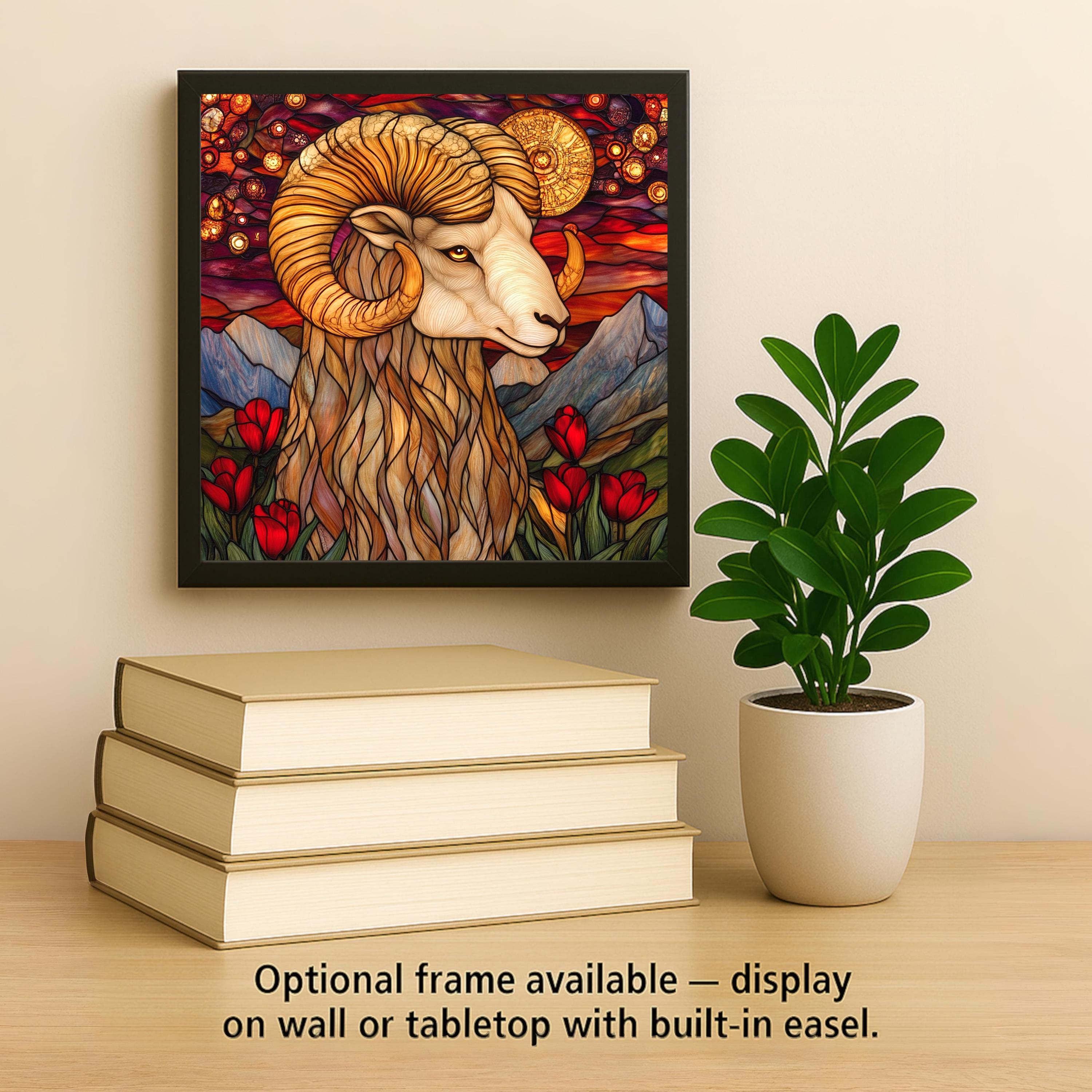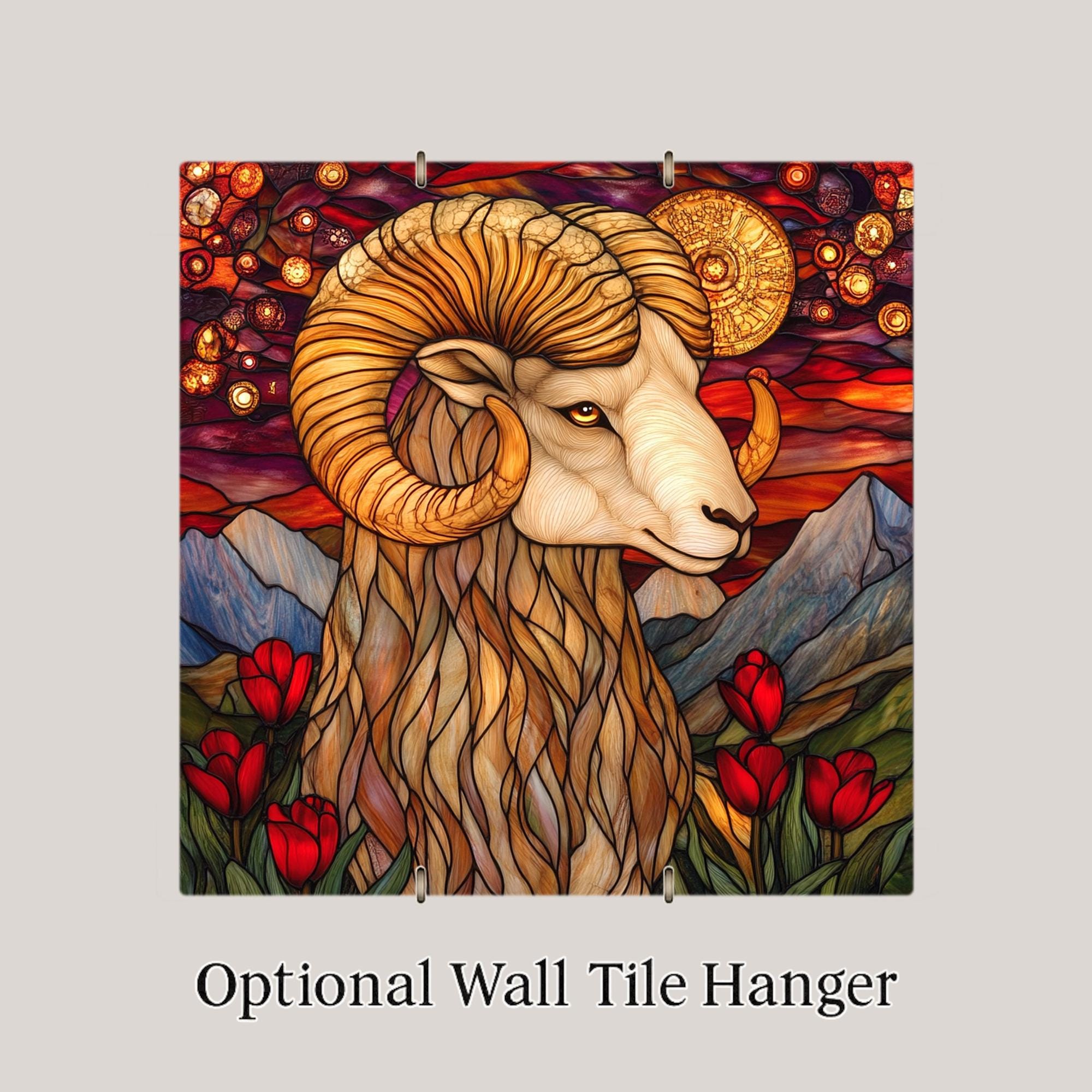 Honor the fearless energy of Aries with this stained glass-inspired ceramic tile. Featuring a majestic ram surrounded by glowing celestial patterns, red tulips, and mountain vistas, this zodiac wall art is full of symbolism. The rich fire sign colors—crimson, gold, and amber—capture the passion and strength of those born under Aries.