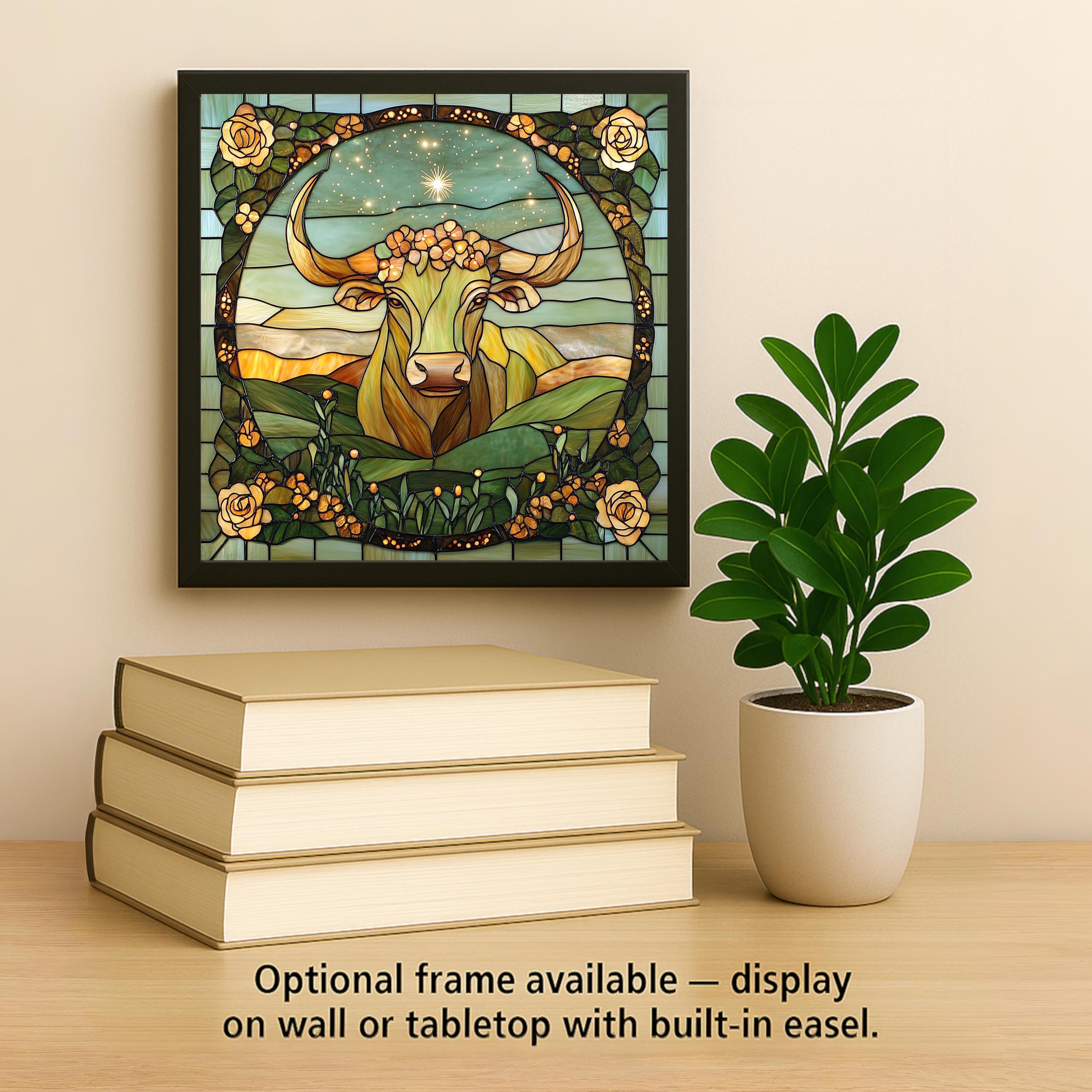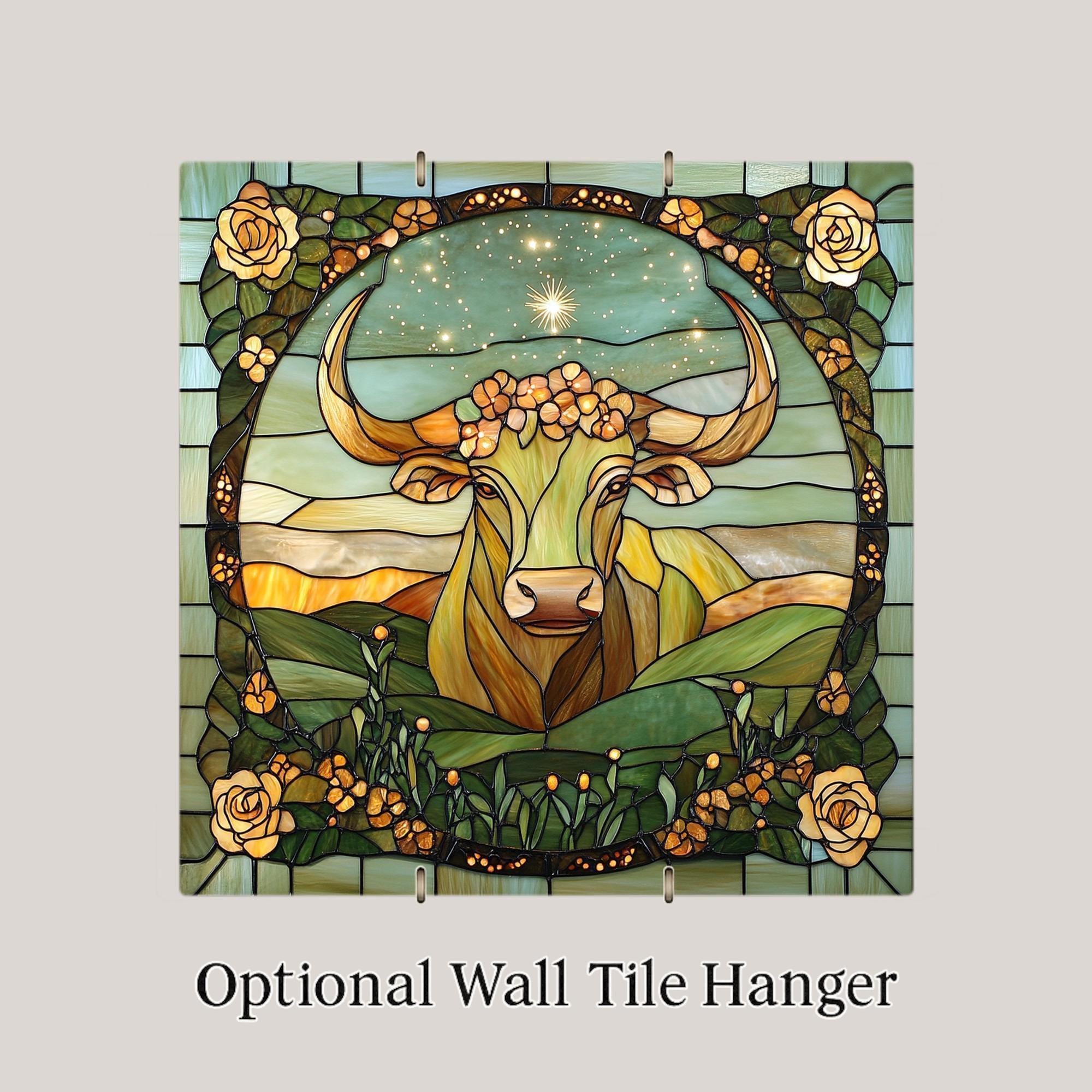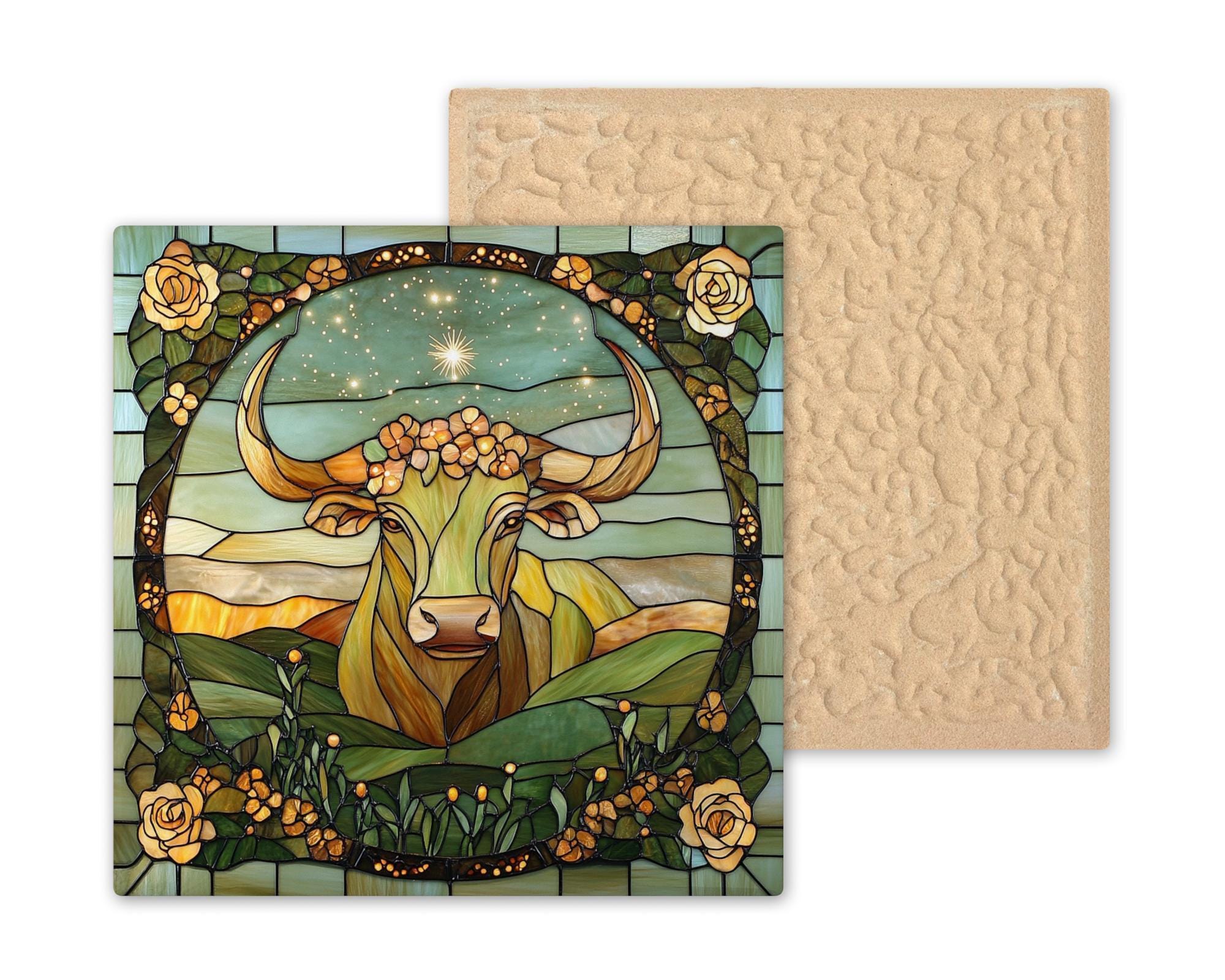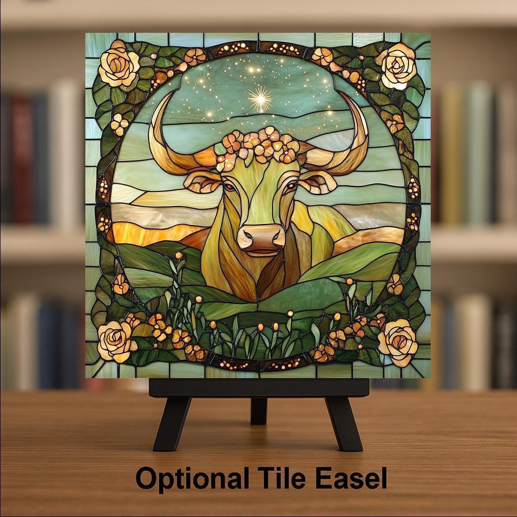 Honor the grounded spirit of Taurus with this stained glass-inspired ceramic tile featuring a proud bull surrounded by stars, blossoms, and rolling hills. Thoughtfully illustrated with earthy tones and graceful floral detailing, this Taurus zodiac wall art radiates strength, patience, and beauty—just like the sign it represents.
