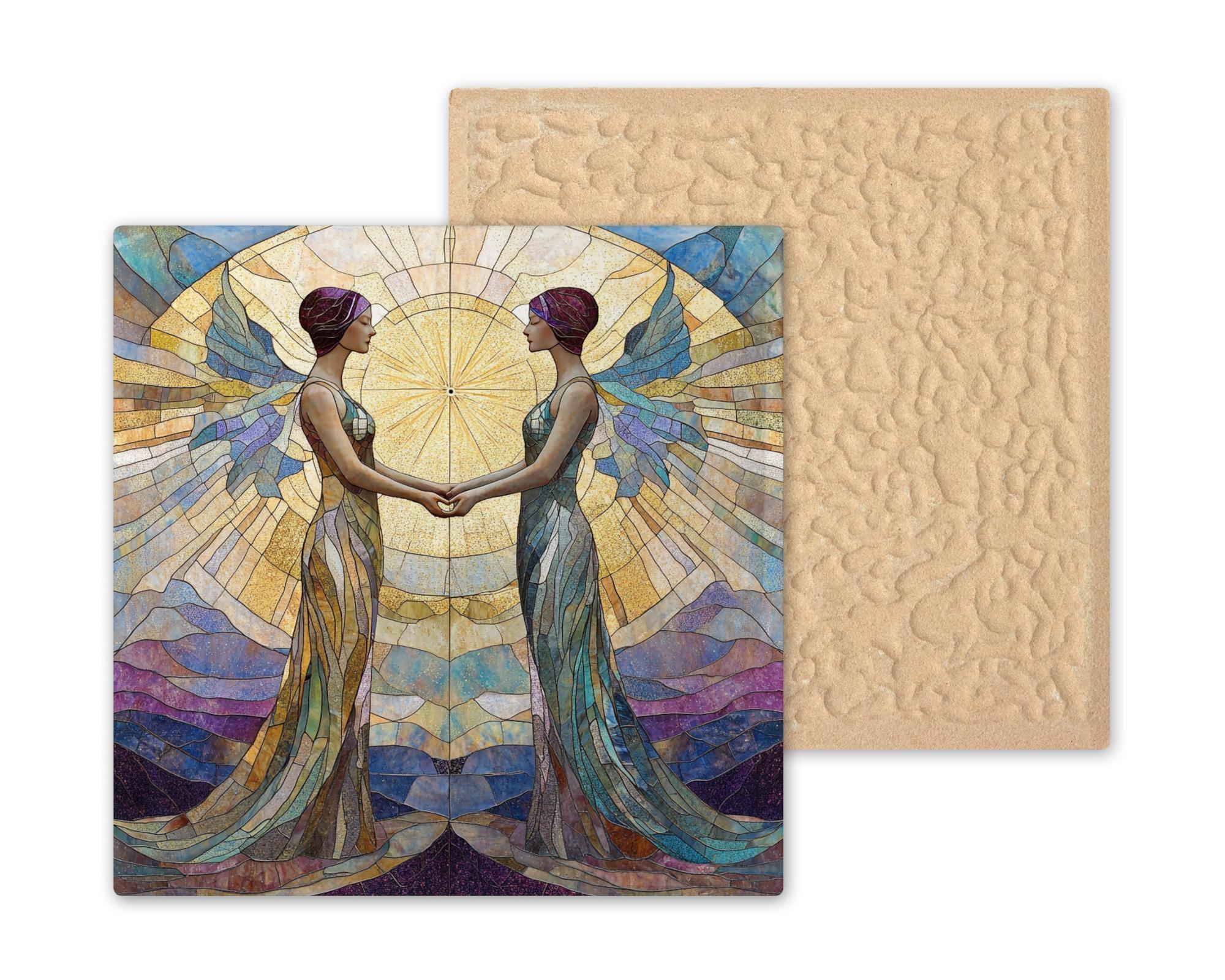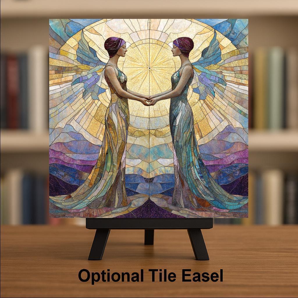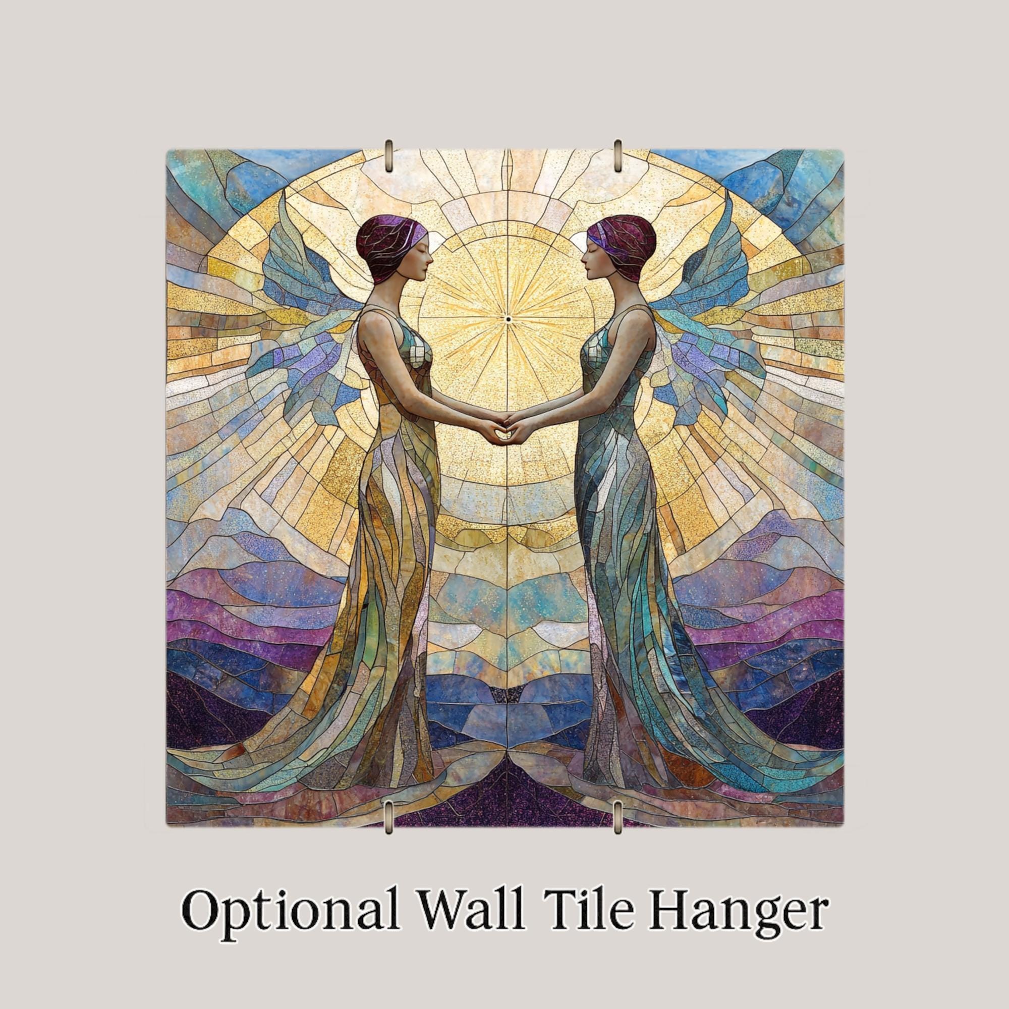 This radiant Gemini ceramic tile captures the spirit of the zodiac twins in breathtaking stained glass style. Two mirrored figures hold hands in front of a golden celestial burst, symbolizing the airy, ever-curious energy of Gemini. Rendered in soft purples, teals, and sun-washed neutrals, this tile is a heartfelt tribute to those born in late May or early June.