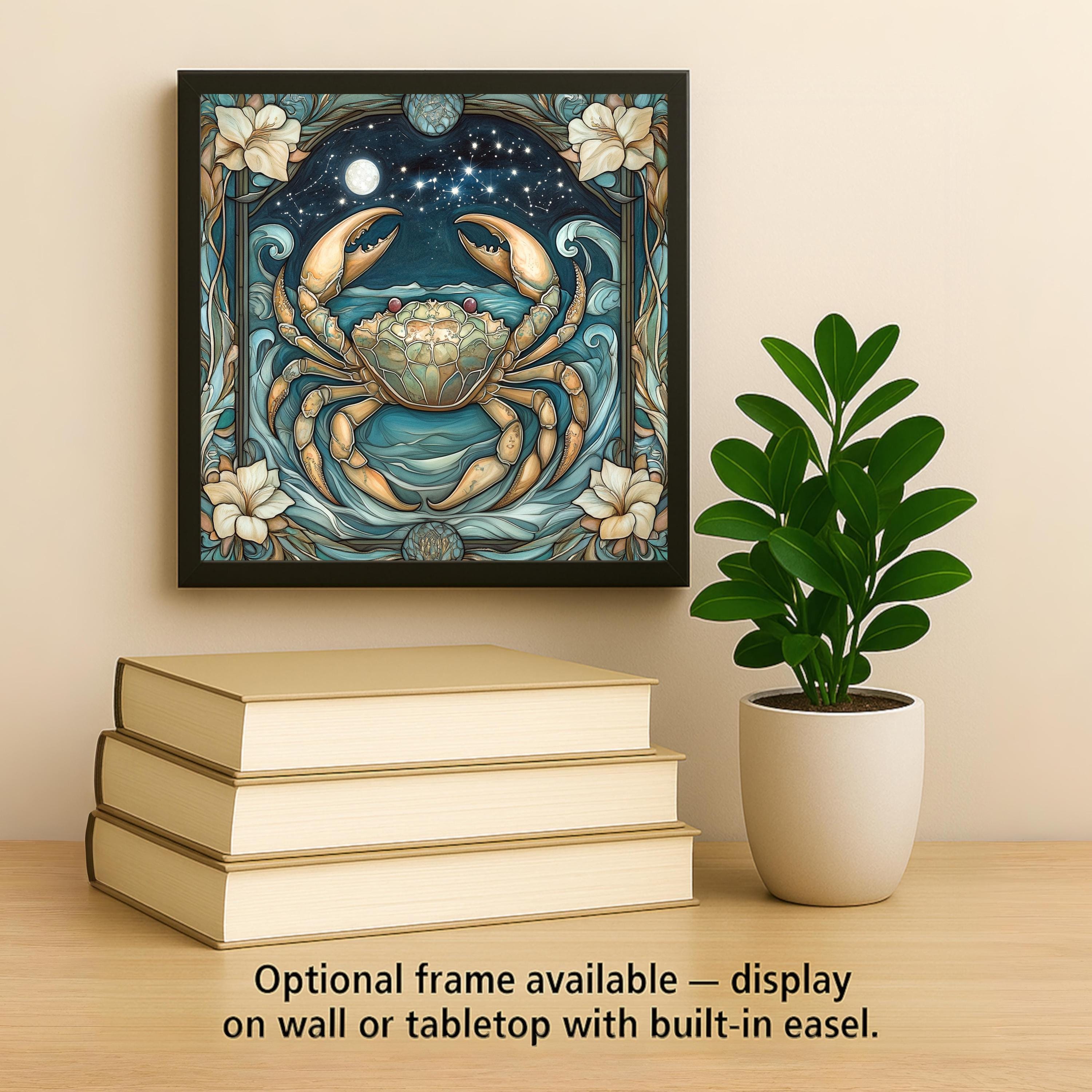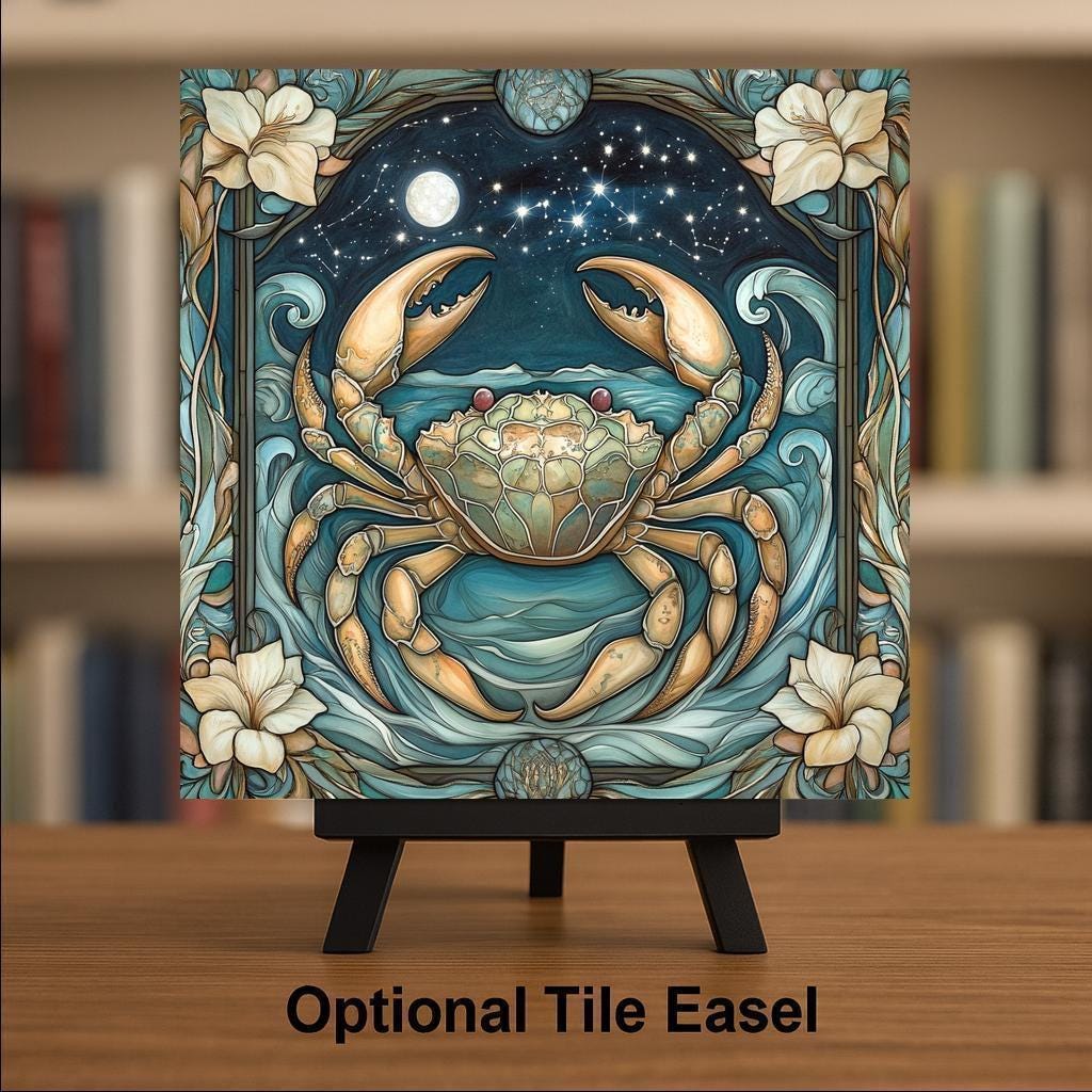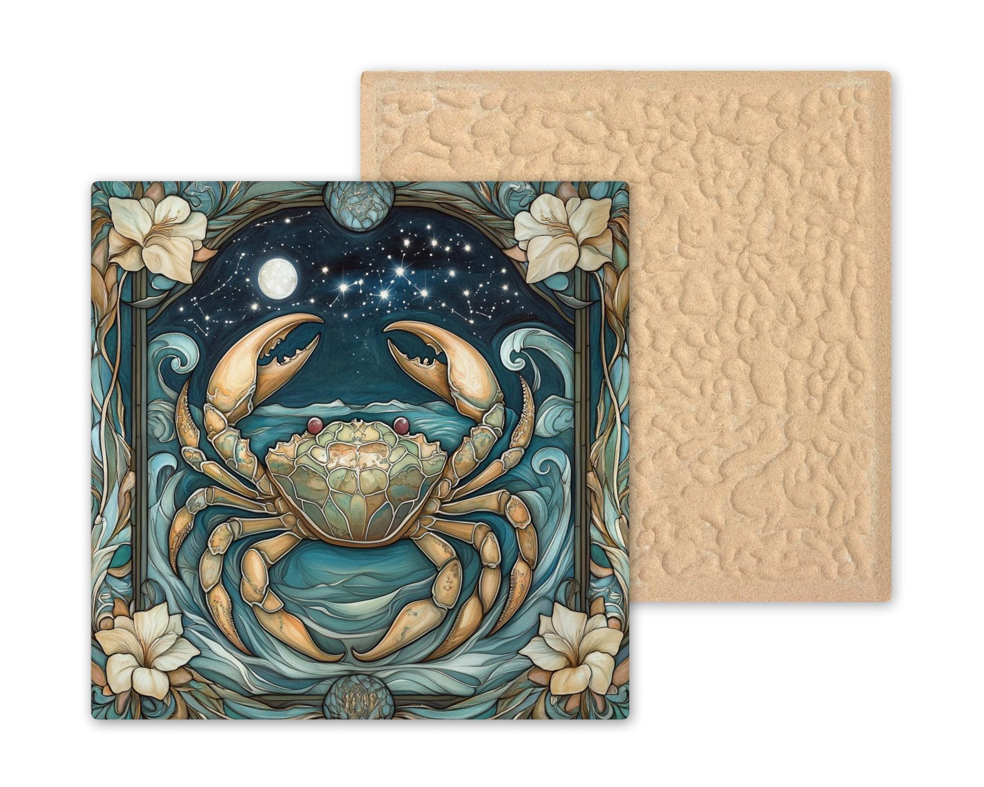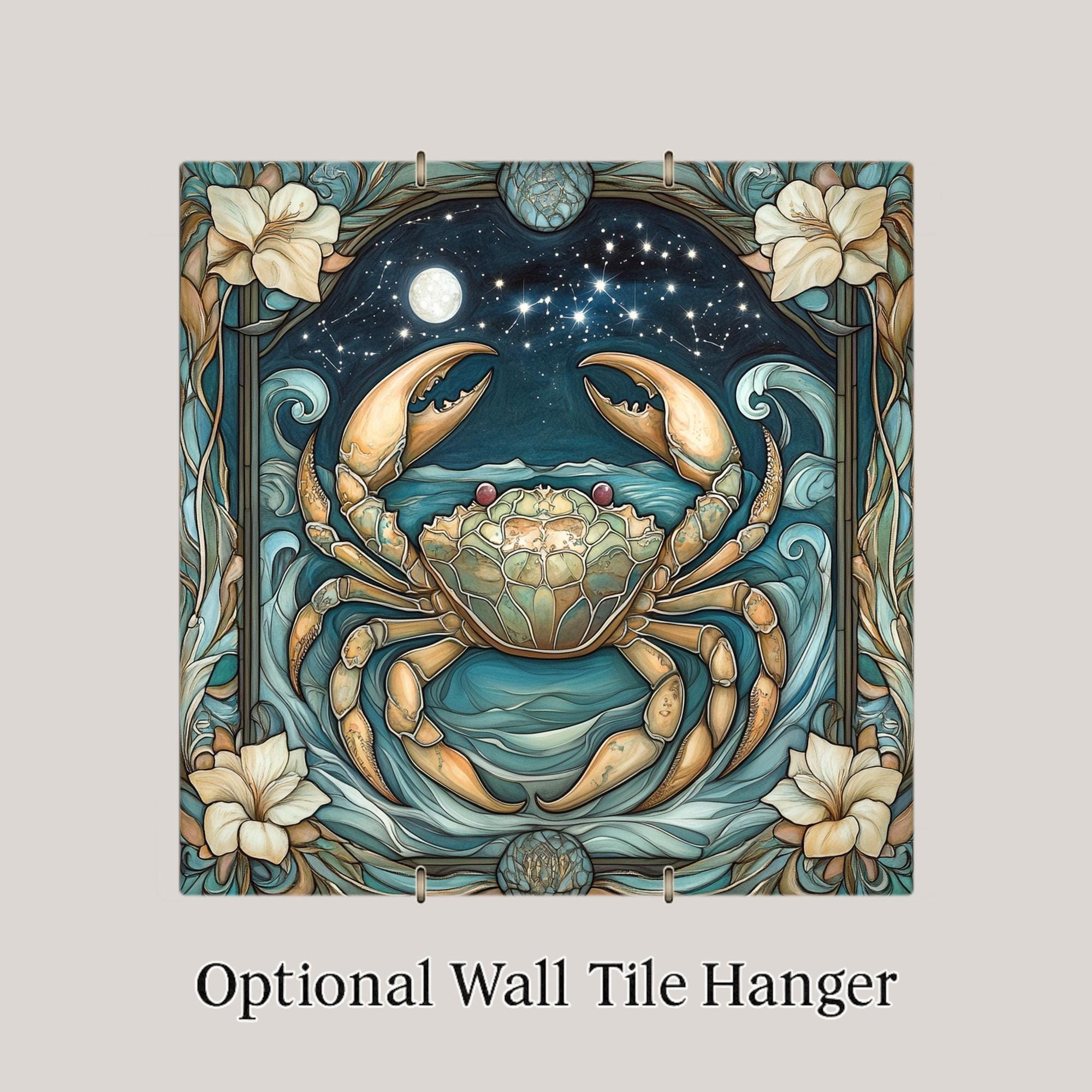 This Cancer zodiac ceramic tile brings the ocean to your walls with an enchanting stained glass-style crab design. Surrounded by curling waves, blooming lilies, and the Cancer constellation above, this celestial artwork captures the soft strength of this water sign. The peaceful night sky and earthy ocean hues offer a serene aesthetic that’s perfect for astrology lovers and June–July birthdays.