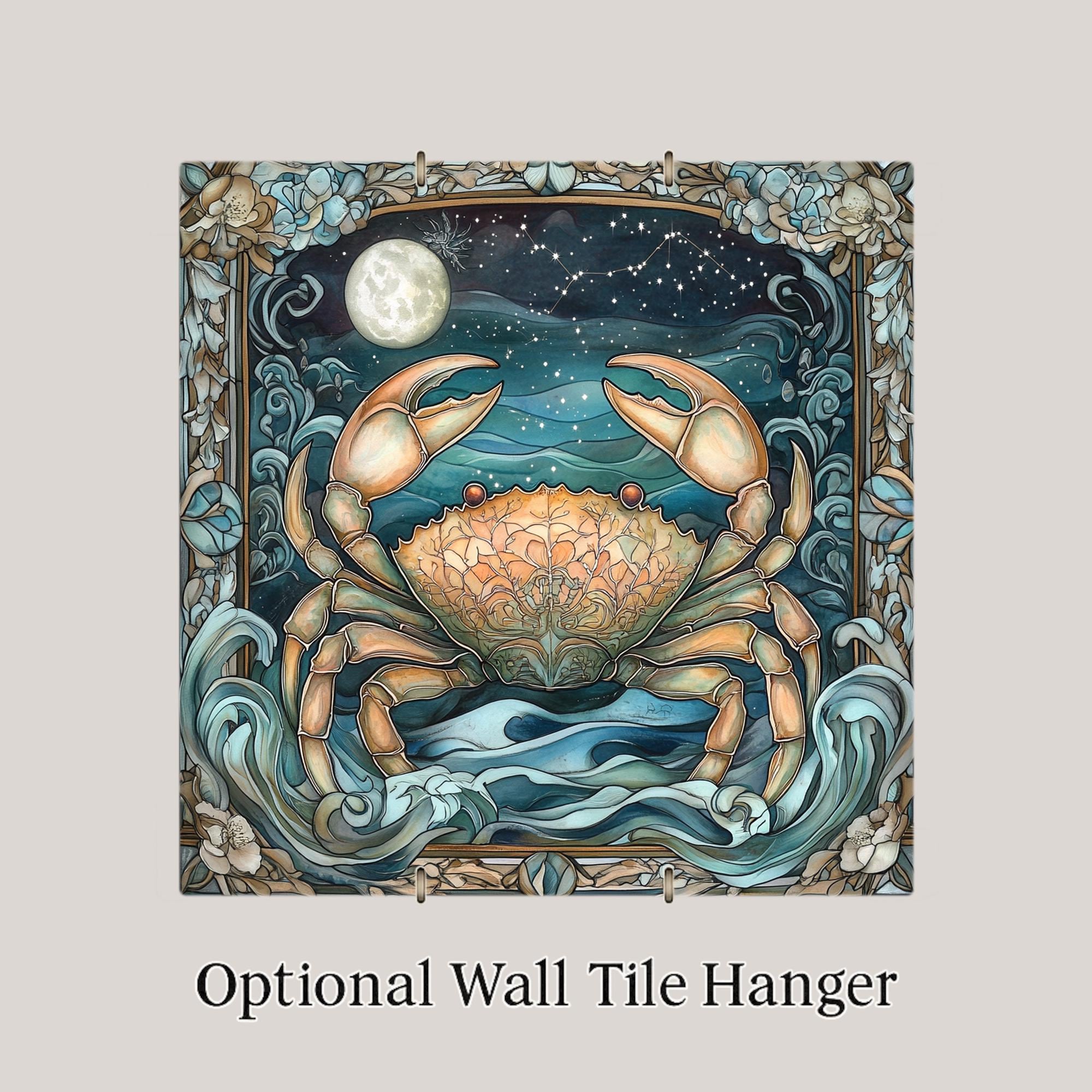 This floral Cancer zodiac ceramic tile celebrates the nurturing and intuitive nature of the Cancer star sign. A majestic crab glows under the full moon, surrounded by stained glass-style waves, blooming branches, and the Cancer constellation overhead. It’s a heartfelt design that blends coastal beauty with celestial symbolism, perfect for astrology lovers and moonchildren alike.