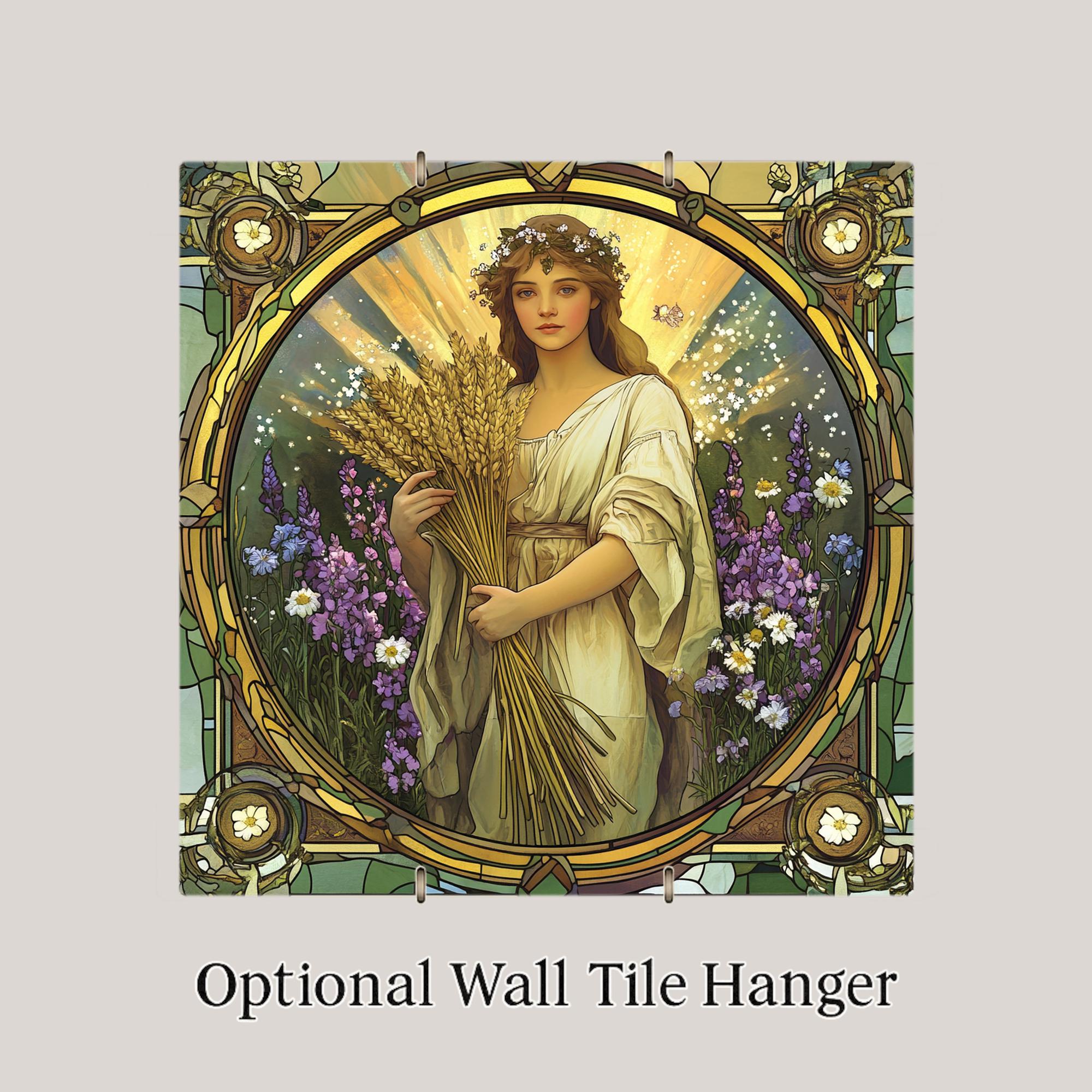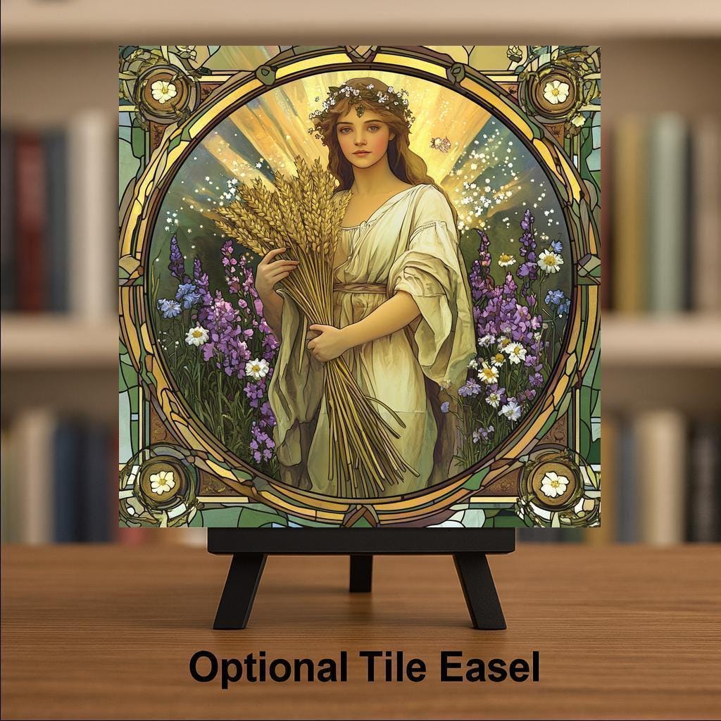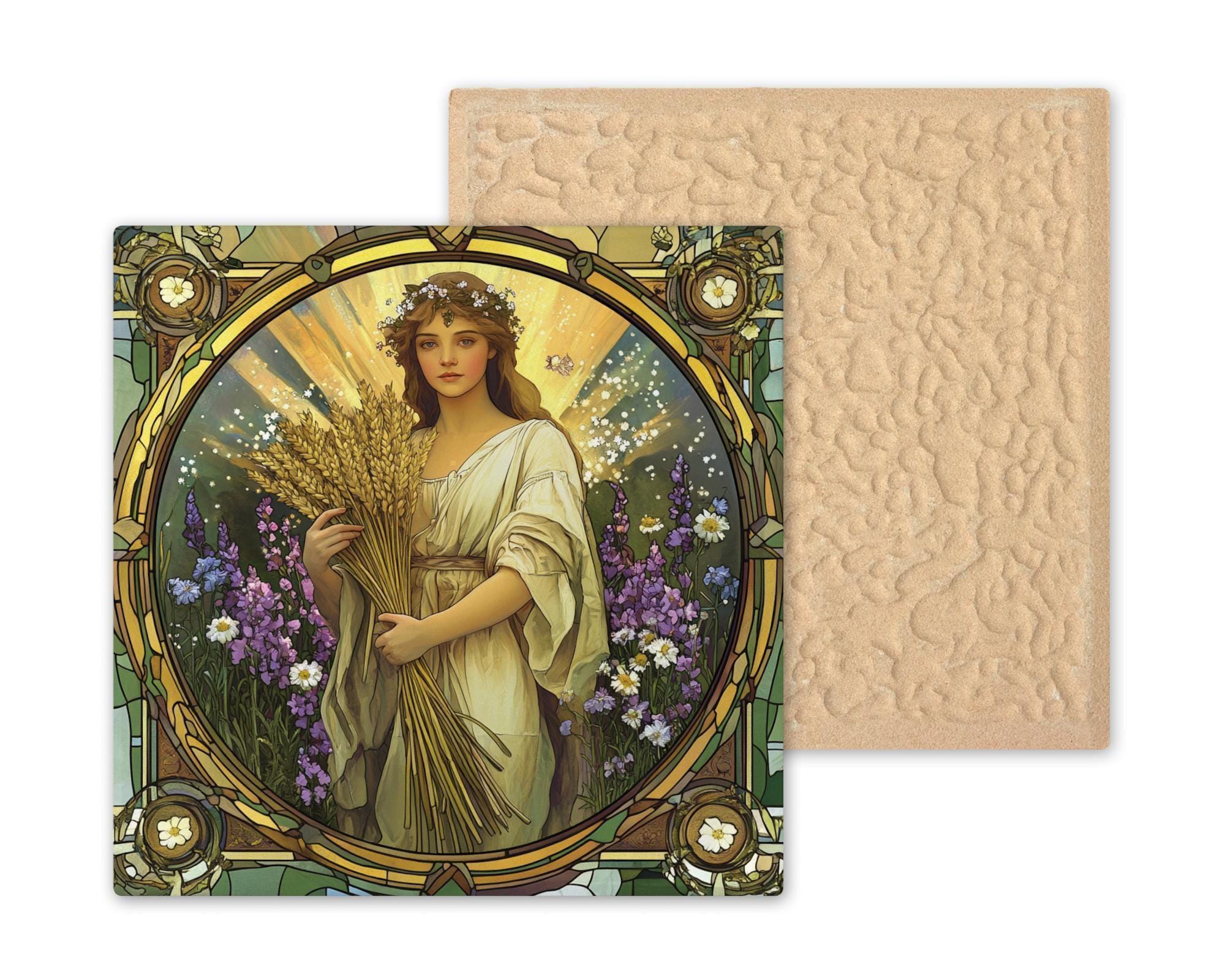 Grounded in nature and adorned in celestial beauty, this Virgo zodiac ceramic tile features a serene maiden holding wheat—a classic symbol of harvest and purity. Surrounded by purple blooms, white wildflowers, and golden sun rays, she embodies Virgo’s deep connection to the earth and attention to detail. The Art Nouveau frame and stained-glass look add vintage sophistication to this modern zodiac tribute.