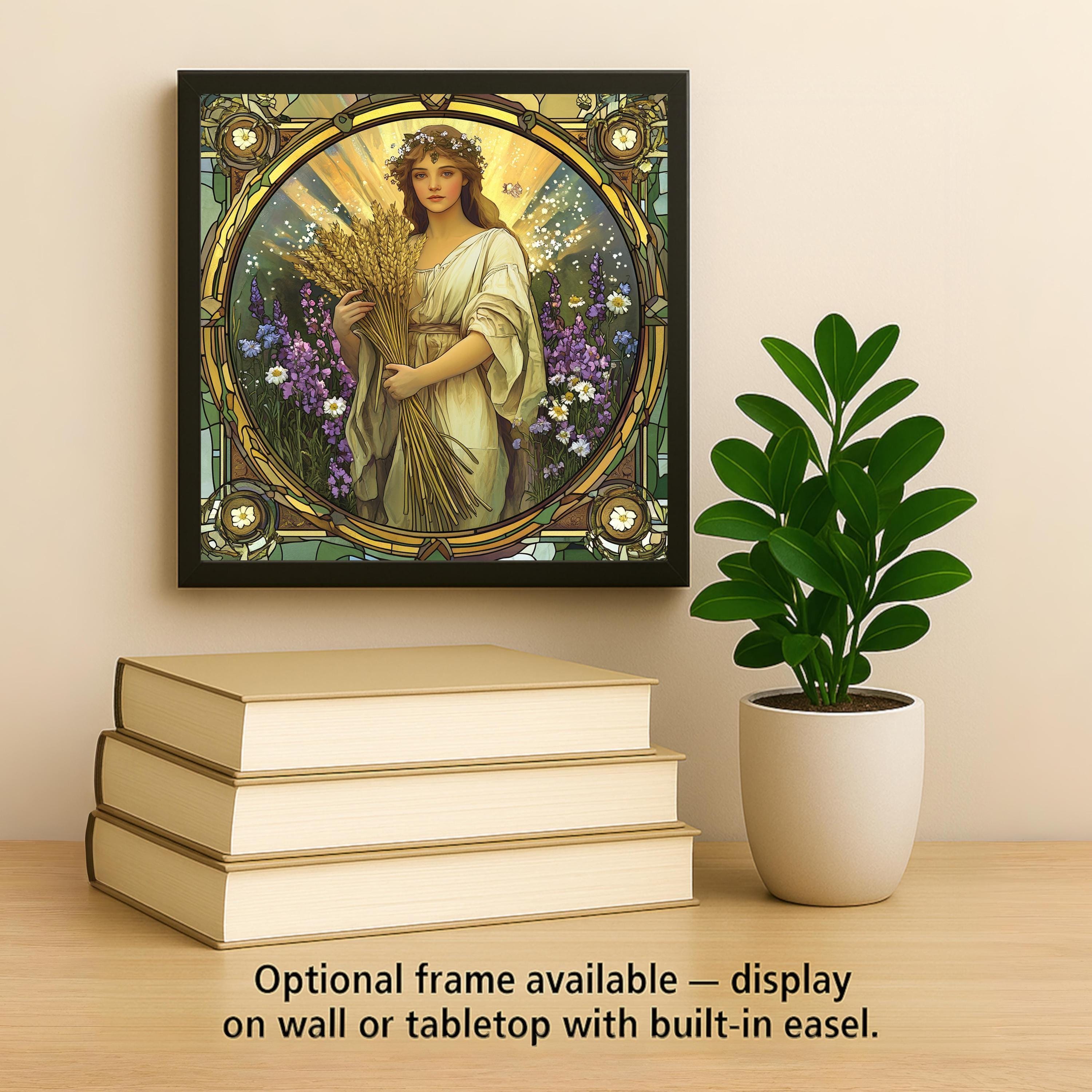 Designed in soft golden hues with harmonious greens and lavenders, this piece is perfect for a Virgo’s calming energy. The composition is balanced and symmetrical, reflecting Virgo’s love of structure and thoughtful presentation. Her gentle gaze and natural surroundings invite peace and mindfulness into any space.