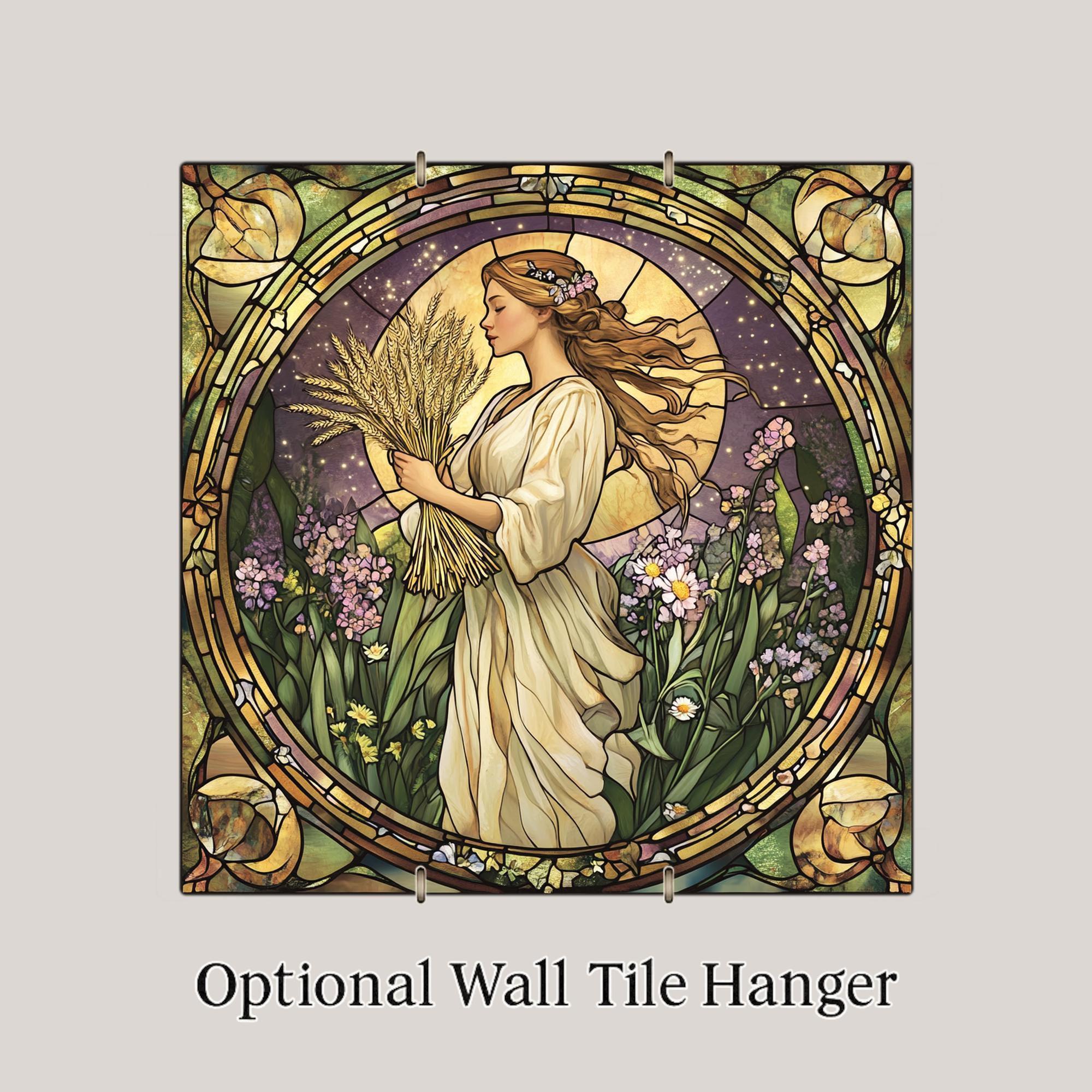 Honor Virgo's graceful essence with this stunning ceramic tile, designed in the style of Art Nouveau stained glass. Featuring a maiden in a flowing gown holding wheat stalks, surrounded by daisies and wildflowers beneath a glowing moon, this piece beautifully captures Virgo’s connection to harvest, purity, and nature.