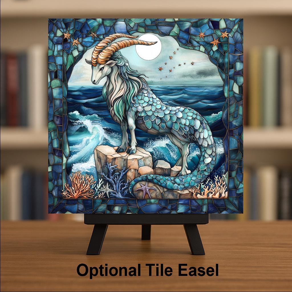 This handcrafted Capricorn zodiac ceramic tile features the mystical sea goat rendered in brilliant stained glass-inspired style. It blends celestial wonder with ocean power, capturing Capricorn’s grounded ambition and deep emotional strength. Crashing waves, glowing stars, and shimmering teal scales form a dramatic scene that reflects this earth sign’s complex nature.