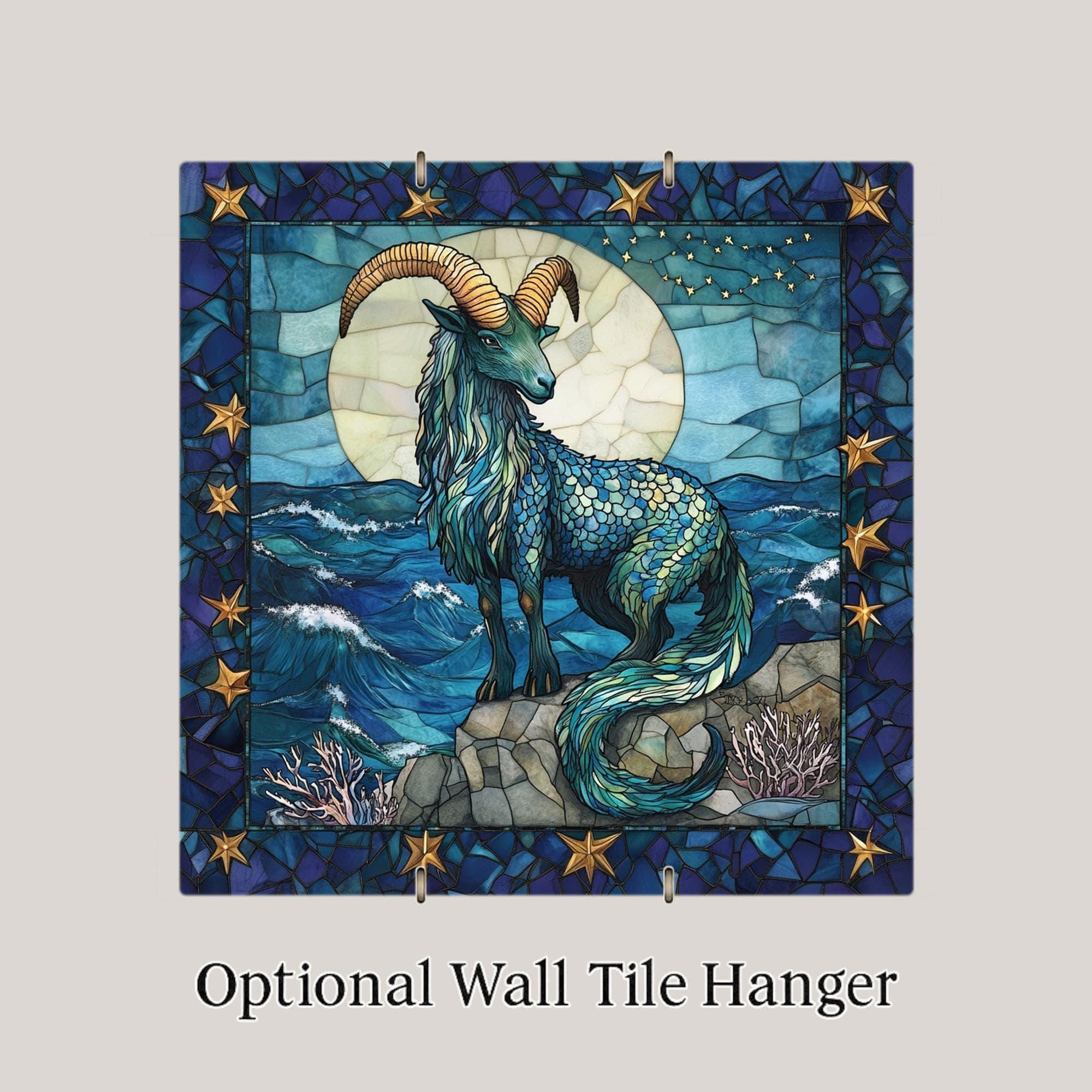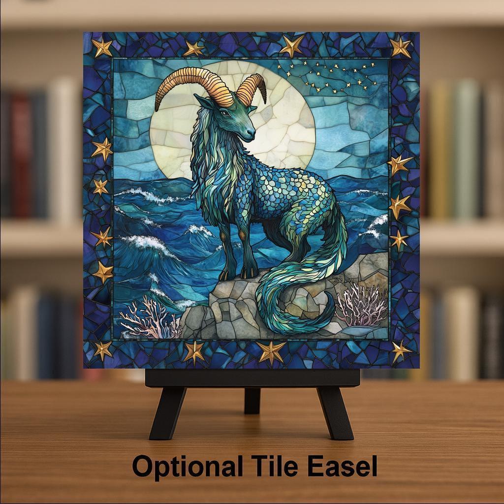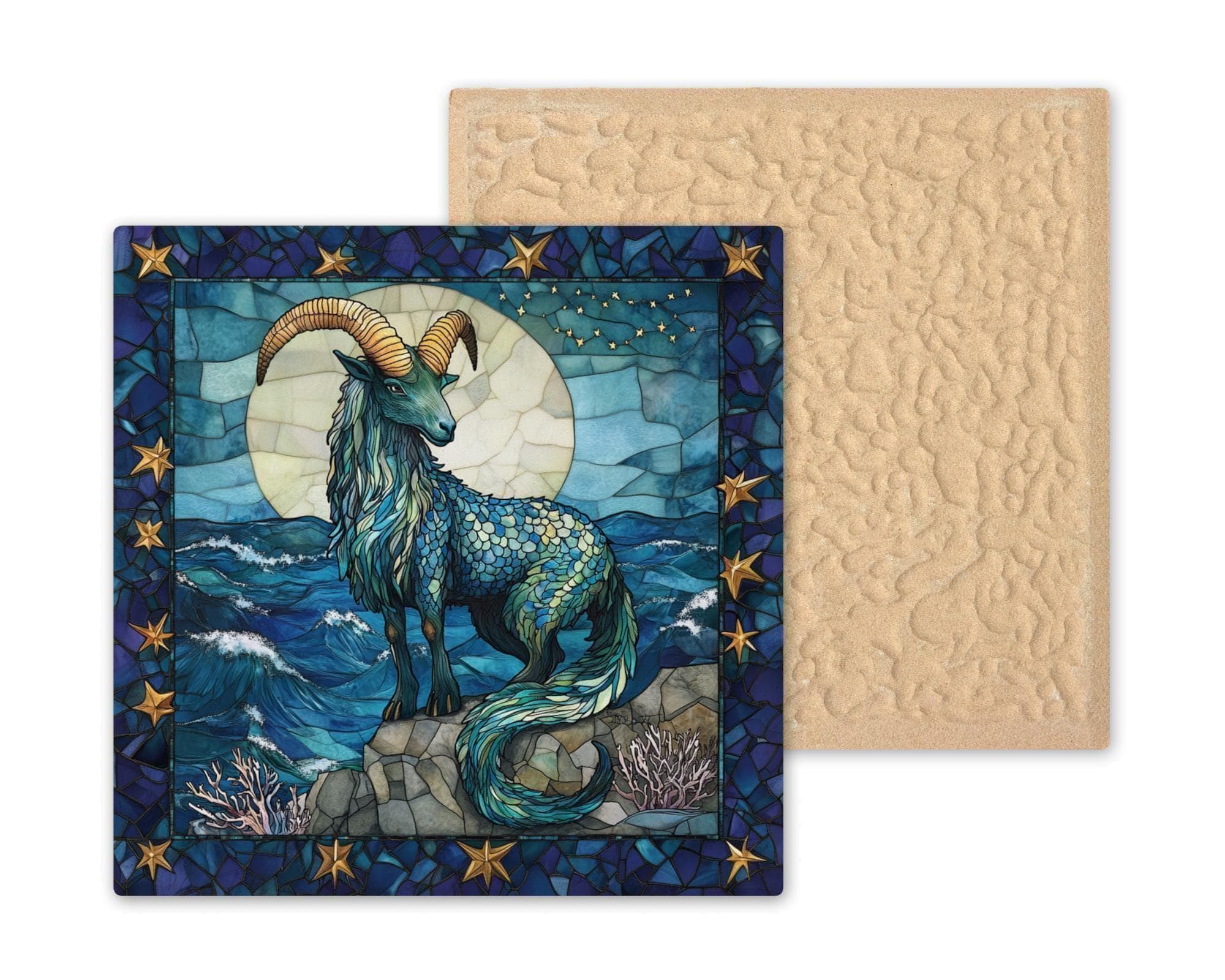 This Capricorn ceramic tile brings zodiac energy to life through stained glass-style artistry. The sea goat stands confidently against ocean waves and a glowing moon, with swirling shades of aqua, sapphire, and indigo forming a serene, otherworldly scene. Golden stars sparkle along the border, celebrating Capricorn's connection to the night sky and the wisdom of the cosmos.