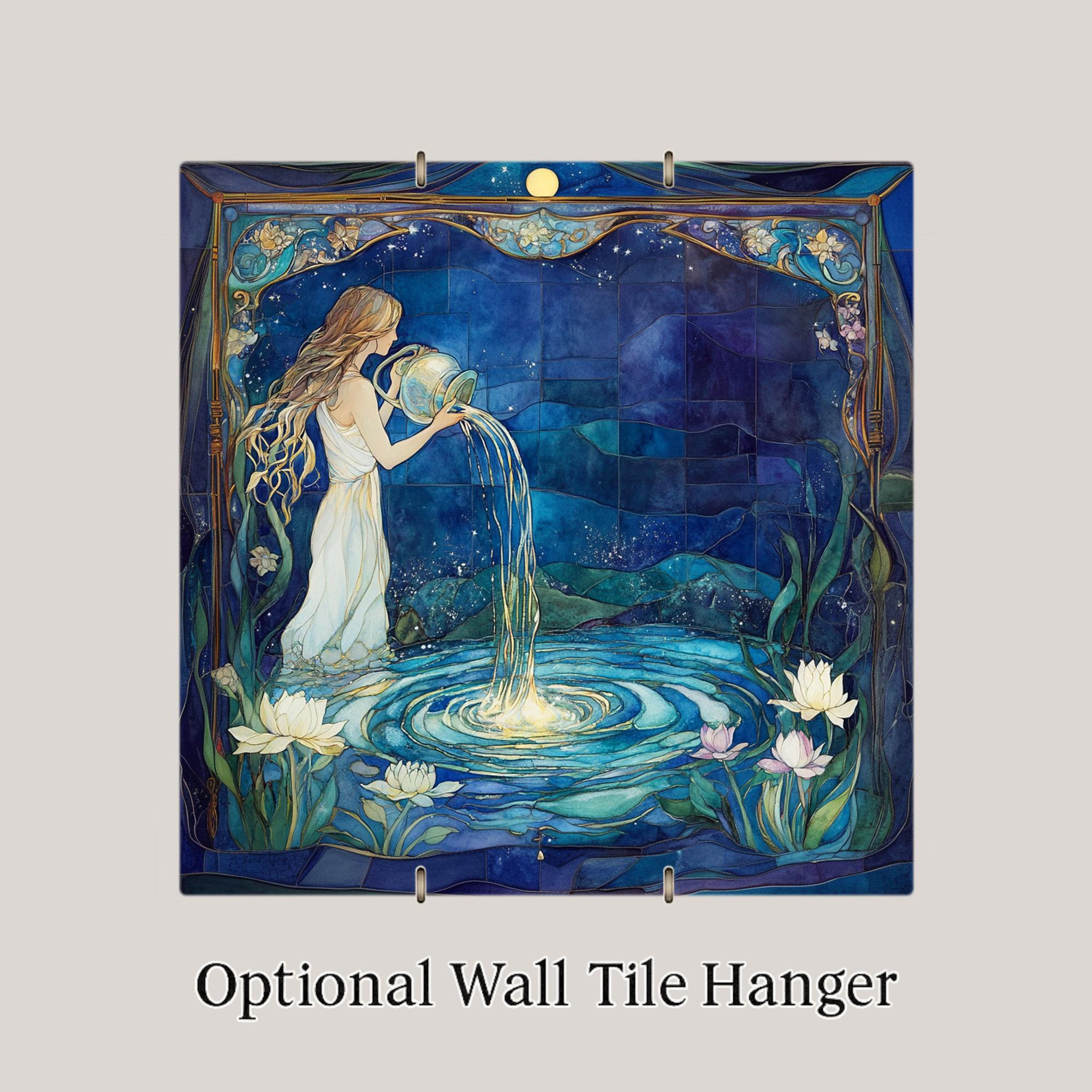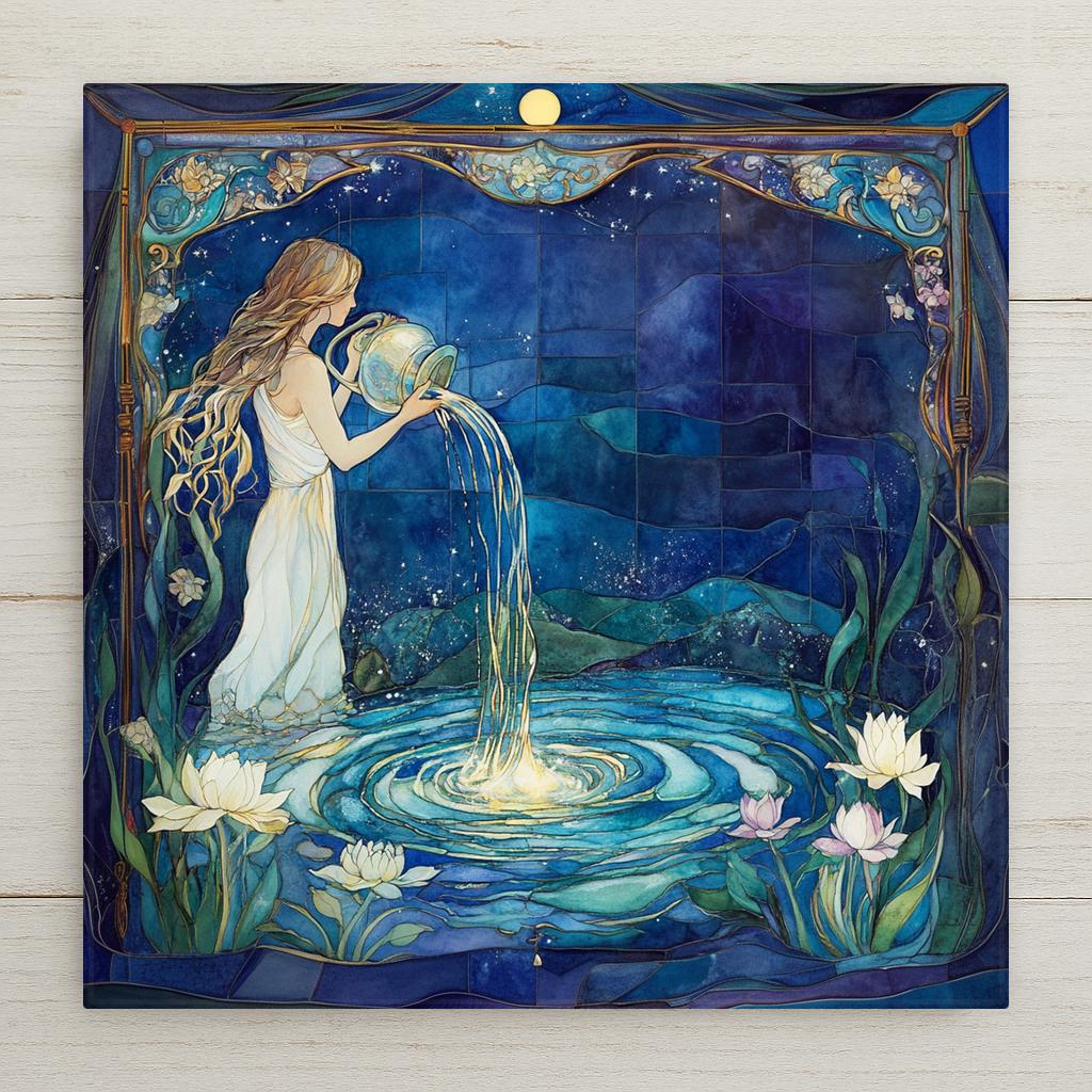 Infuse your space with celestial charm through this Art Nouveau Aquarius ceramic tile. The design captures the zodiac’s iconic water bearer in a dreamlike nighttime scene, framed by flowing florals and cosmic blues. Shimmering water pours gracefully into a glowing pool, reflecting the sign’s connection to wisdom, truth, and intuition. It’s an ideal gift for birthdays or as a meaningful decor piece for your astrology-themed room.