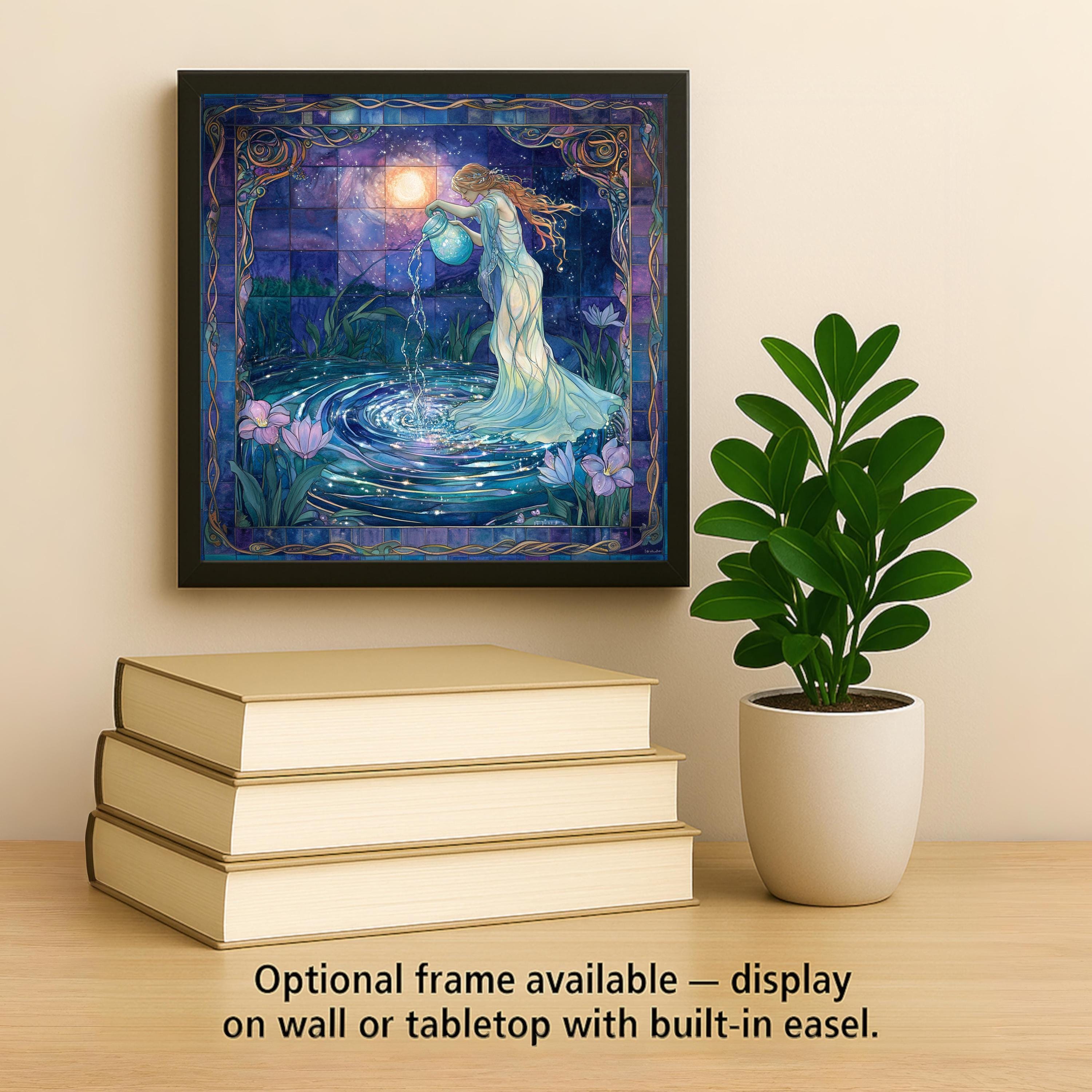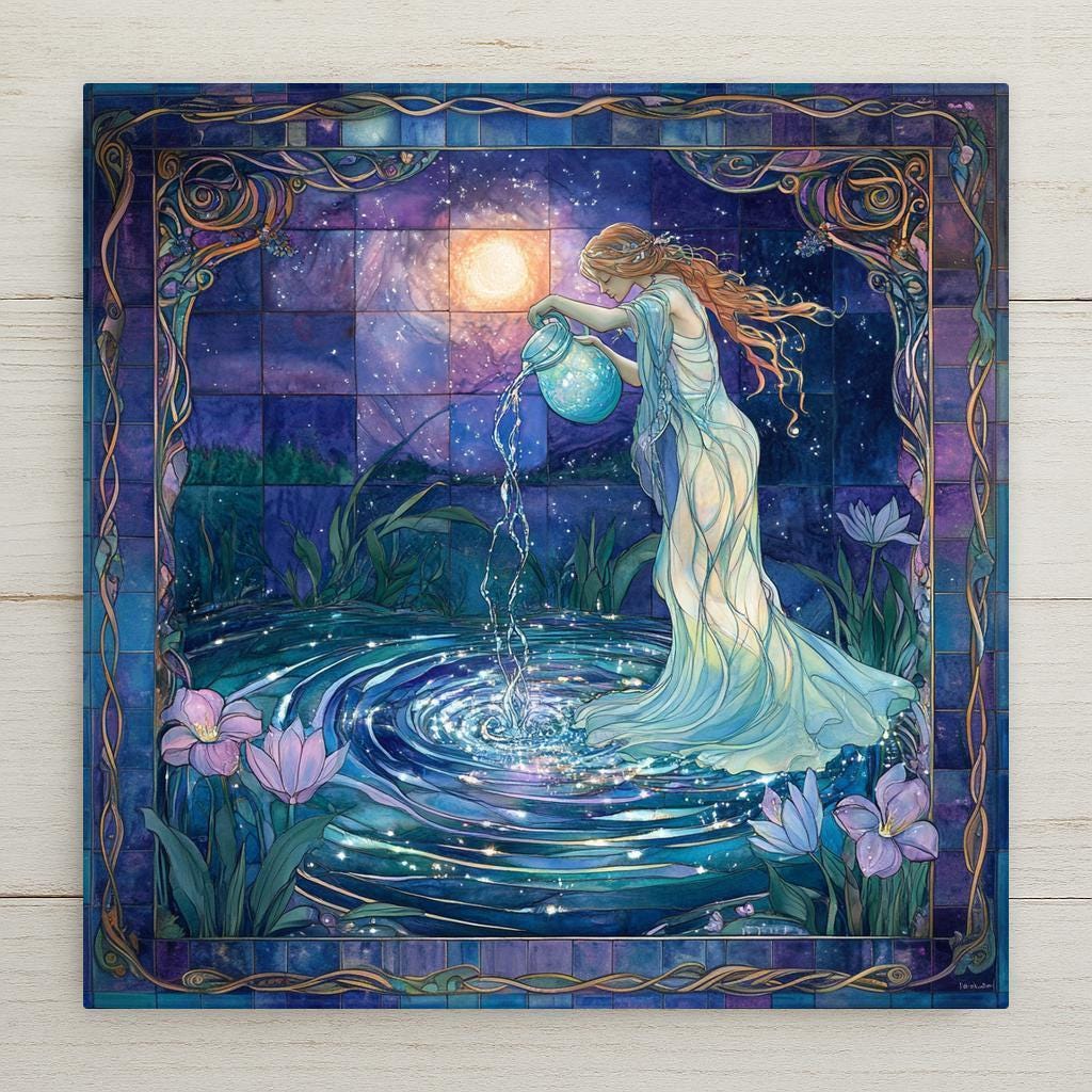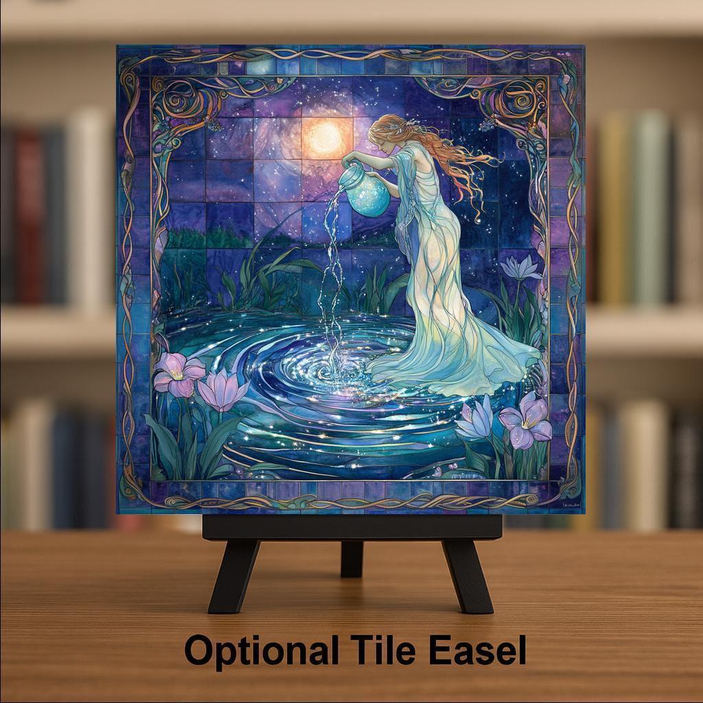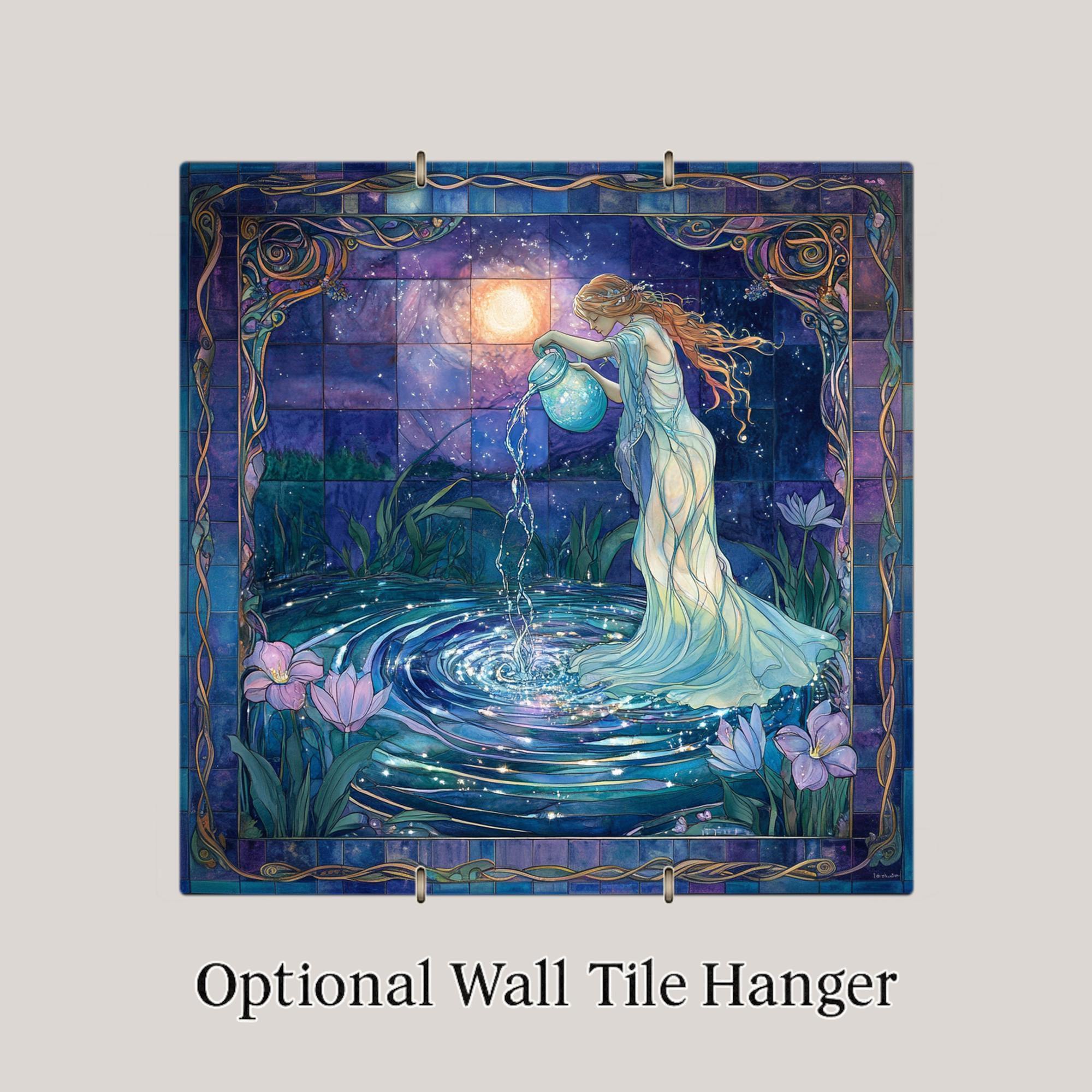 The dreamy color palette features cool shades of blue, violet, and teal, highlighted with celestial gold accents. Framed in Art Nouveau lines and soft floral motifs, this tile feels like a sacred piece of art and a powerful symbol of the Aquarian journey. Whether you're born under the Aquarius sign or gifting this to someone who is, it makes a perfect birthday gift or addition to a spiritual home altar.