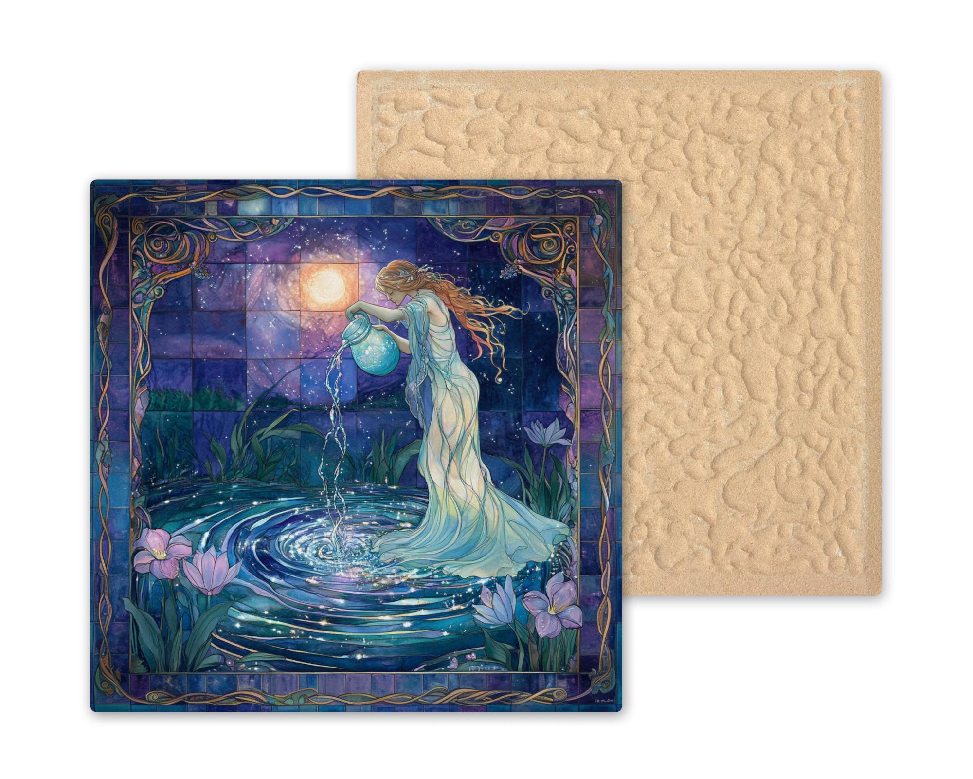 This Aquarius Zodiac Ceramic Tile is a stunning tribute to the Water Bearer, beautifully rendered in stained glass style for lovers of astrology and celestial decor. Featuring a goddess-like figure gently pouring sparkling water beneath a full moon and starlit sky, this tile captures the essence of Aquarius—compassionate, creative, and ahead of their time.
