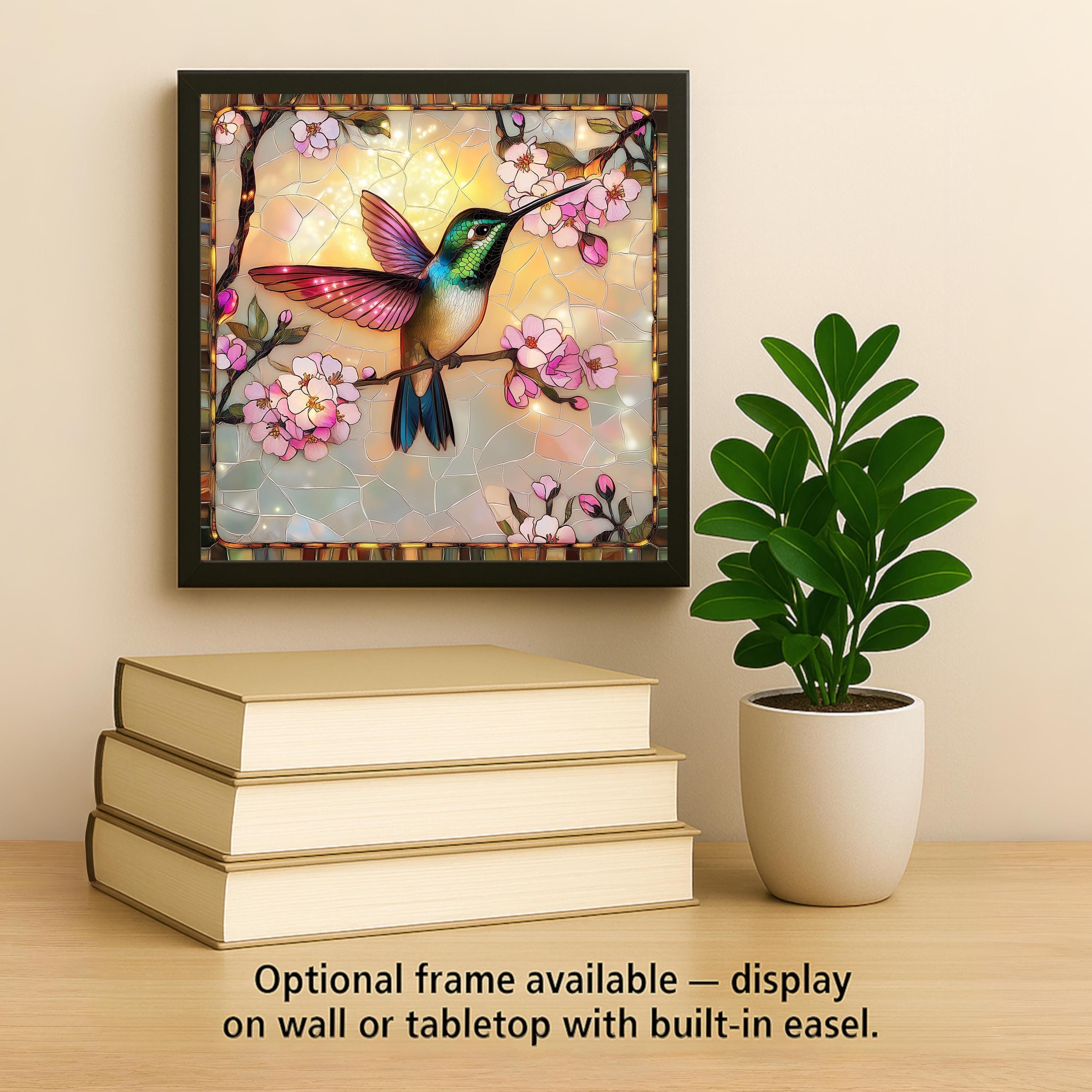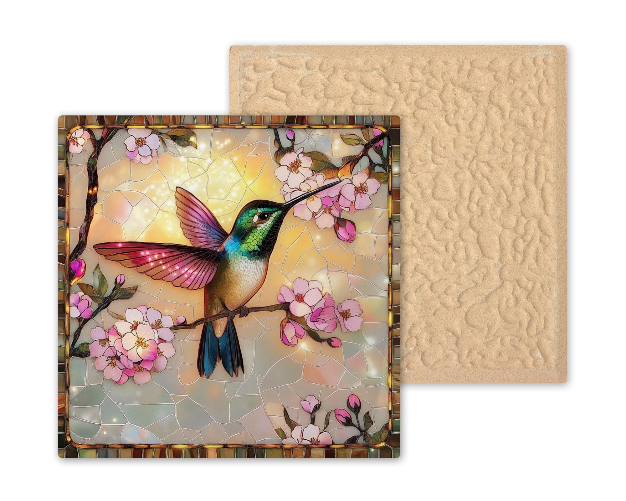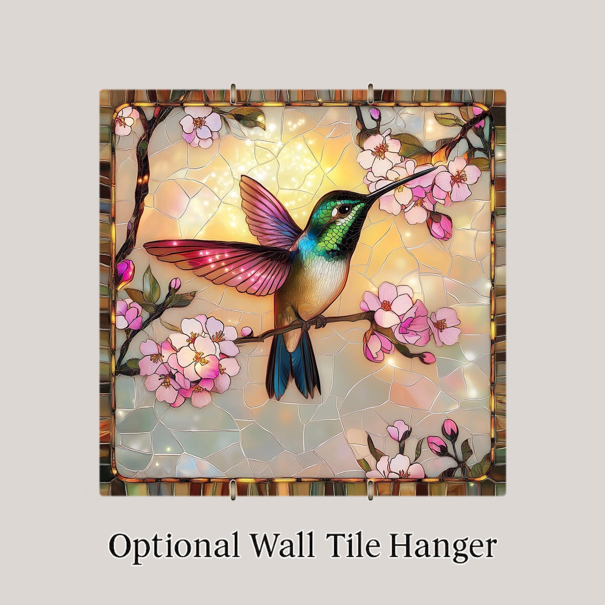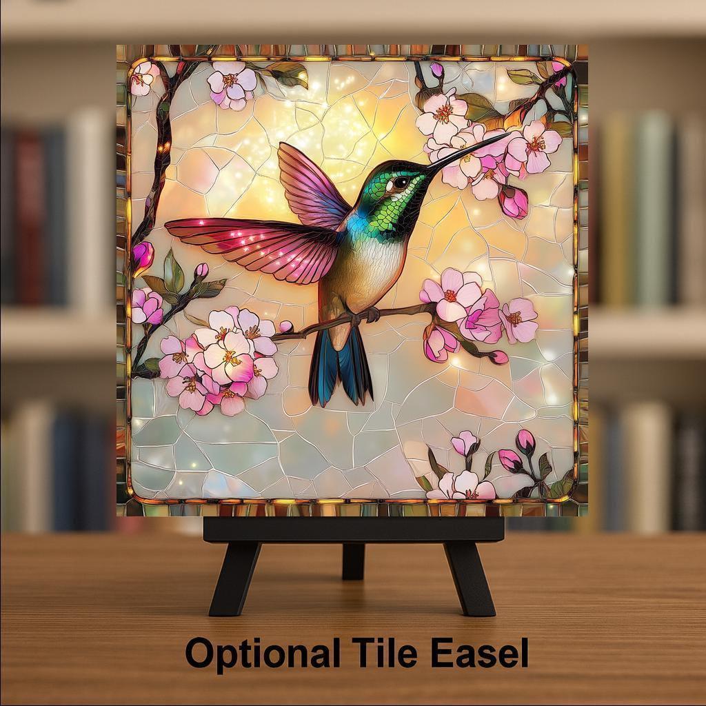 This stained glass-style hummingbird tile offers a radiant view of spring, with a rainbow-hued bird delicately sipping from soft pink blossoms. Intricate details and glowing pastel tones create a dreamy, sunlit effect—perfect for anyone who loves garden-inspired décor. The warm background feels like a golden sunrise, and the tile's cracked glass pattern adds vintage stained-glass texture to the design.