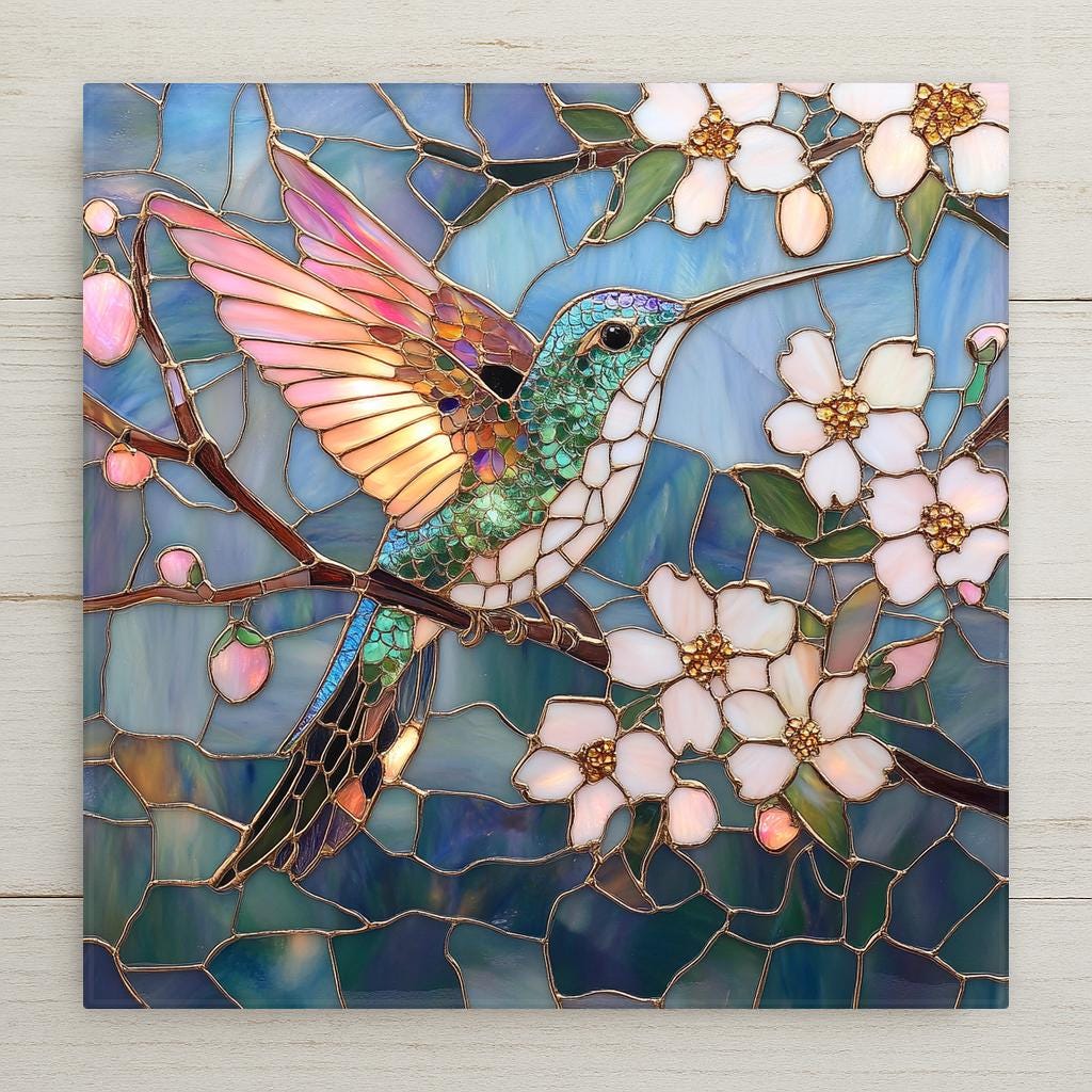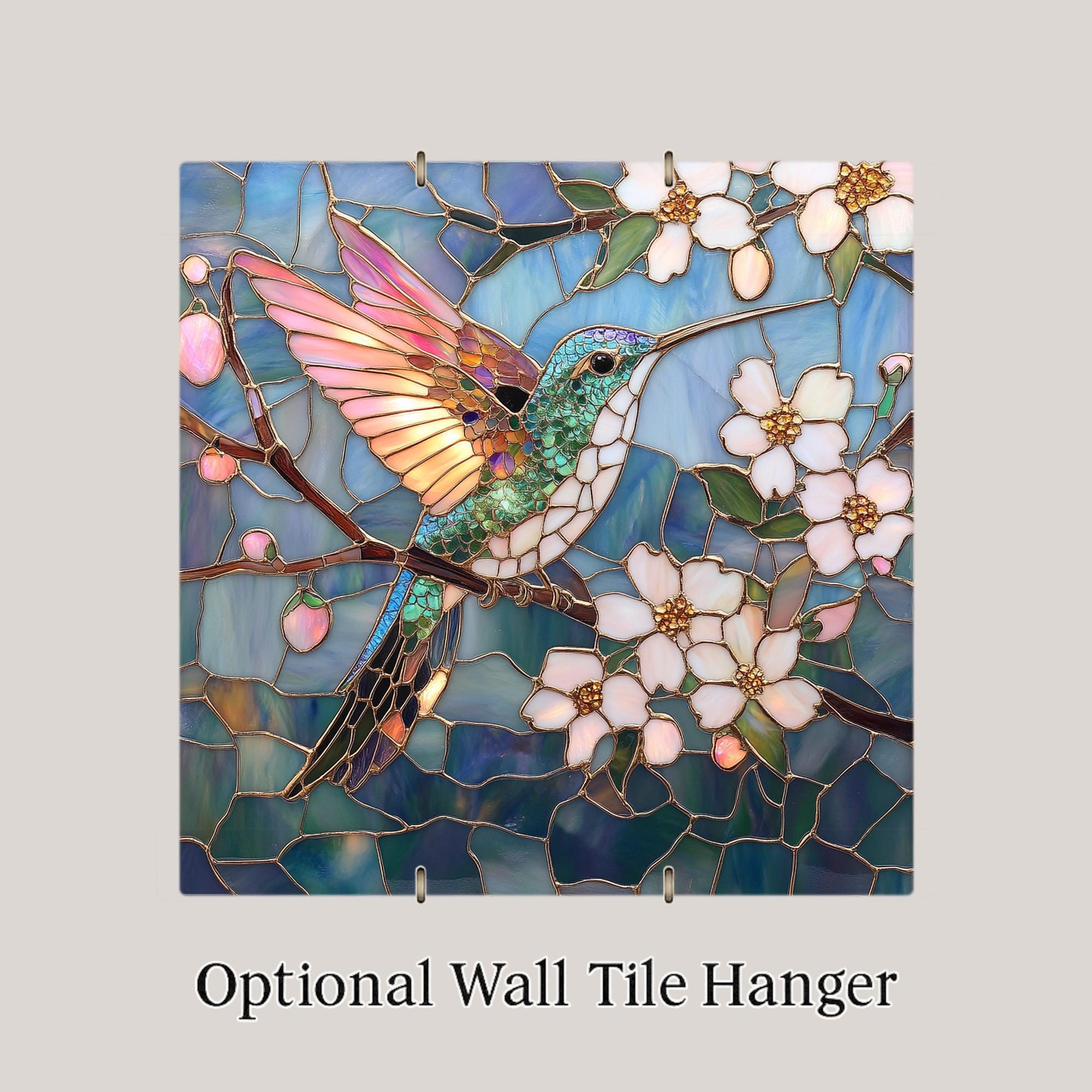 Celebrate the delicate beauty of hummingbirds with this elegant stained glass-style ceramic tile. A radiant hummingbird hovers mid-flight, surrounded by creamy white blossoms and accented by a soothing blue-toned background. The handcrafted artwork glows with a soft, luminous palette that suits both modern and vintage home décor styles.
