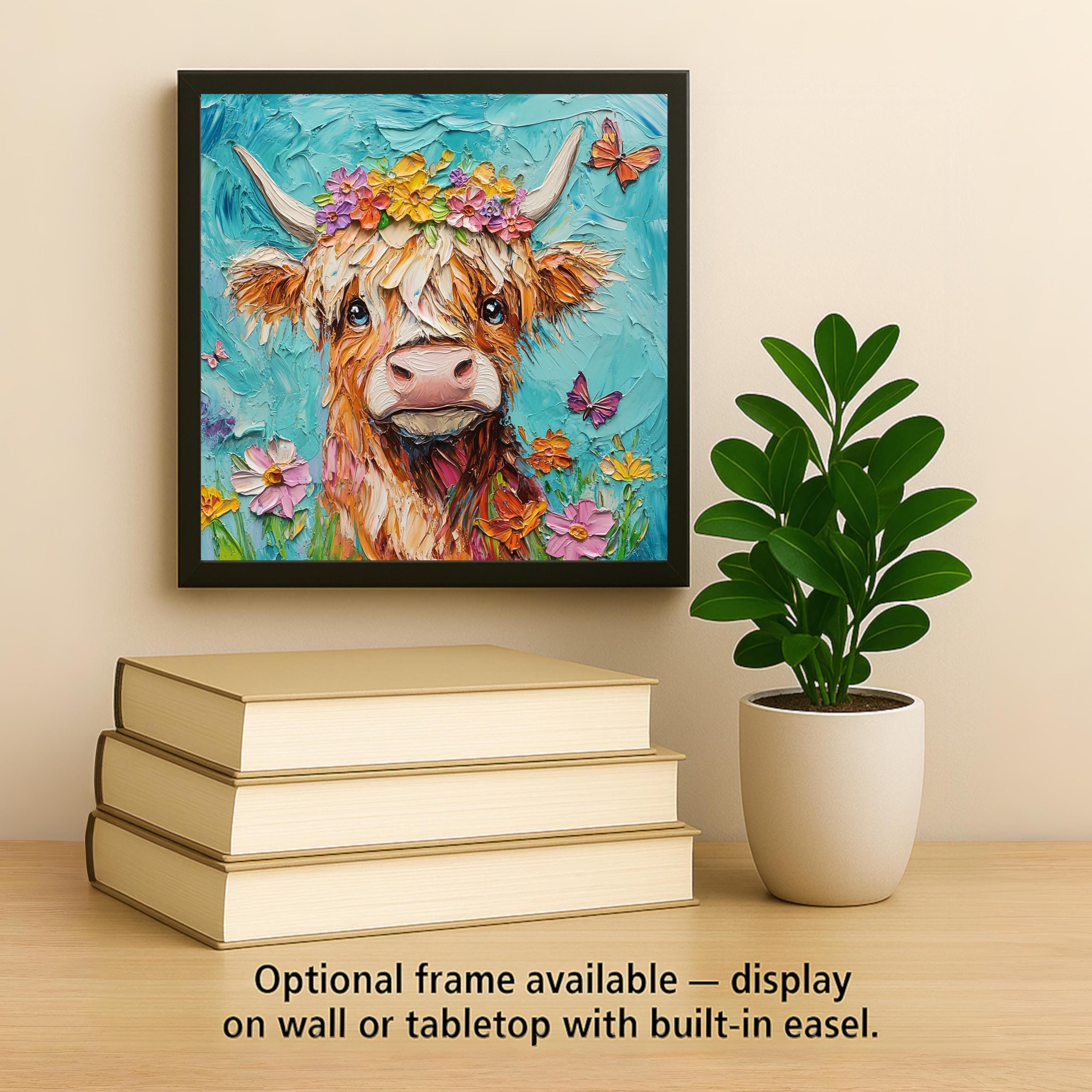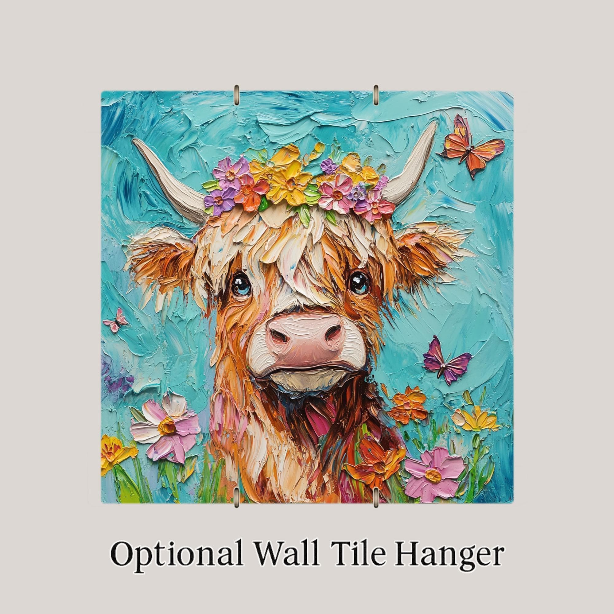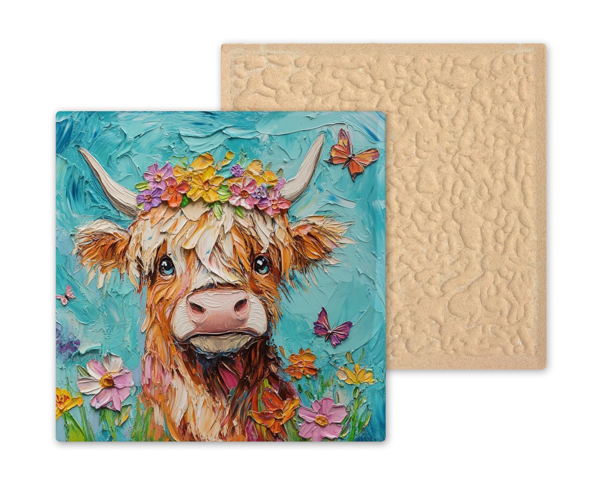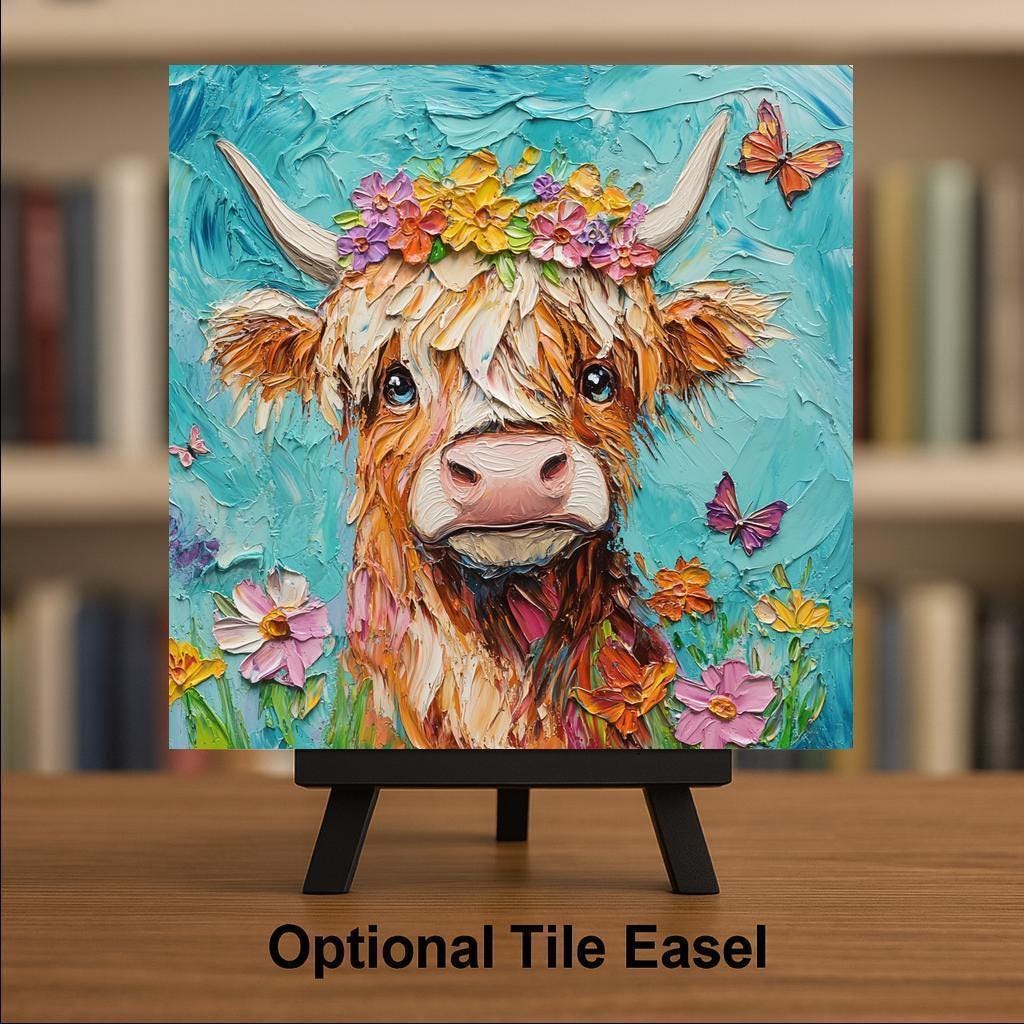 Celebrate rustic charm and farm life with this colorful Highland cow ceramic tile. Featuring a sweet cow adorned with a floral crown, this design blends cozy countryside vibes with bright, cheerful colors. The flower accents add a touch of whimsy, while the soft texture of the cow’s fur and detailed brushwork make this tile feel rich and handcrafted.