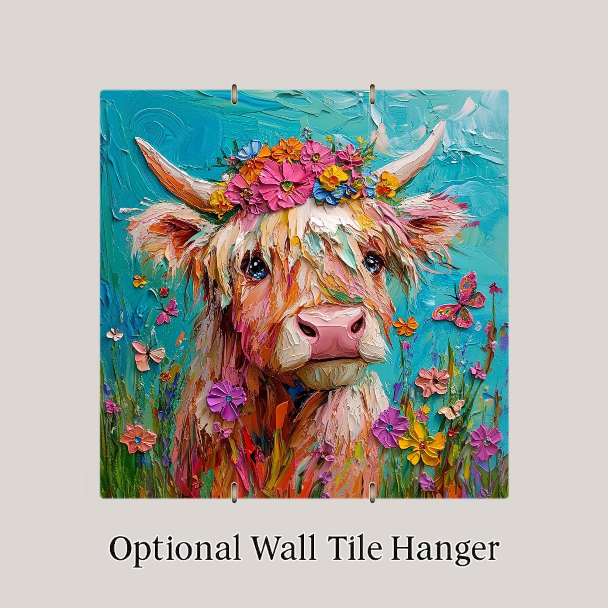 Add some joy to your farmhouse decor with this vibrant Highland cow ceramic tile. This playful piece features a colorful cow wearing a flower crown, surrounded by wildflowers and butterflies. The thick brushstrokes and bold palette knife textures give it a three-dimensional look, like a painting that jumps off the wall. It’s an uplifting and artistic design that’s perfect for any room that needs a cheerful touch.