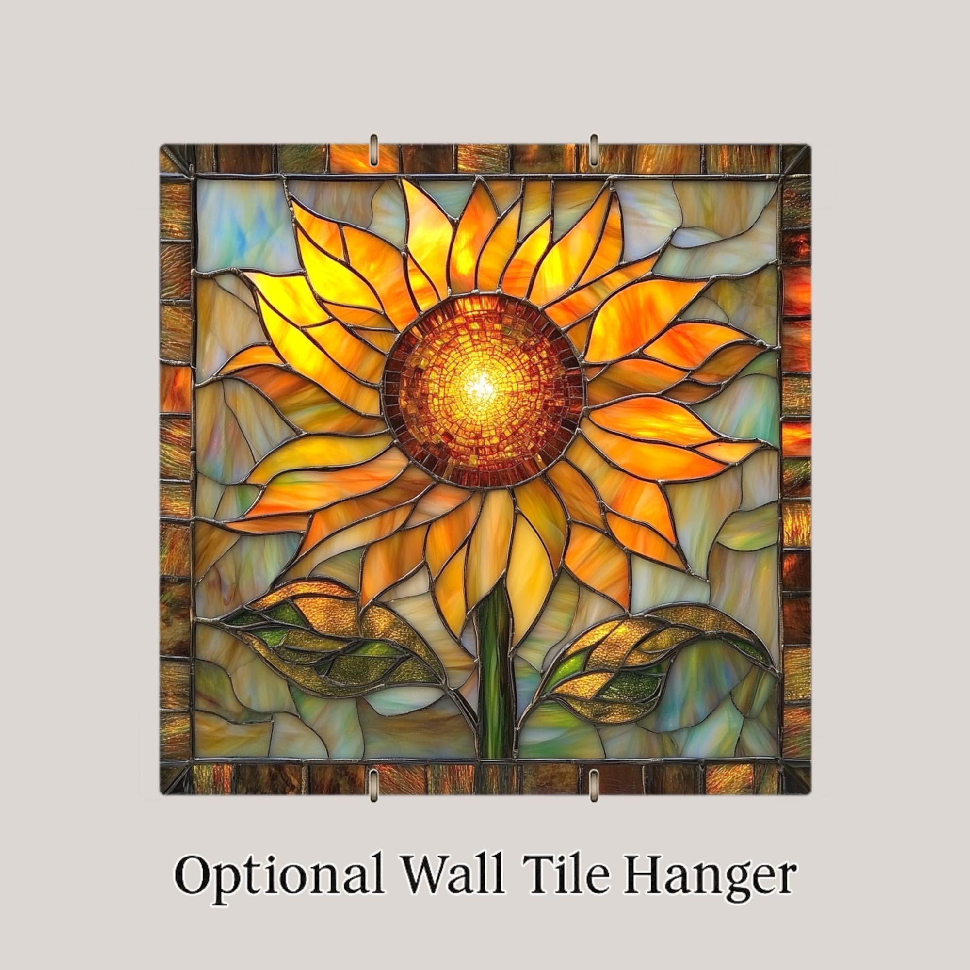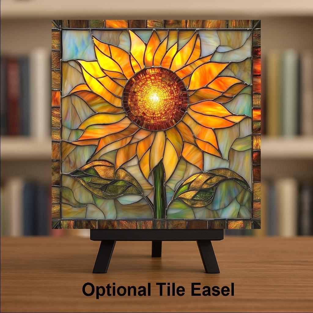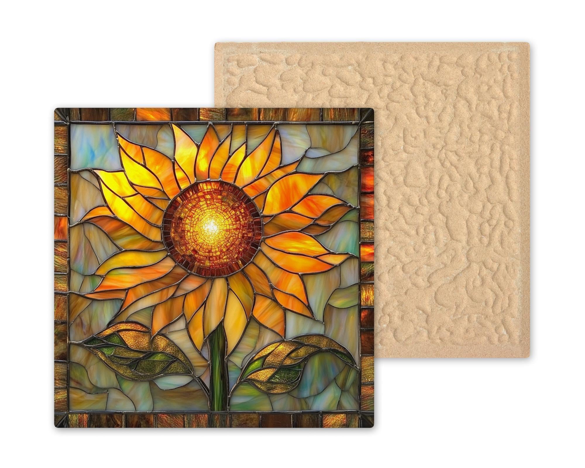 Add sunshine to your space with this radiant sunflower ceramic tile art. Designed in a stunning stained glass style, this piece features glowing amber petals, bold green leaves, and a luminous mosaic center that captures the joyful essence of summer. The sunflower’s dynamic, layered design makes this tile feel alive with warmth and energy, perfect for welcoming brightness into your home all year long.