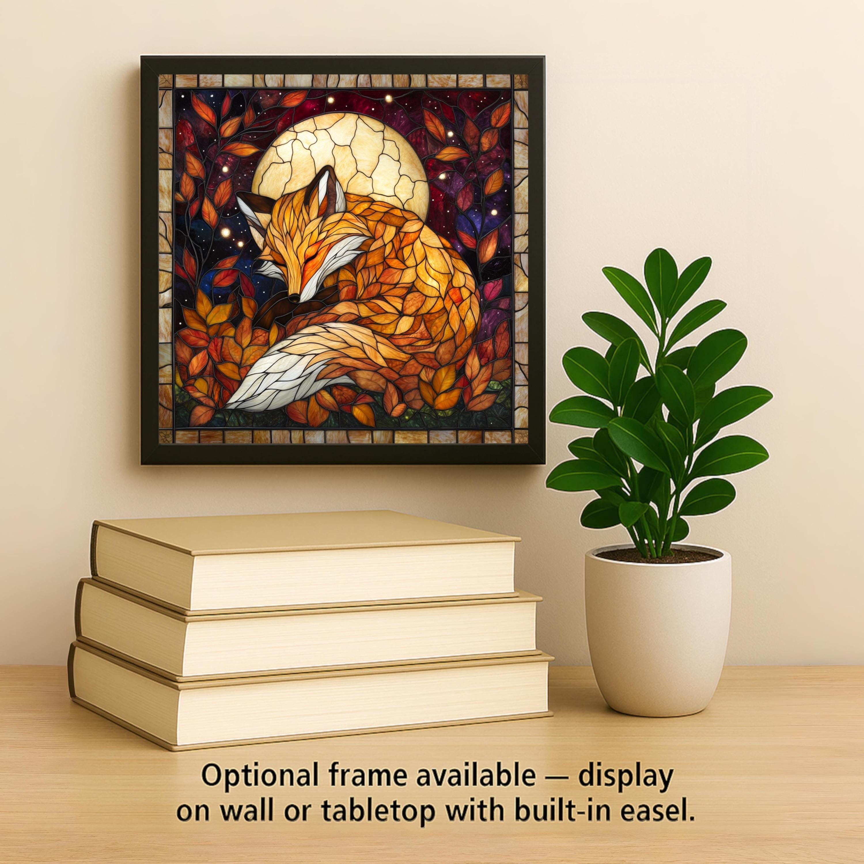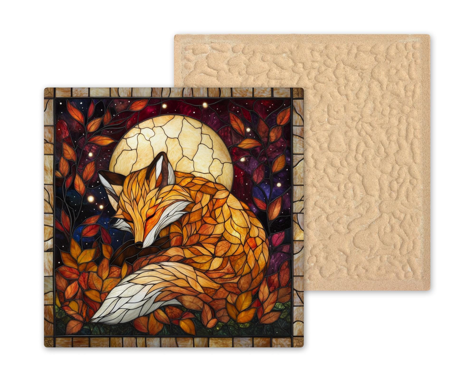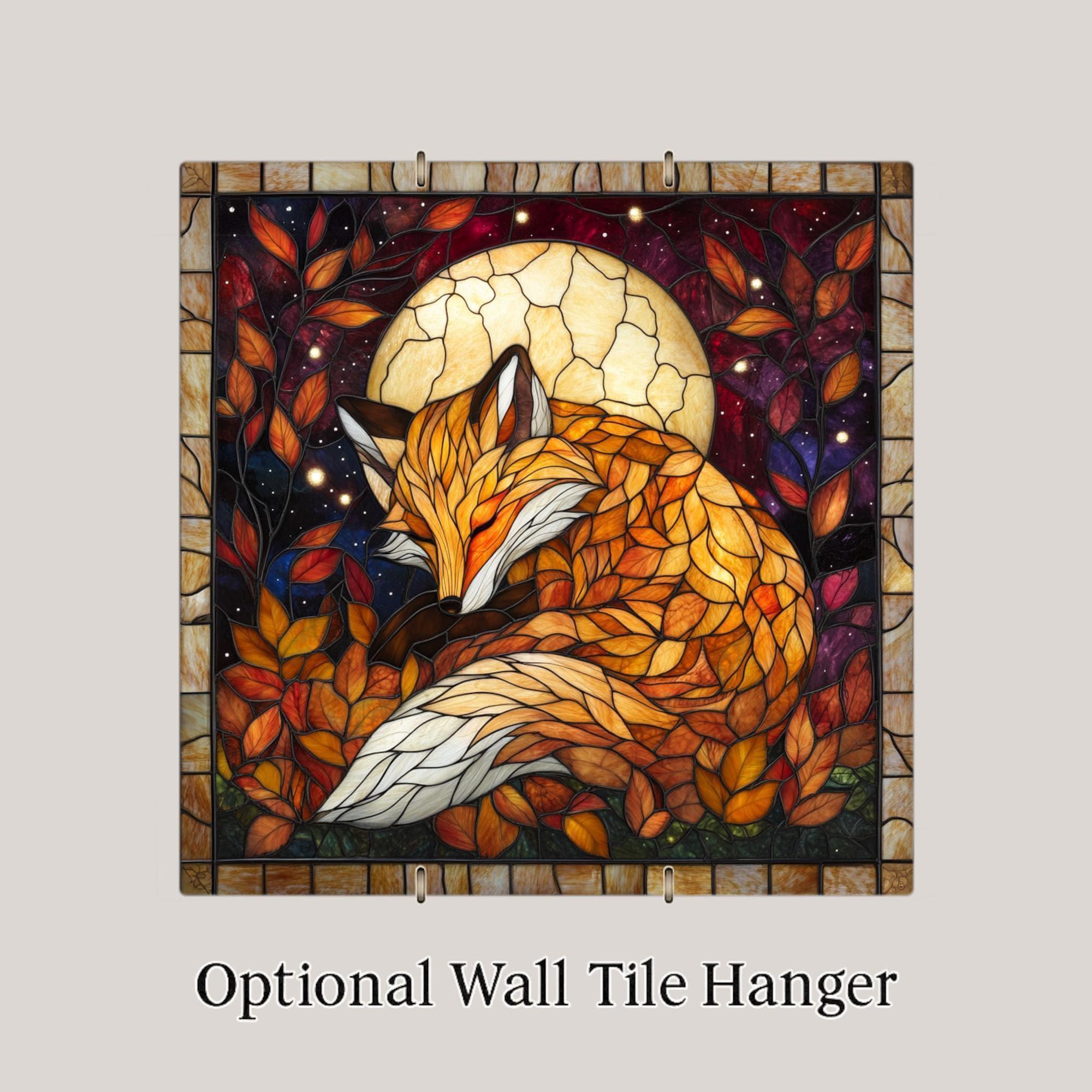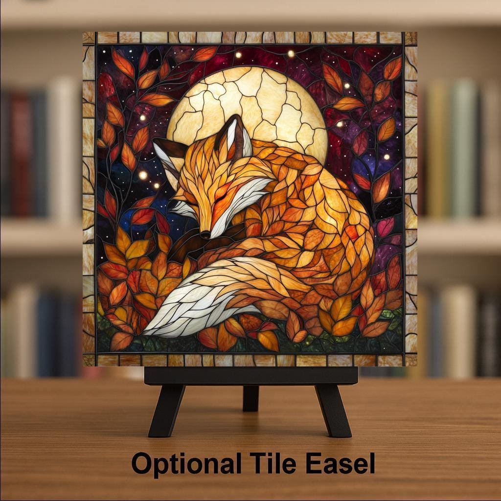 Bring a touch of forest magic into your home with this stained glass-style fox ceramic tile. A peaceful fox curls up beneath a glowing moon, surrounded by autumn leaves and a night sky filled with stars. This richly colored scene is designed to look like stained glass, with warm tones of orange, gold, and crimson that glow like firelight on a fall evening.
