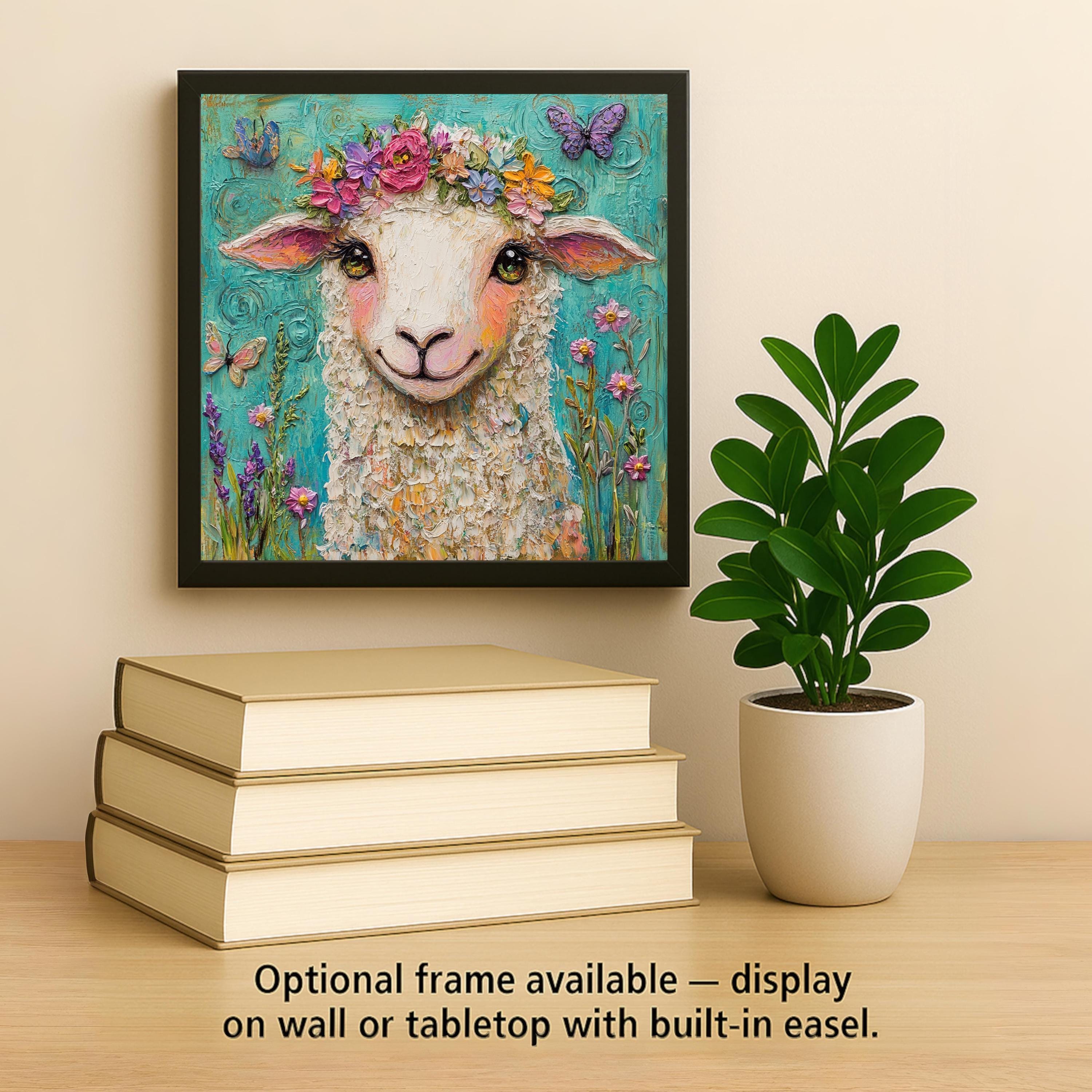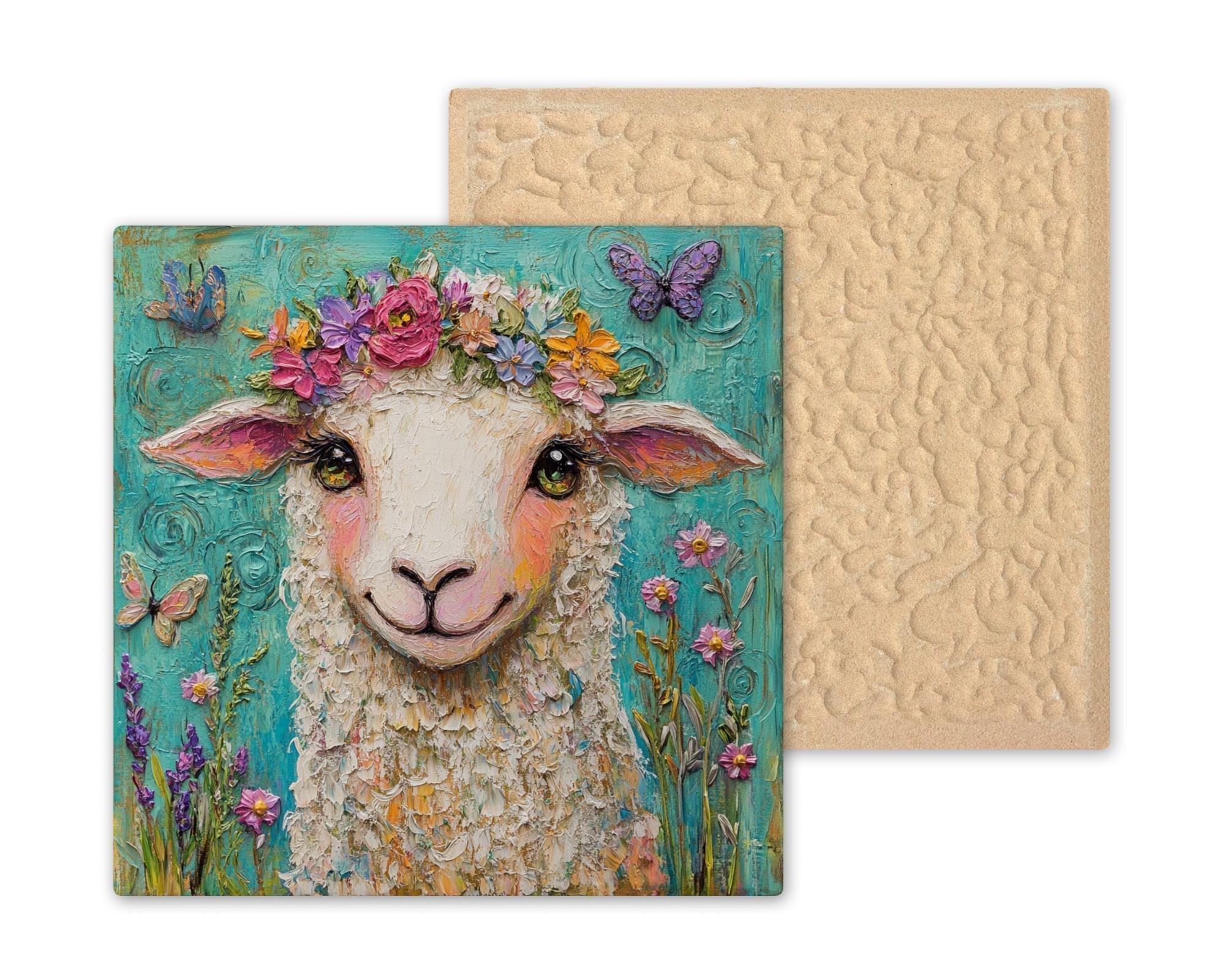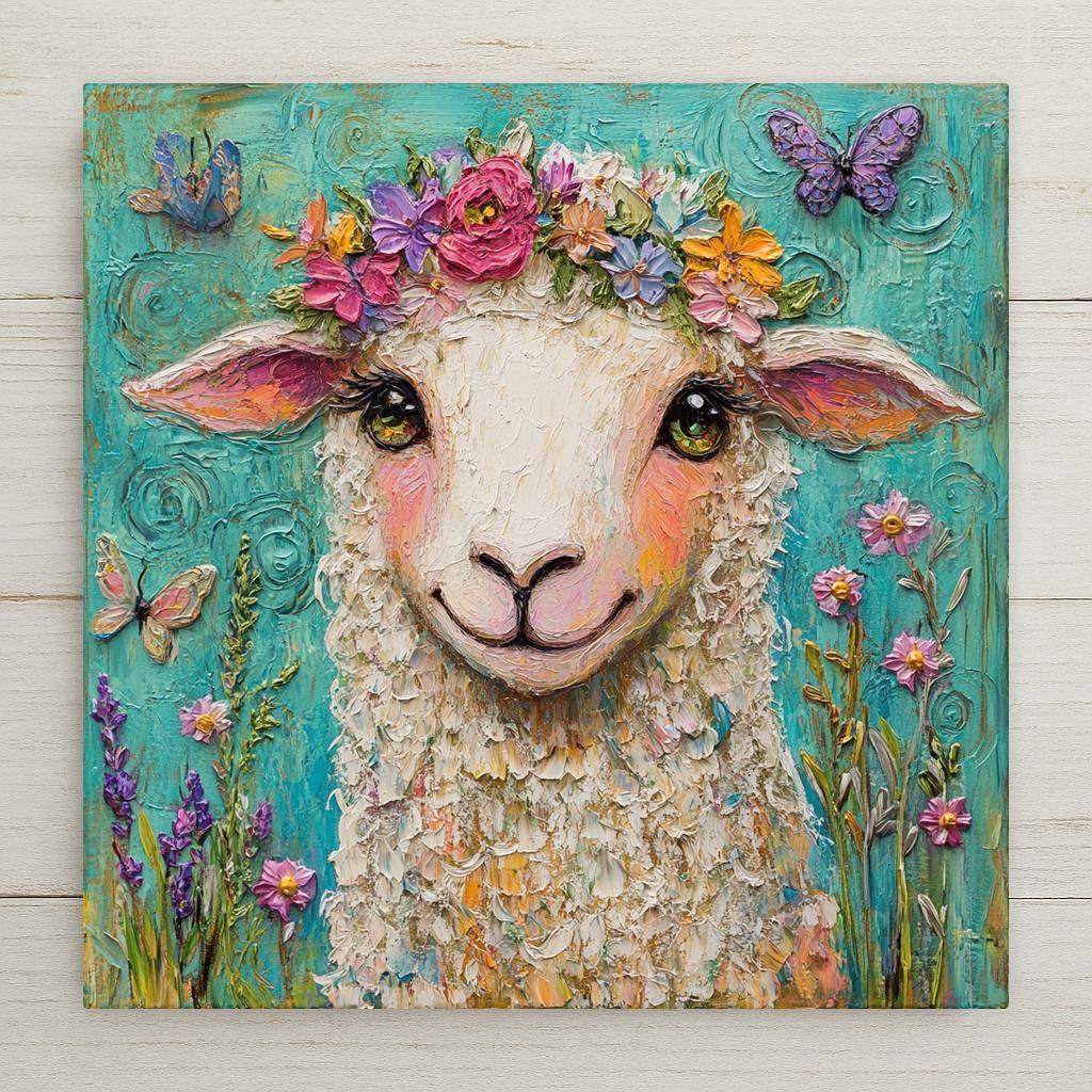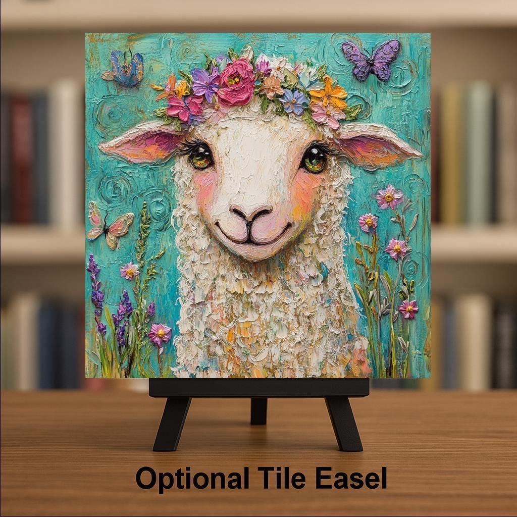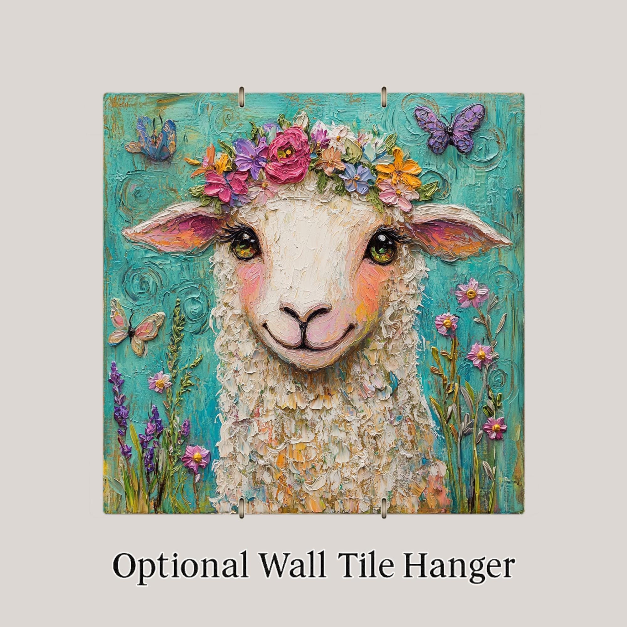 Celebrate springtime with this whimsical sheep ceramic tile, featuring a curly-haired lamb with a bright floral crown and butterflies fluttering around. This delightful piece of art captures the joyful spirit of the season and brings a heartwarming, cottagecore touch to your home decor.
