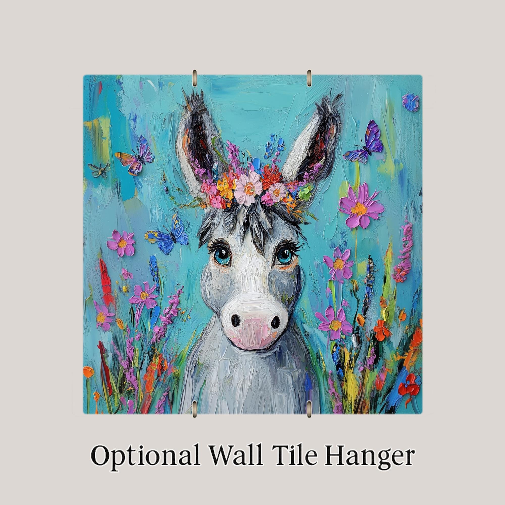 Add a burst of happiness to your country home with this whimsical floral donkey ceramic tile. This delightful farm animal artwork features a friendly donkey with big blue eyes and a crown of wildflowers, surrounded by fluttering butterflies and a sea of colorful blooms. With its pastel palette and playful style, it's the perfect mix of cottagecore charm and farmhouse flair.