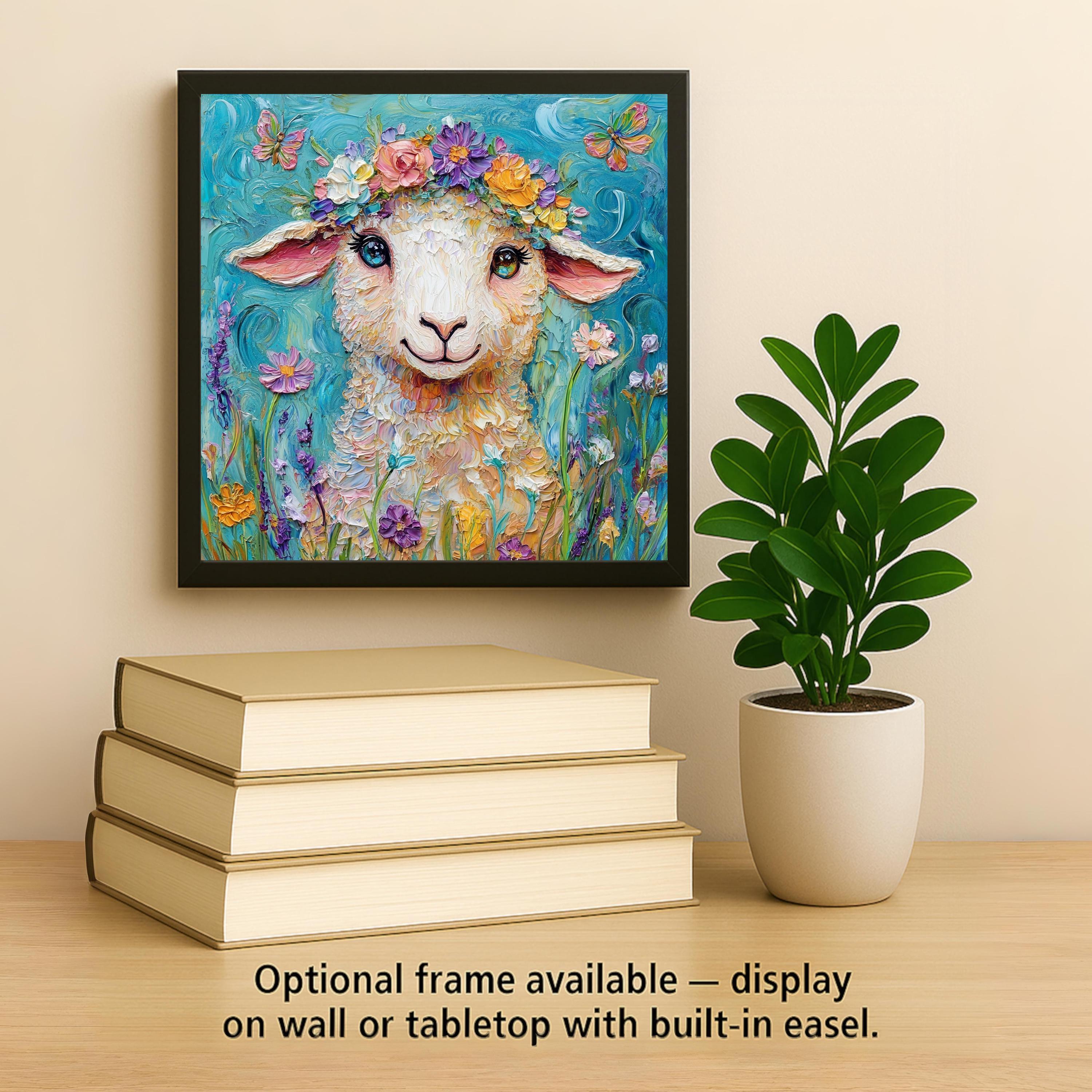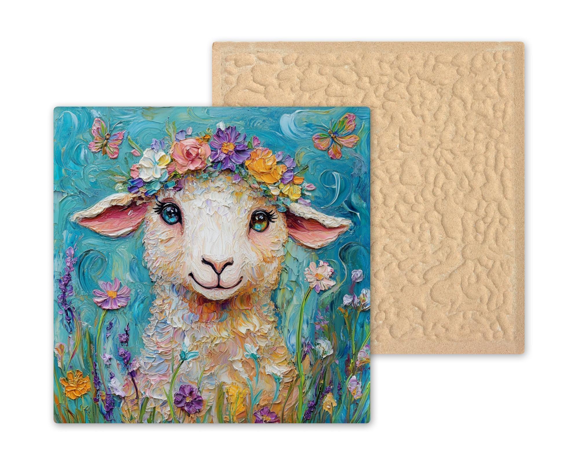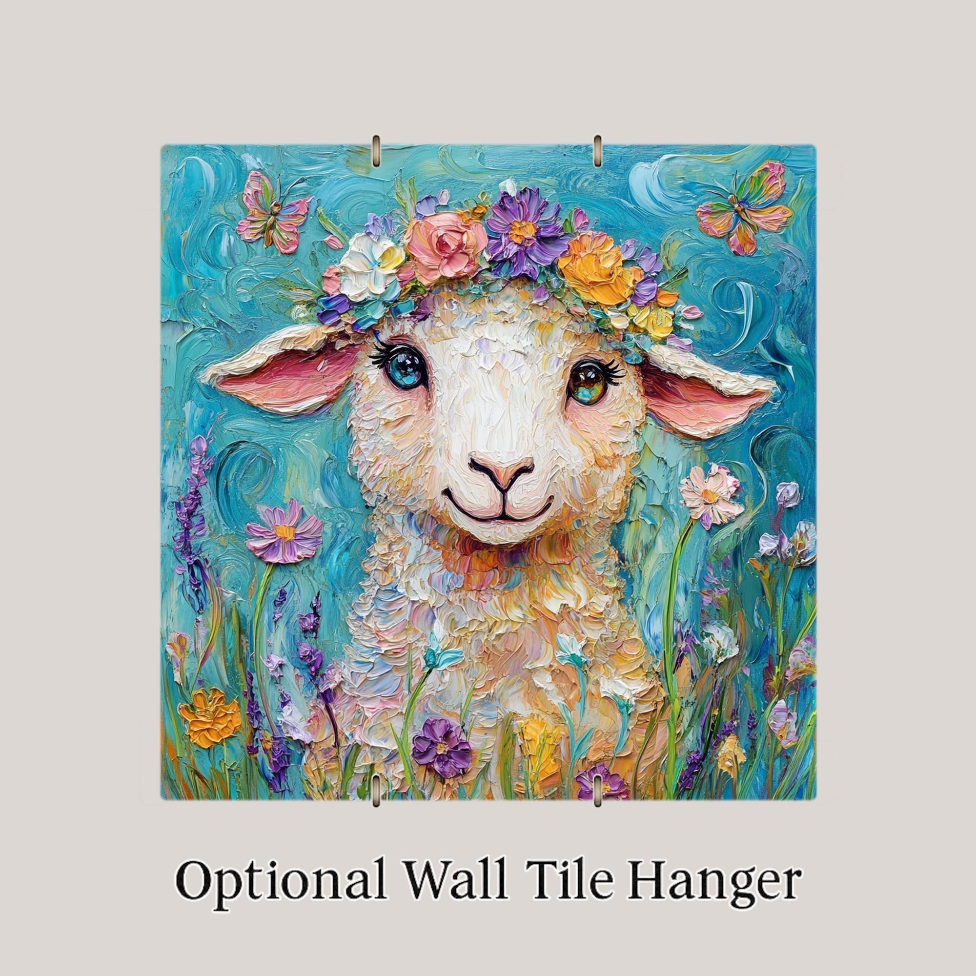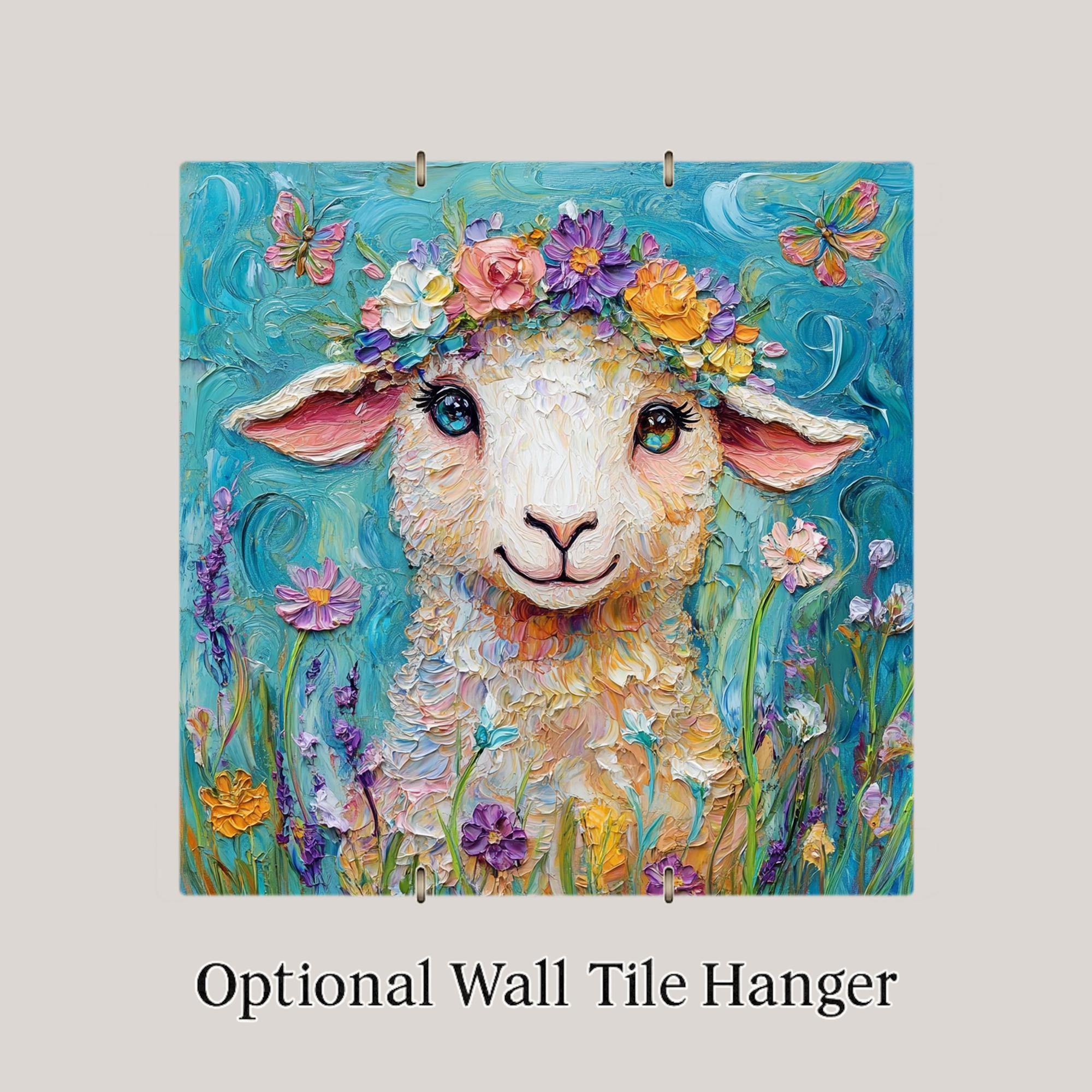 This ceramic lamb wall art tile is full of whimsy and springtime happiness! A smiling lamb with a crown of pastel and bright flowers gazes sweetly out from a field of blossoms, with textured strokes and painterly swirls adding rich detail to every petal and curl of fleece. The design evokes a storybook feeling, perfect for nursery walls, playrooms, or anyone who loves joyful farm animals.