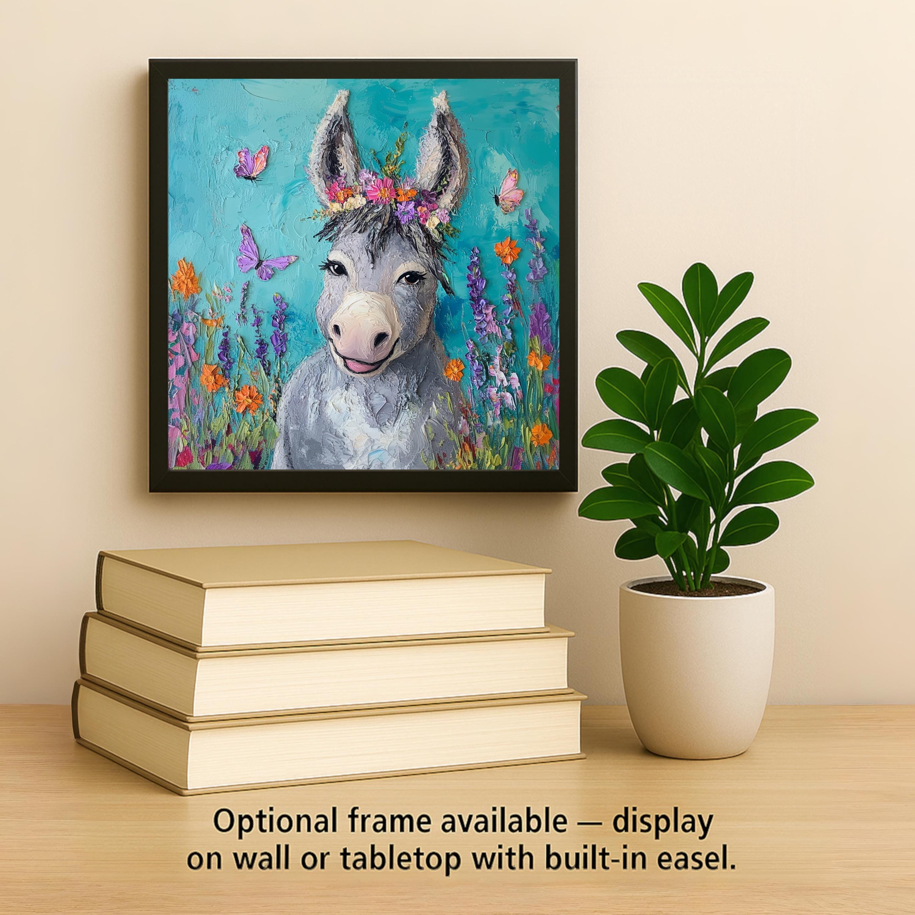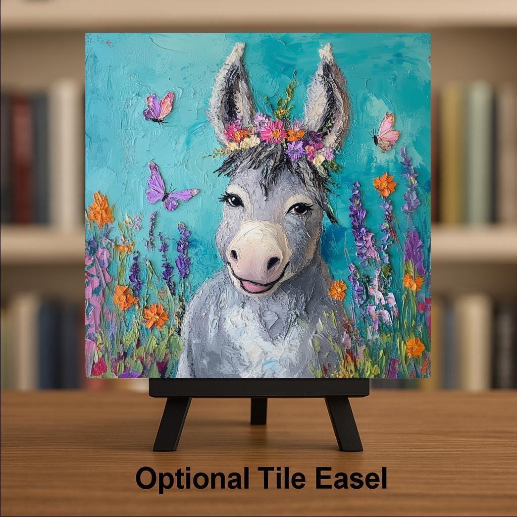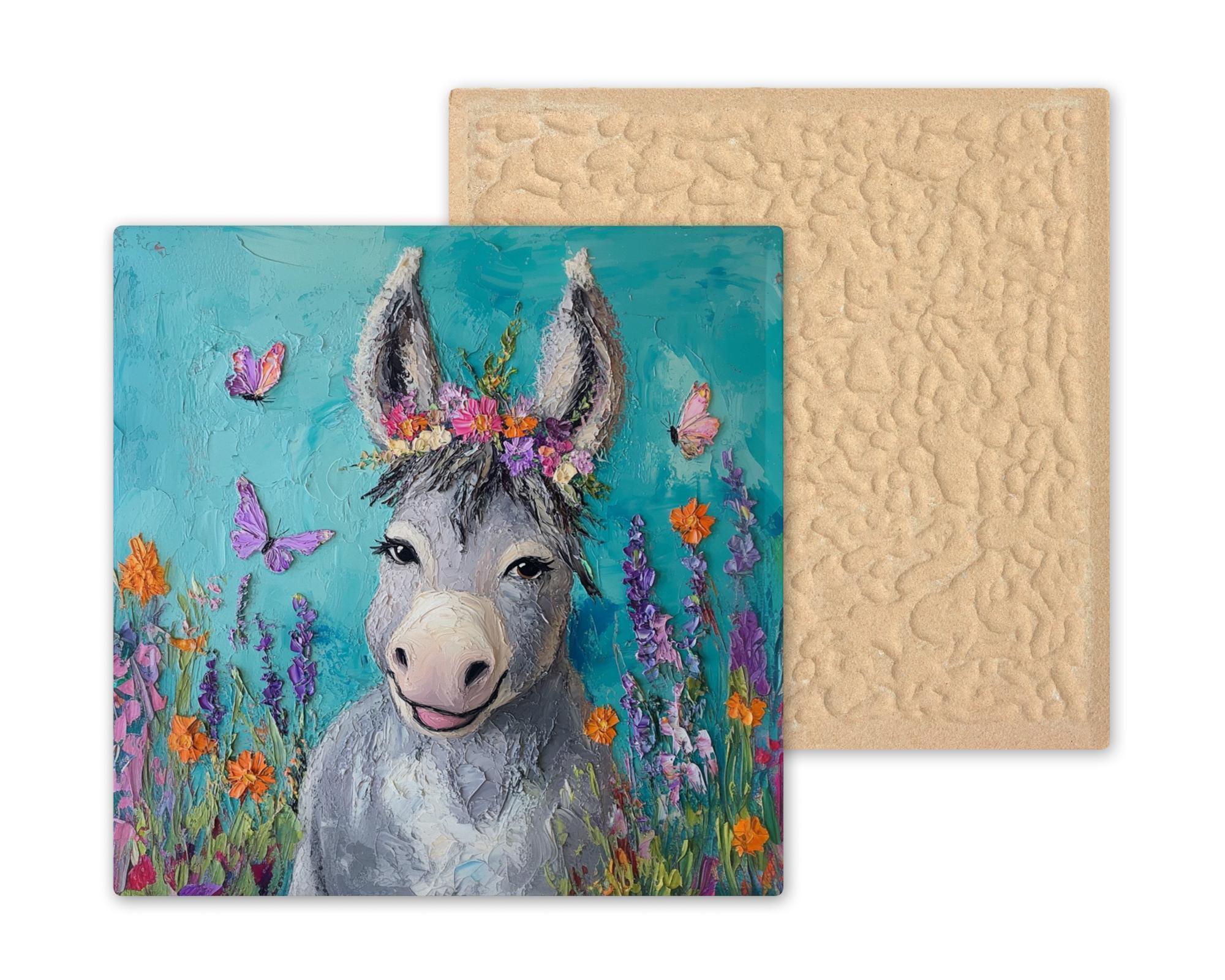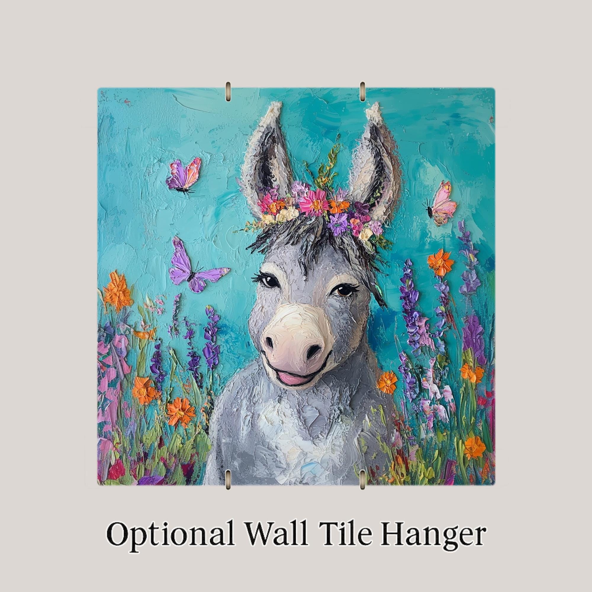 The artwork captures the personality of a sweet donkey with expressive eyes, soft texture, and bright spring blooms. Set against a vivid teal background, it brings a splash of color that feels both playful and serene. Every detail of this ceramic tile is designed to delight nature lovers and fans of farmhouse decor.