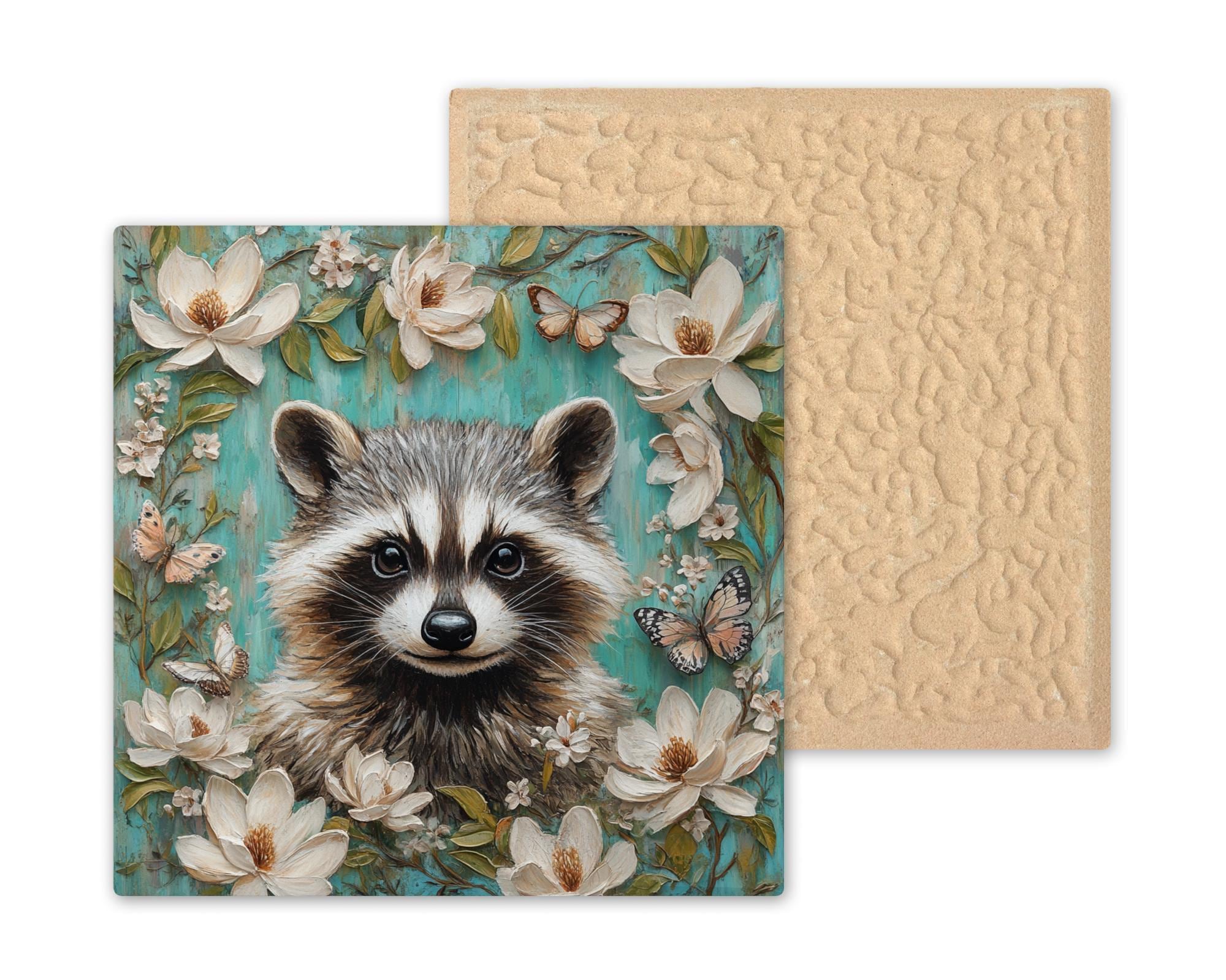 This playful Whimsical Raccoon Ceramic Tile brings together floral elegance and forest fun. The central raccoon, framed by soft magnolia blossoms and fluttering butterflies, radiates curiosity and charm against a richly textured teal background. With its stained glass-inspired look, this tile creates a striking and imaginative accent for any nature-inspired decor.