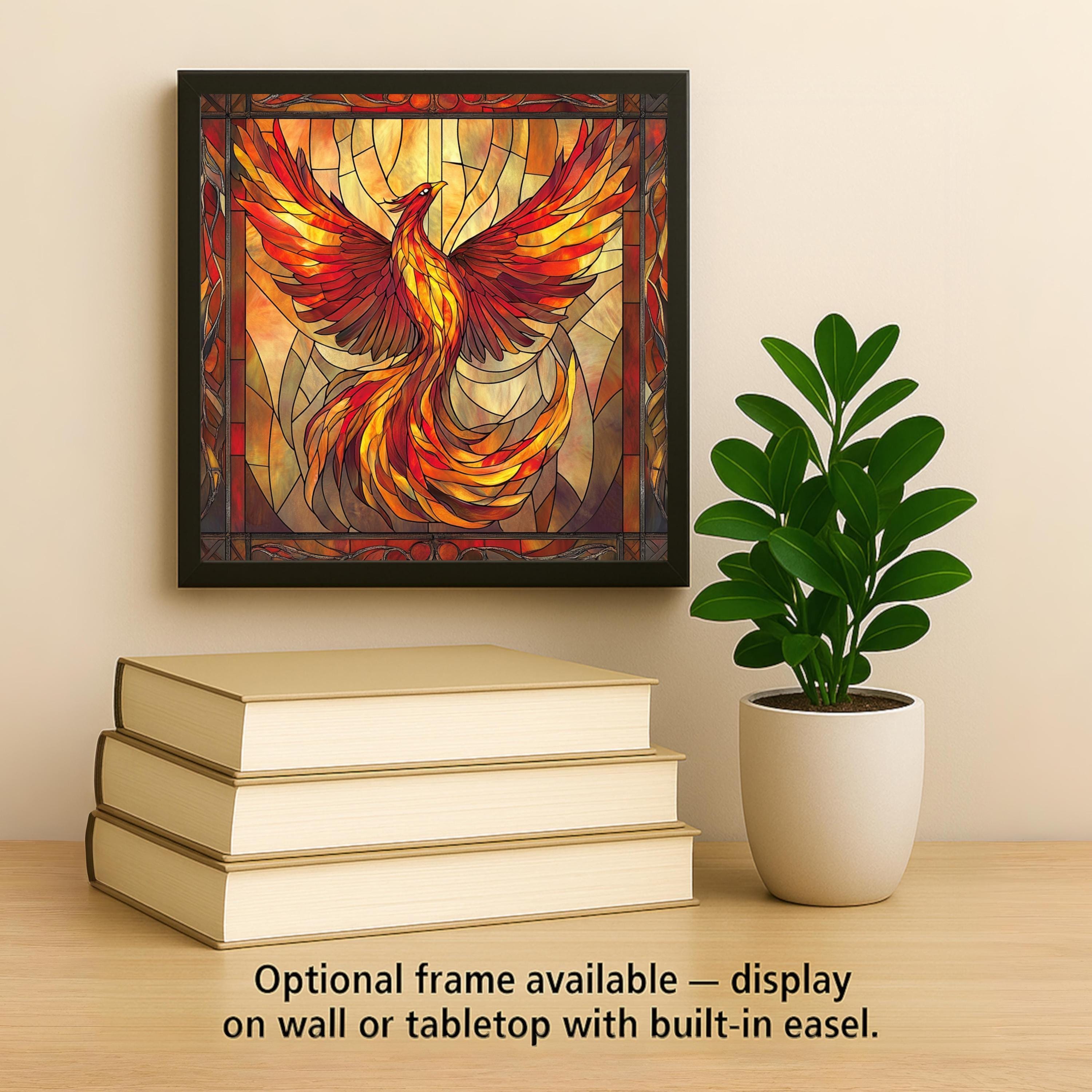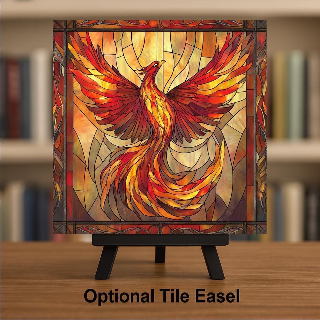 Celebrate strength and rebirth with this Phoenix Rising ceramic tile, designed in a breathtaking stained glass style. The mythical phoenix is captured mid-flight, its wings unfurling in vibrant flames of red, orange, and gold. This artwork brings a fiery elegance to any room and serves as a powerful symbol of overcoming adversity and beginning anew.
