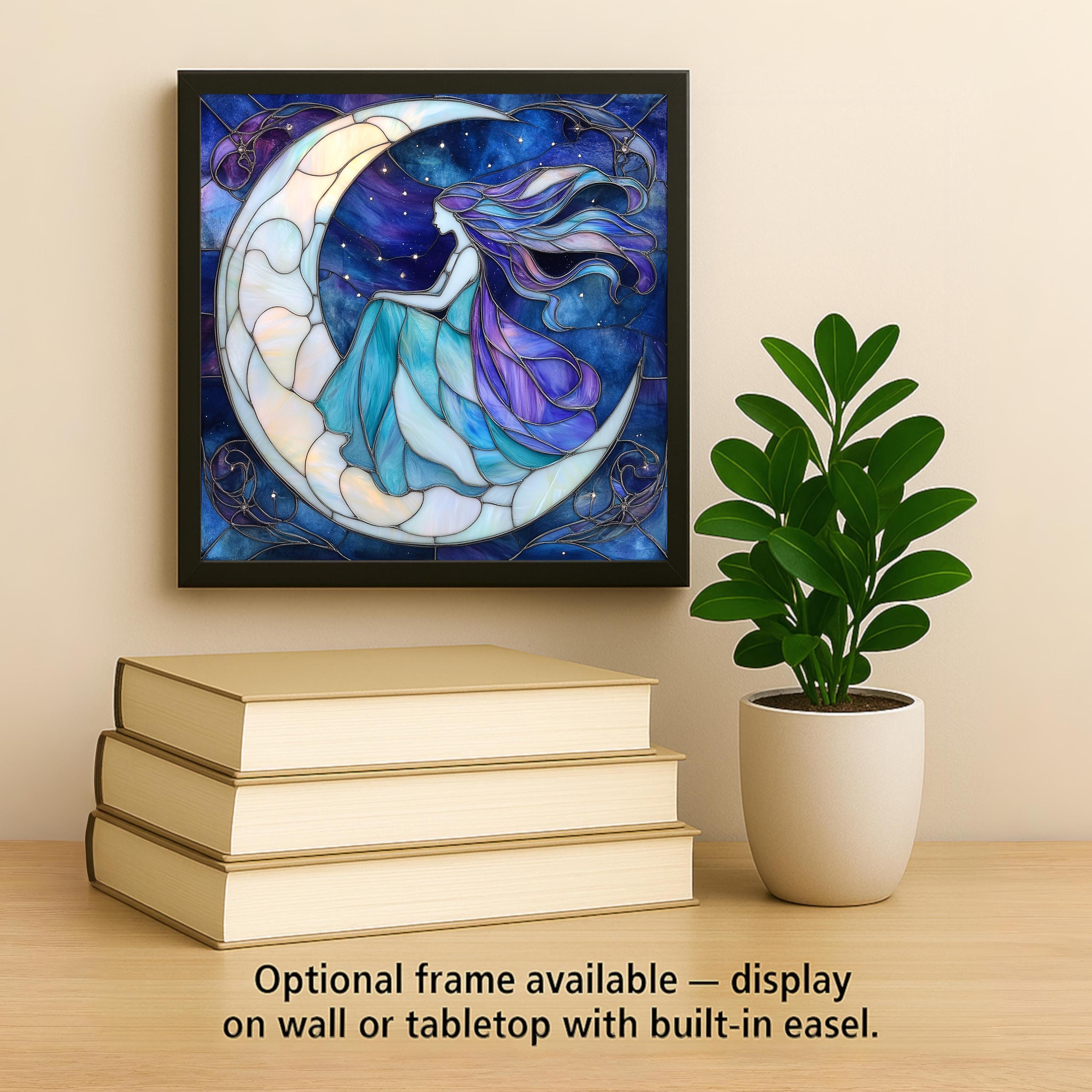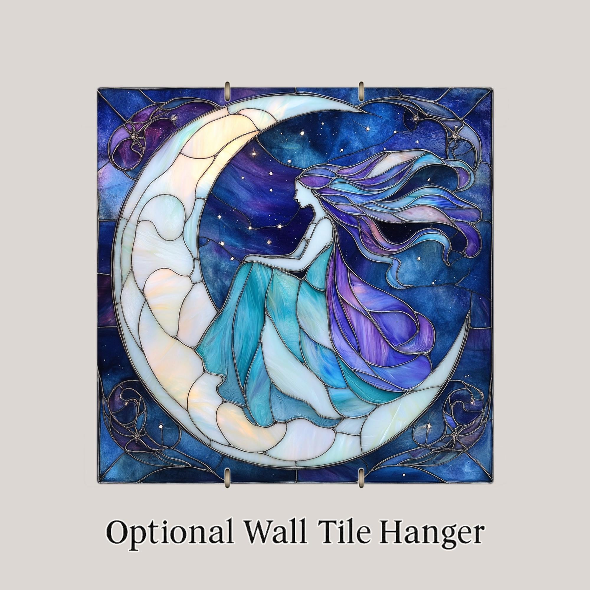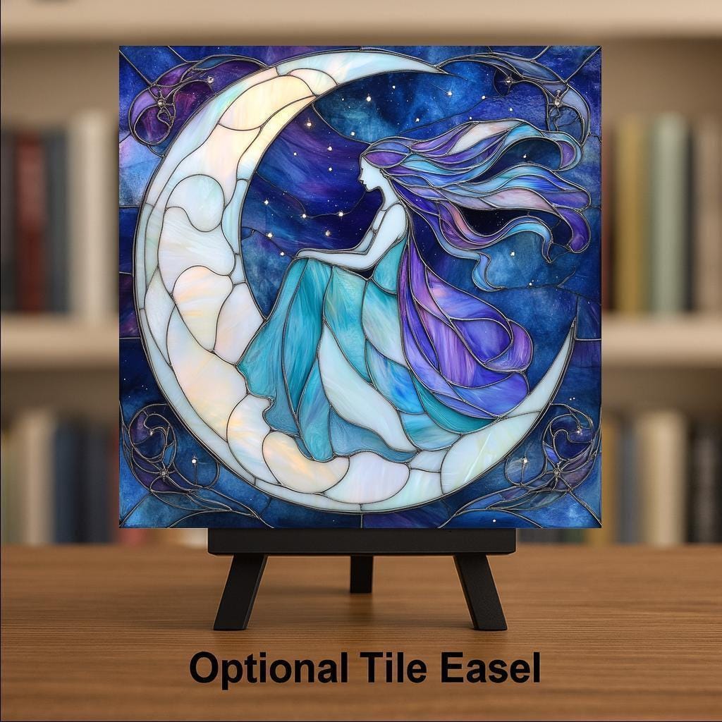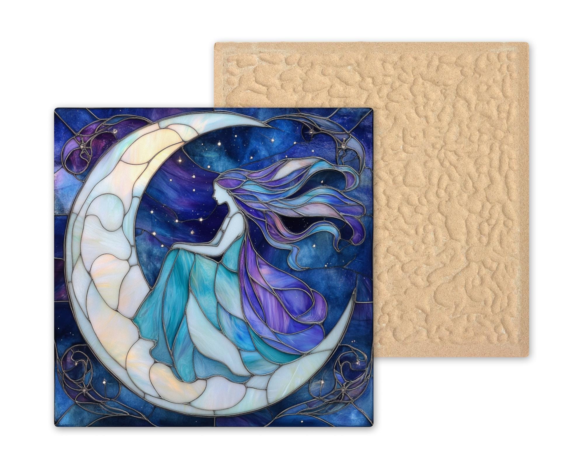 This moon goddess ceramic tile was designed for the buyer who already knows exactly what they want — lunar imagery, divine feminine energy, and a piece that feels sacred rather than decorative. The stained glass treatment gives the moon goddess a quality that canvas prints and posters cannot match: the jewel-toned depth looks different in morning light than in candlelight, which makes it feel alive in a way flat art does not.