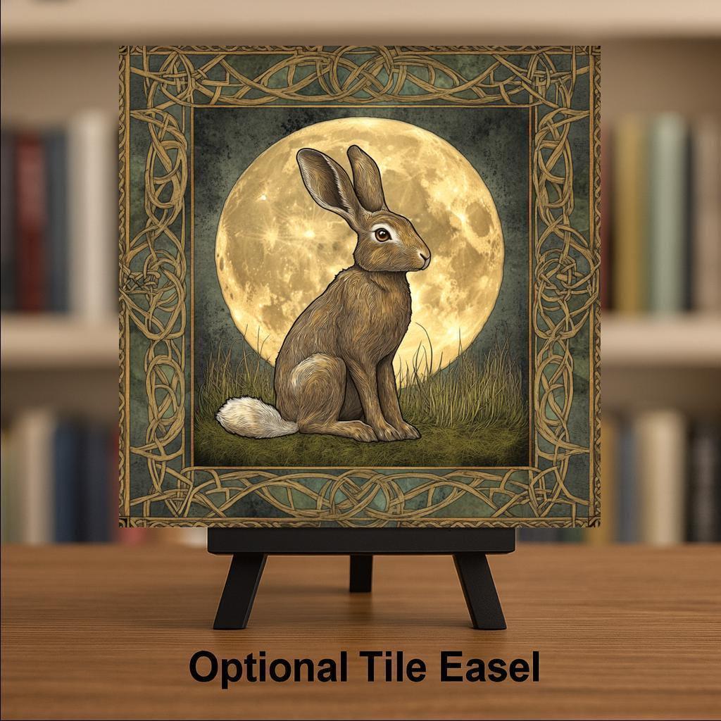 Optional display accessories include a tile wall hanger for hanging artfully on the wall, an easel tile stand for upright display, and cork backing for secure placement on surfaces. However you choose to show it, this Celtic hare tile creates a peaceful focal point filled with ancient charm and lunar beauty.