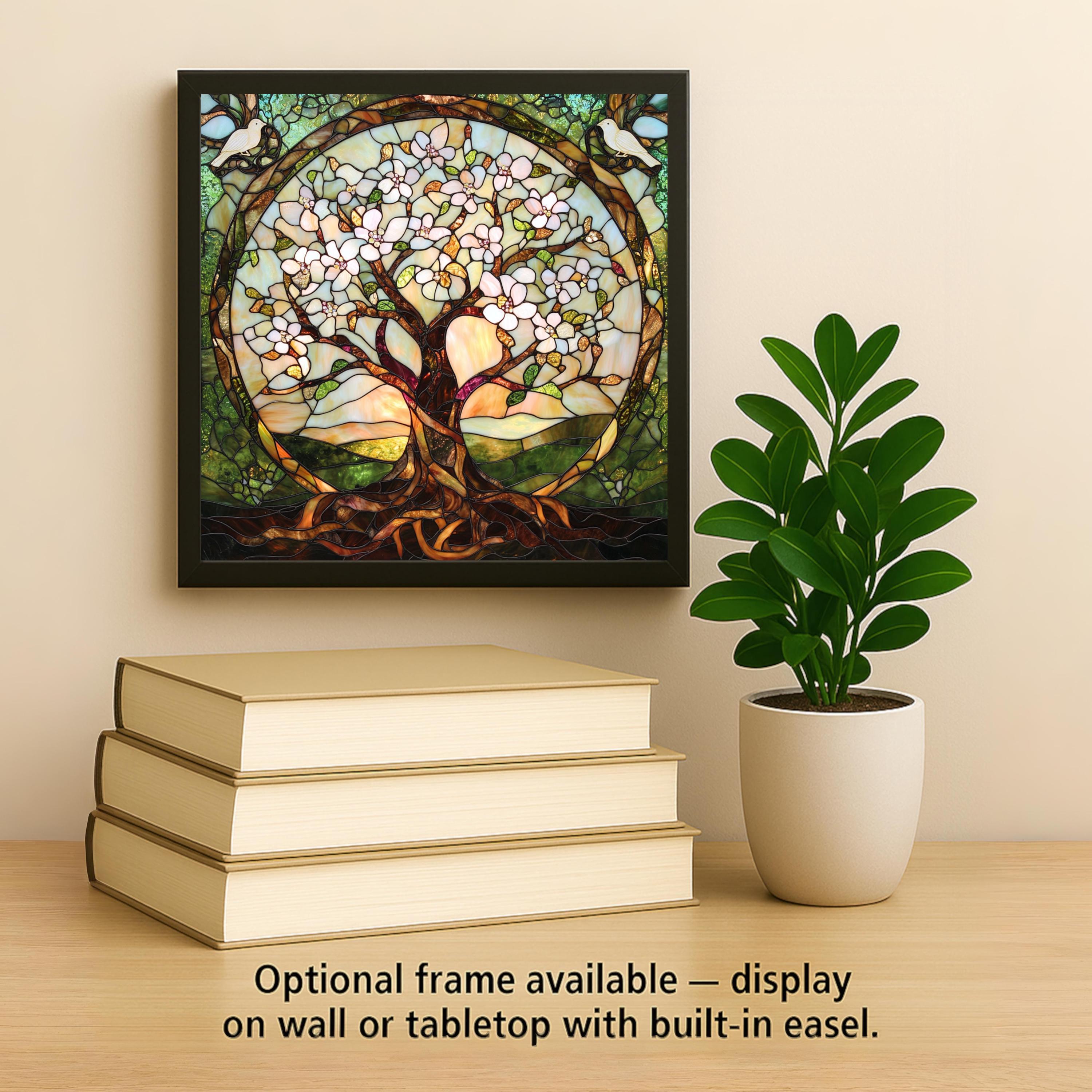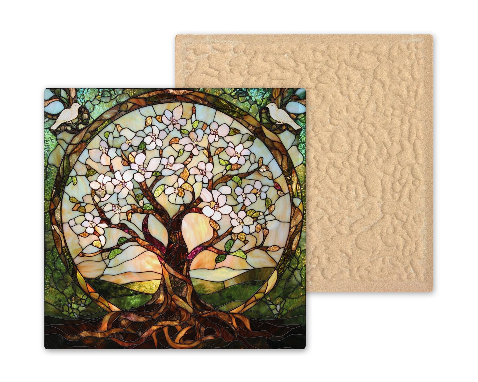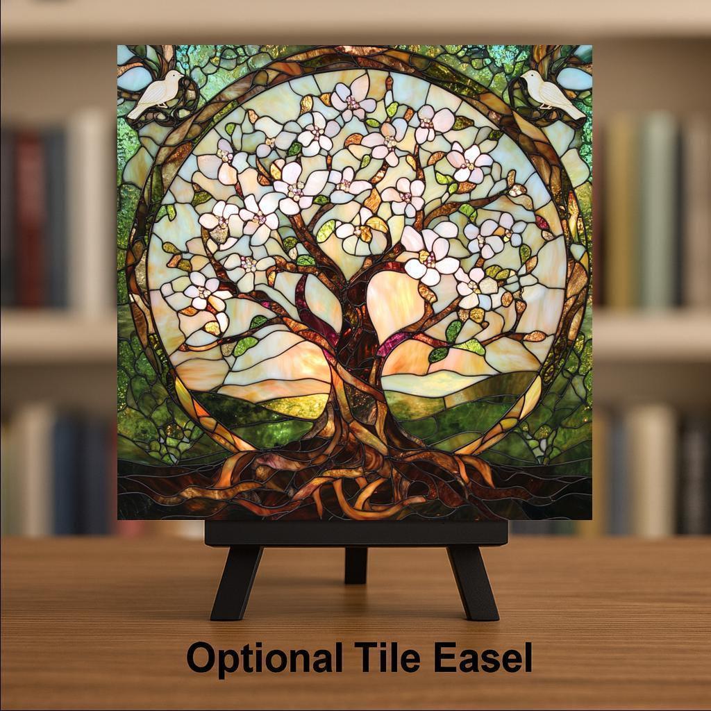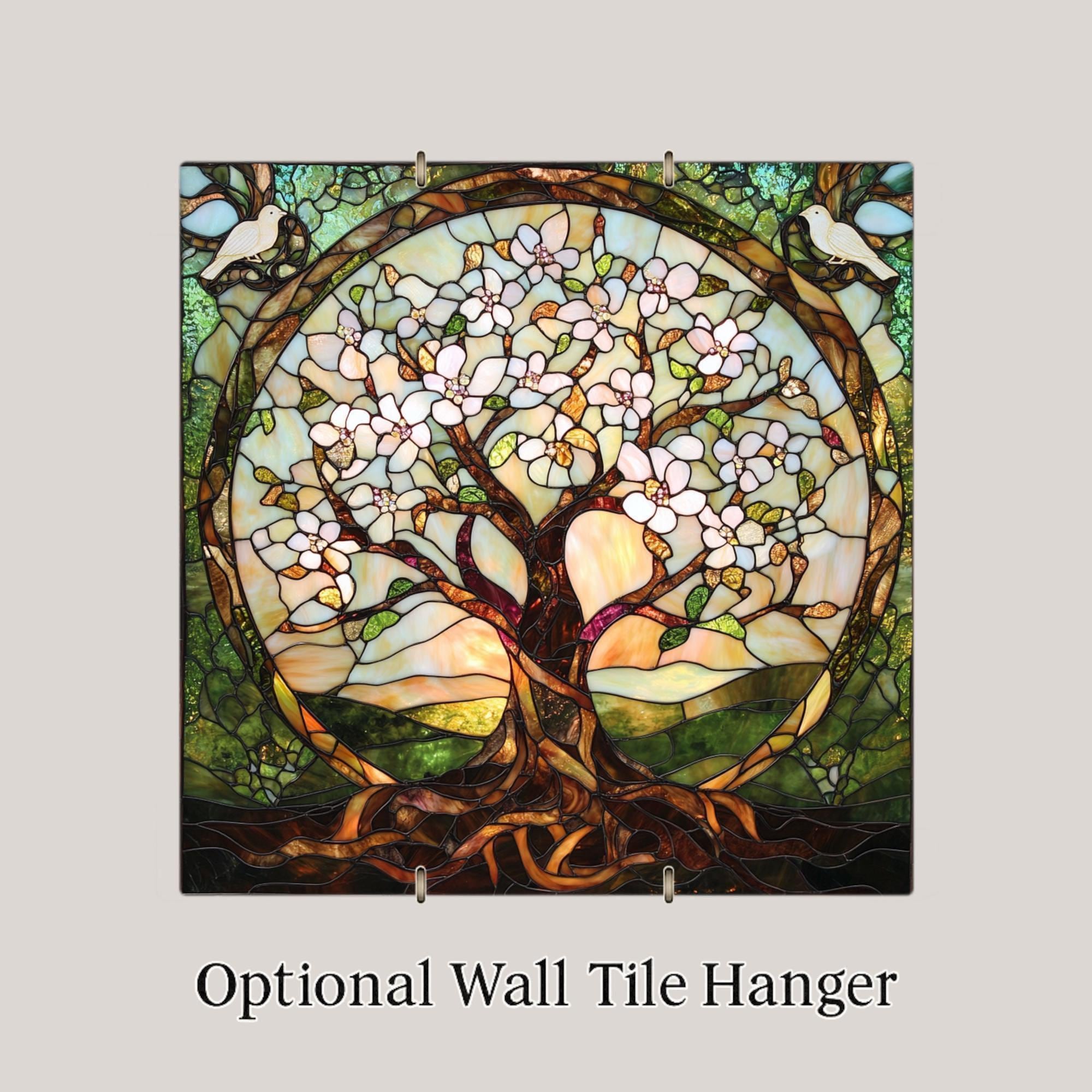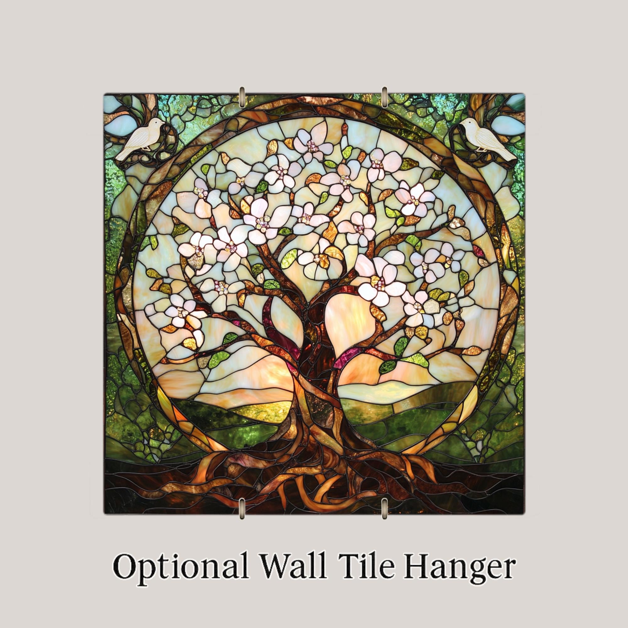 This Tree of Life ceramic art tile captures the spirit of spring with its blooming branches, flowing roots, and elegant stained glass style. The harmonious composition reflects balance, nature, and renewal, making it ideal wall decor for homes that value peace and symbolism. The flowering tree glows with soft pastels and rich browns, nestled in a golden frame of light and landscape.