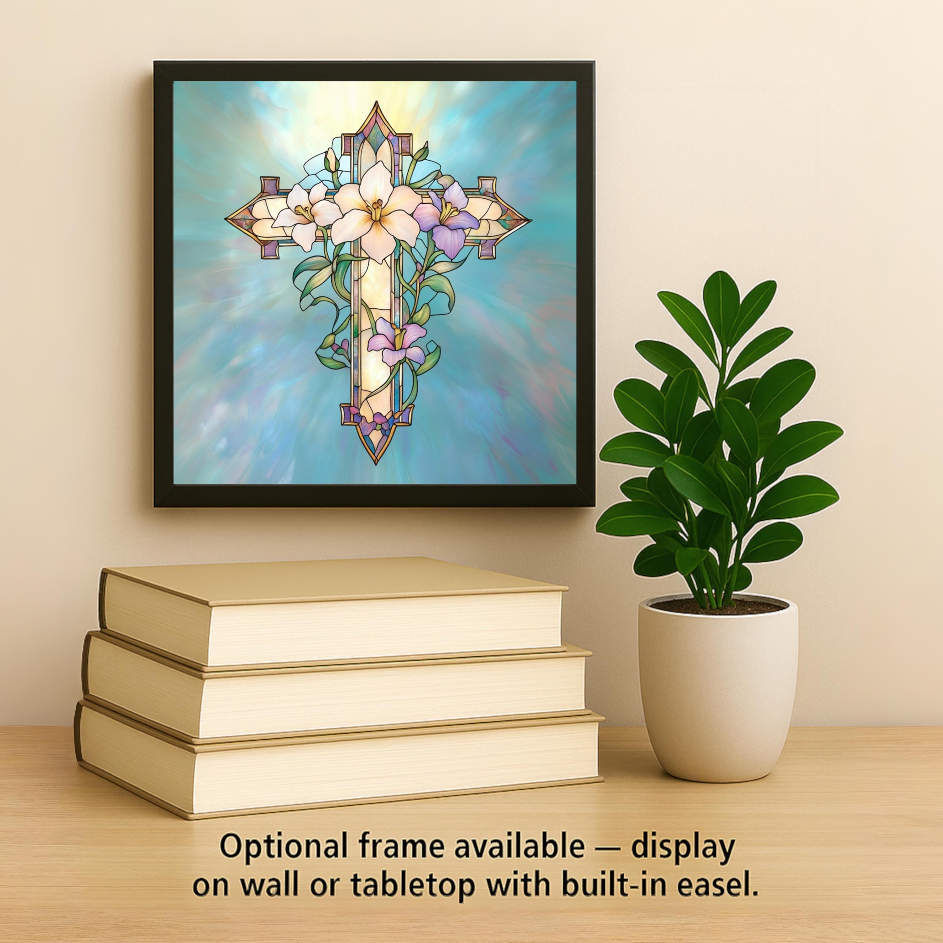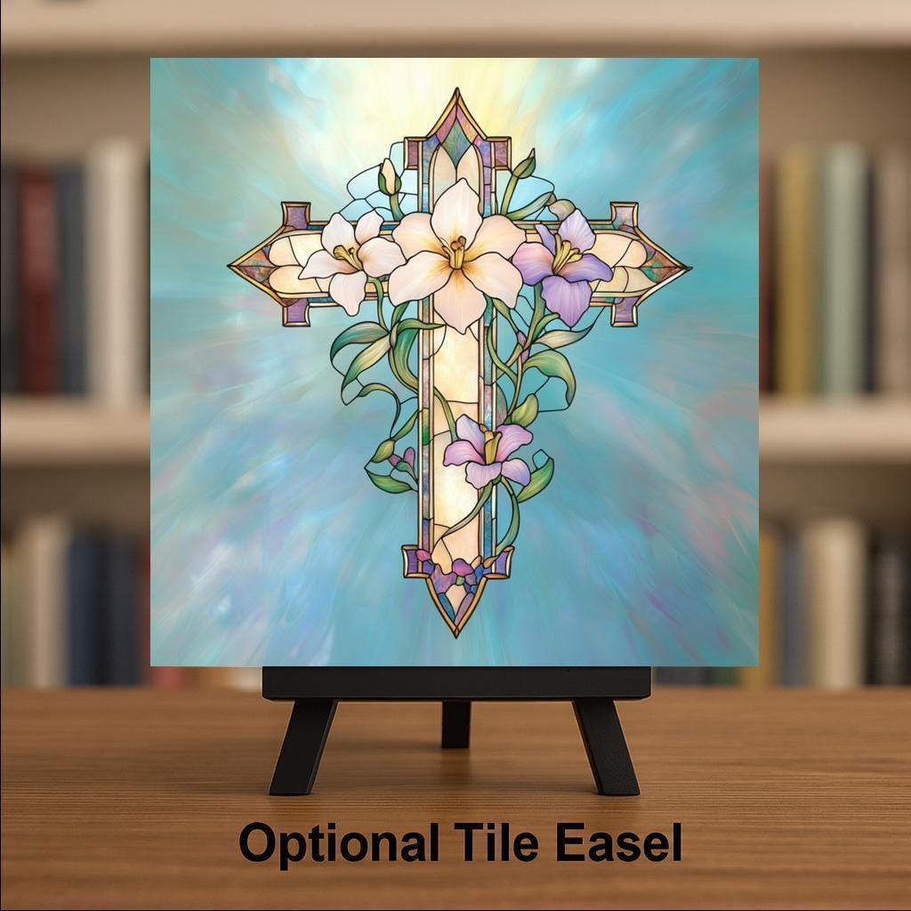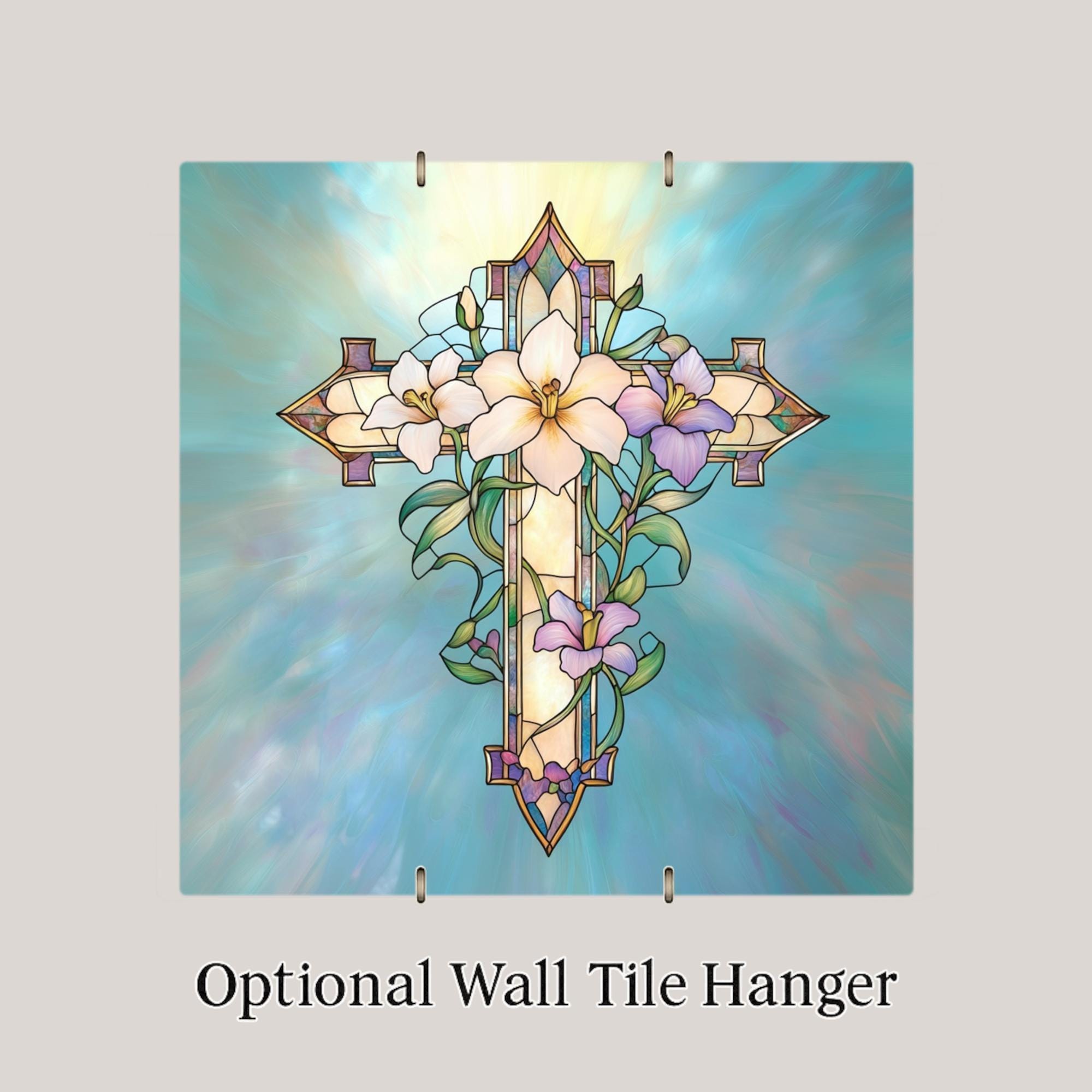This Art Nouveau-style Easter Lily Cross tile is a heartfelt ceramic artwork designed to bring comfort and beauty to any space. Delicate lilies bloom across a luminous cross in pastel shades of ivory, lavender, and gold, framed by softly radiant blues. Inspired by stained glass art, this tile blends spiritual meaning with timeless elegance, perfect for Christian homes or sacred spaces.