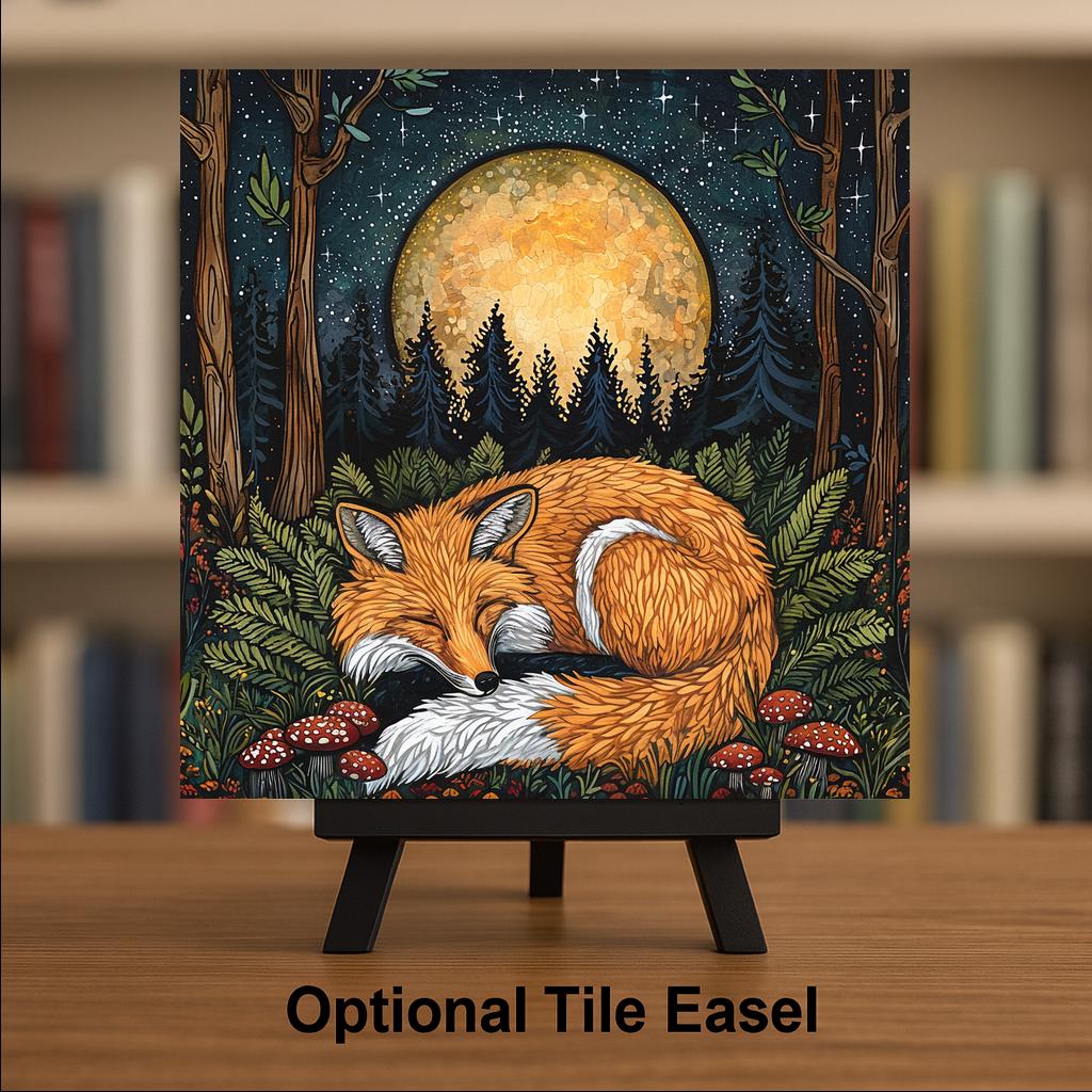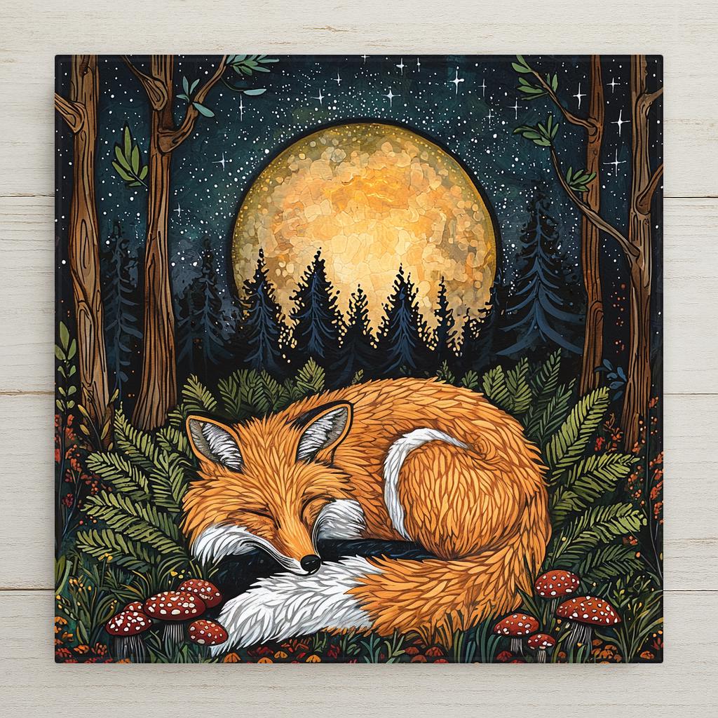 This handcrafted ceramic tile features a sleeping fox nestled in a forest clearing under a brilliant full moon. Surrounded by lush ferns and storybook mushrooms, the scene glows with a magical stillness that brings peace and charm to any space. The starry night sky and warm woodland tones give this piece a calming, cozy feel.