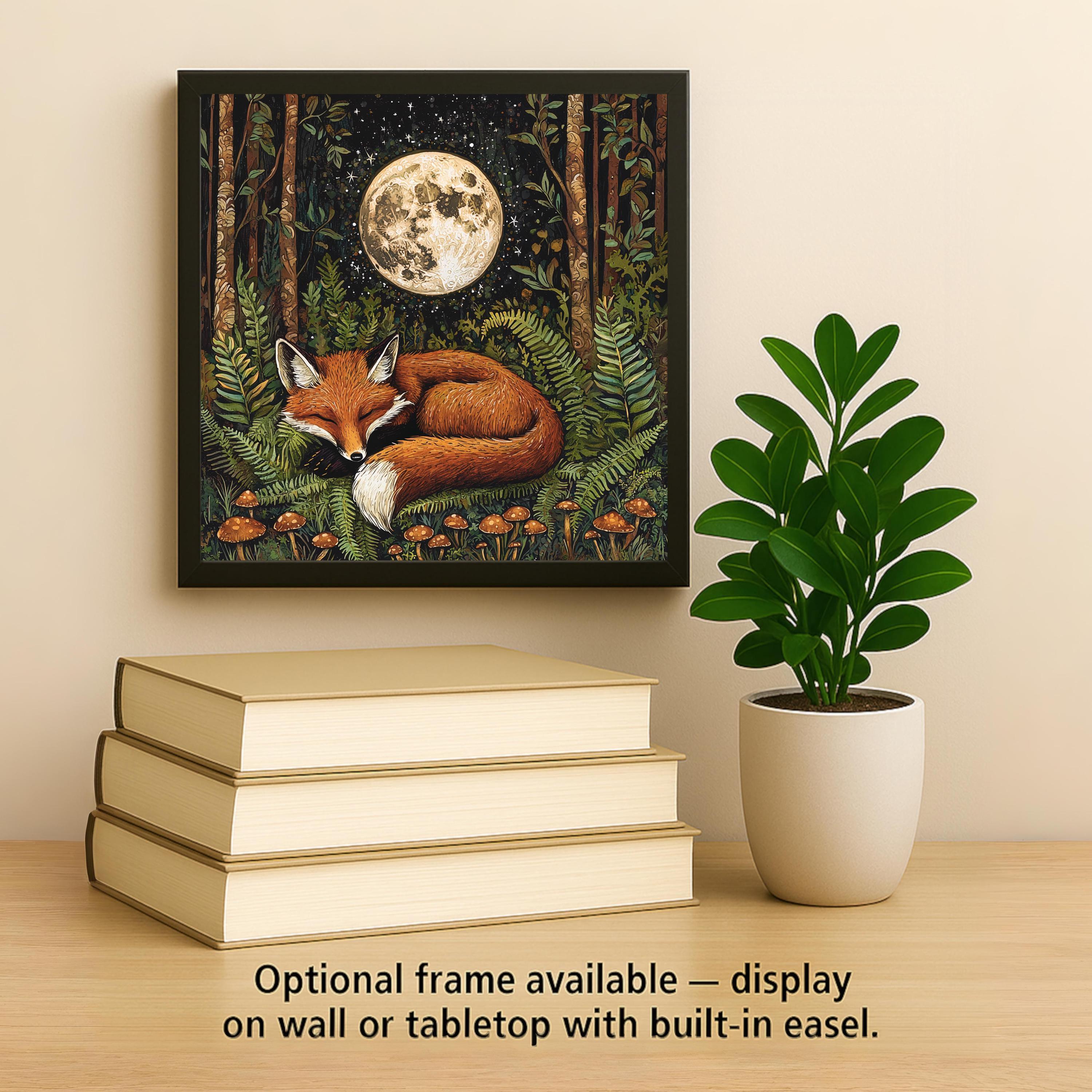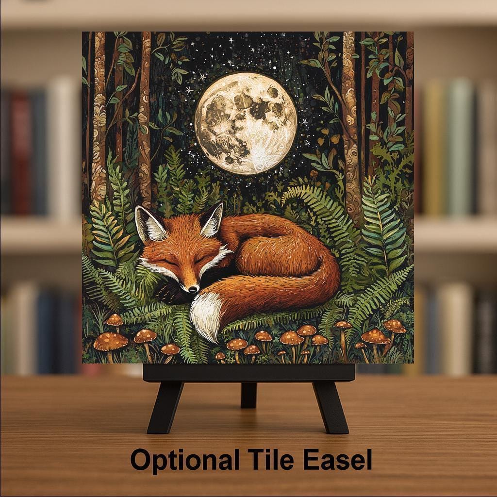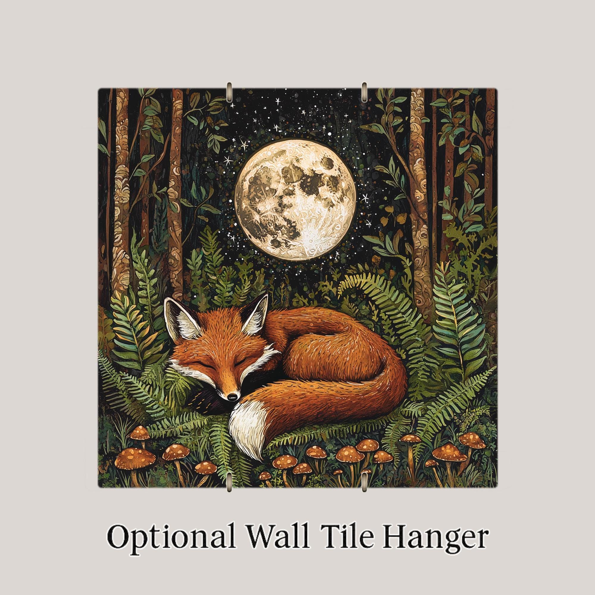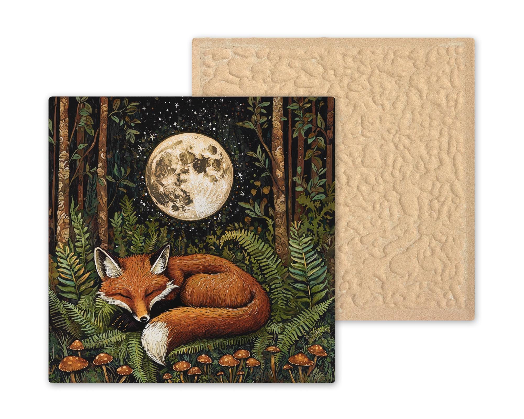 This woodland fox ceramic tile captures a serene nighttime scene with folk art flair. A sleeping fox nestles into a bed of ferns and mushrooms beneath a luminous full moon and starlit sky. Detailed with cozy forest textures and earthy hues, the design brings a feeling of warmth, stillness, and natural harmony—perfect for anyone who feels at home in the woods.