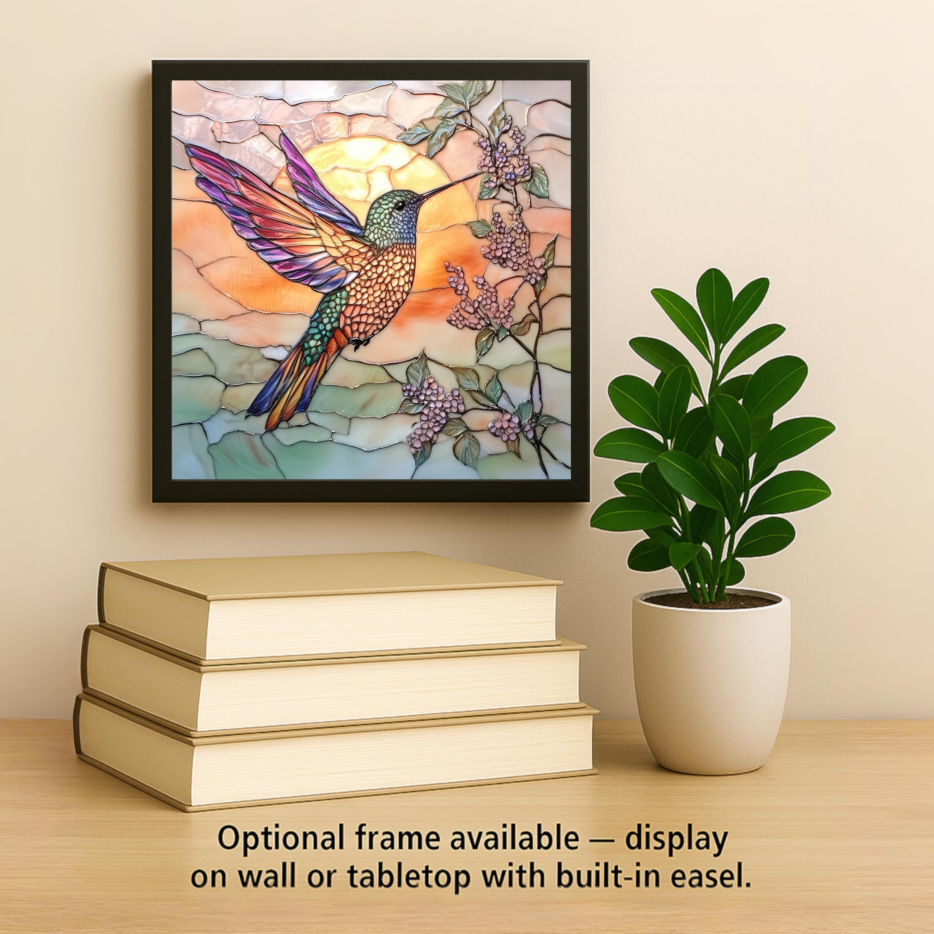 This sunset hummingbird tile is a miniature celebration of color, movement, and peace. The bird’s feathers gleam with tones of violet, coral, teal, and sapphire, framed by soft florals and a brilliant golden sun. The stained glass style gives the image a textured, glowing effect, bringing the tile to life like a miniature window into nature.