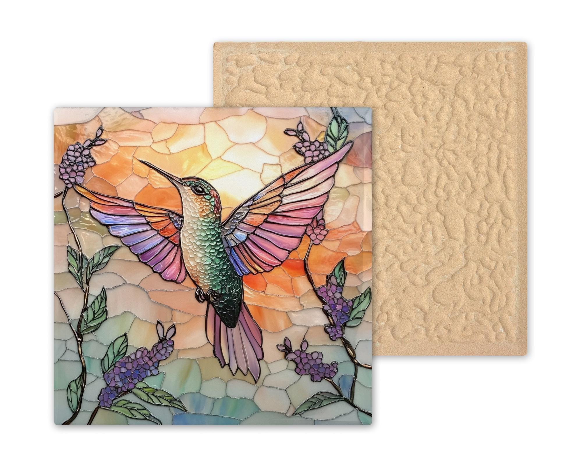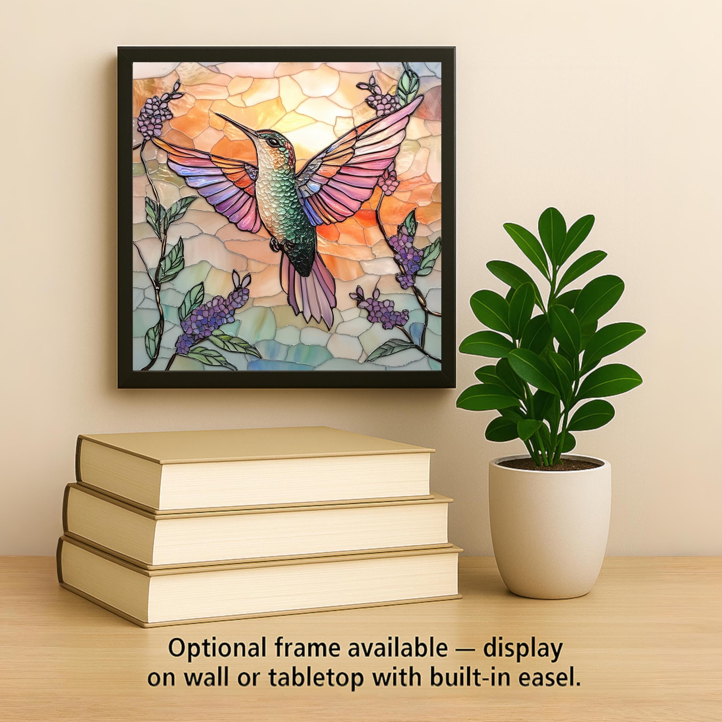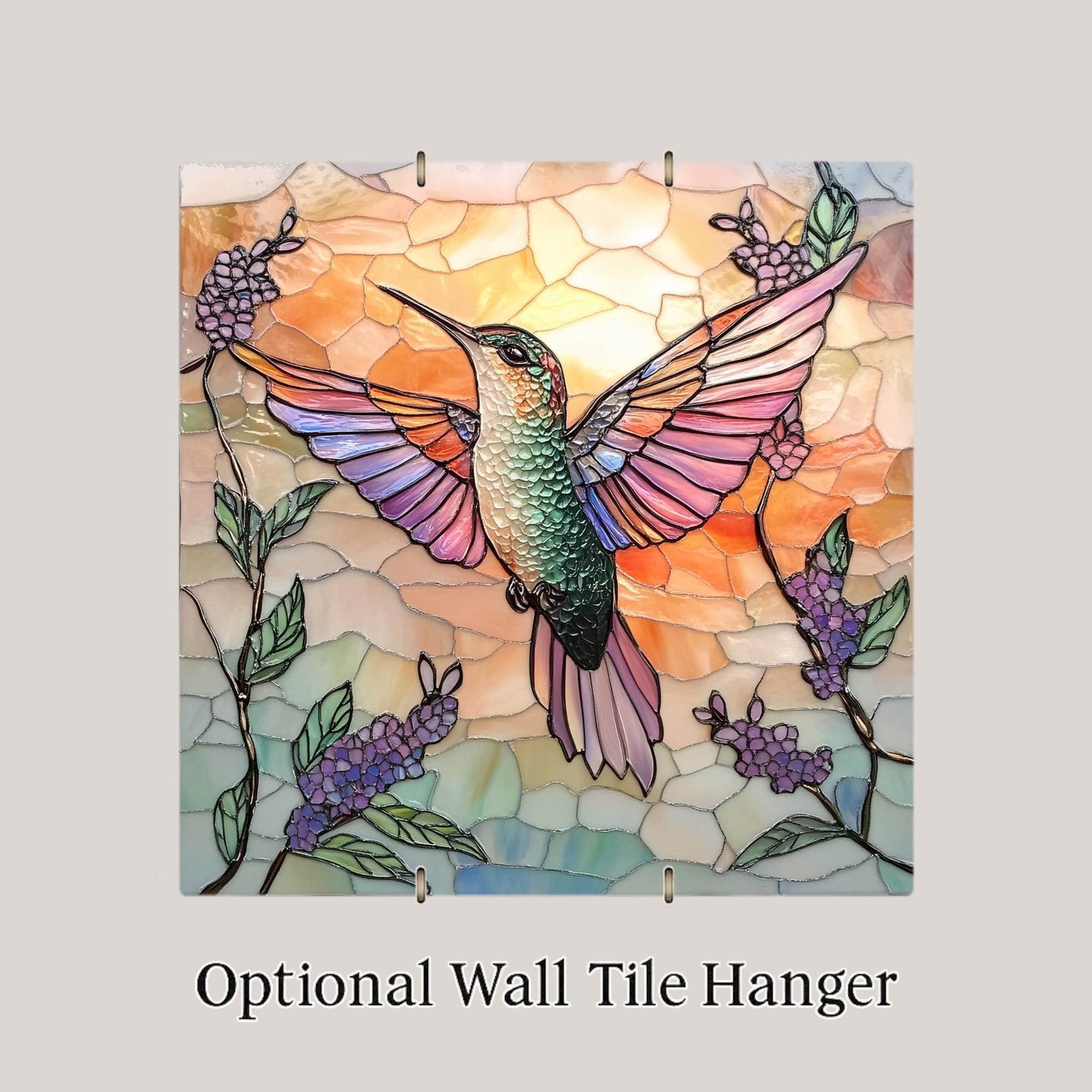 This radiant ceramic tile captures the graceful energy of a hummingbird in flight, rendered in a luminous stained glass style. Blending warm sunset tones and sparkling floral details, this piece brings harmony, hope, and vibrant color to any room. It's perfect for bird lovers, spiritual spaces, or those who appreciate handmade nature decor. Hang it on your wall, rest it on an easel, or use it as a functional art trivet in your kitchen. Great for boho homes, garden-inspired themes, or anyone seeking a meaningful gift with symbolic charm. Hummingbirds are often seen as messengers of joy and resilience, making this tile a heartfelt gift for birthdays, memorials, or just because. Choose from optional cork backing, tile wall hanger, or display stand for versatile use. Add beauty and energy to your home with this colorful artisan tile.