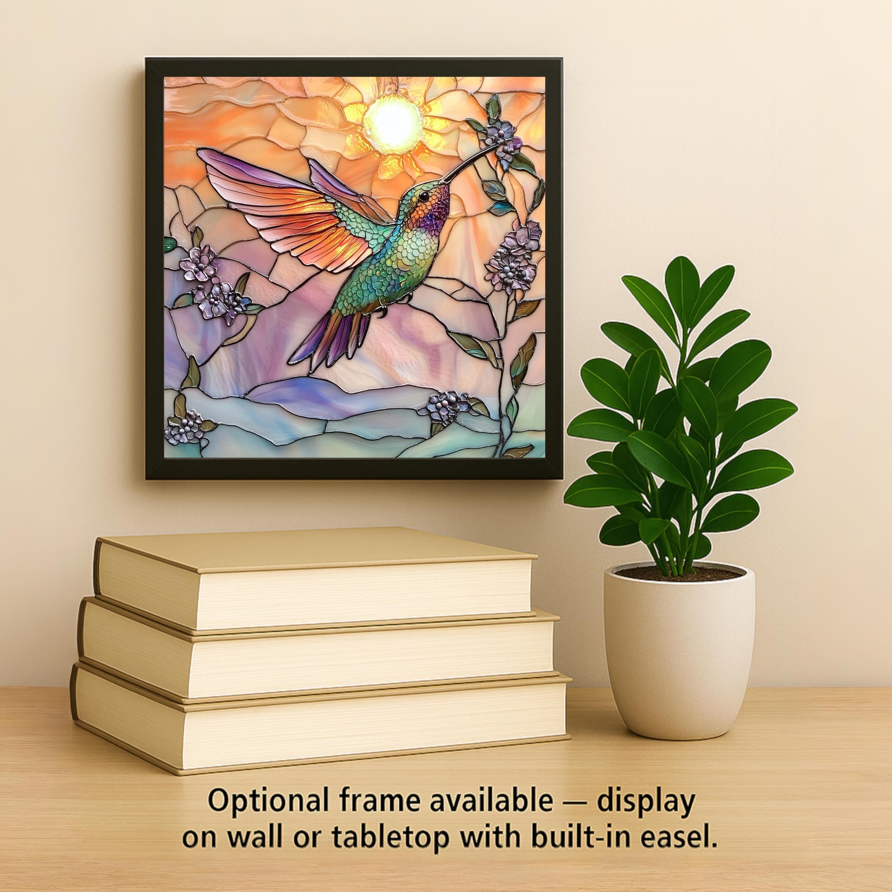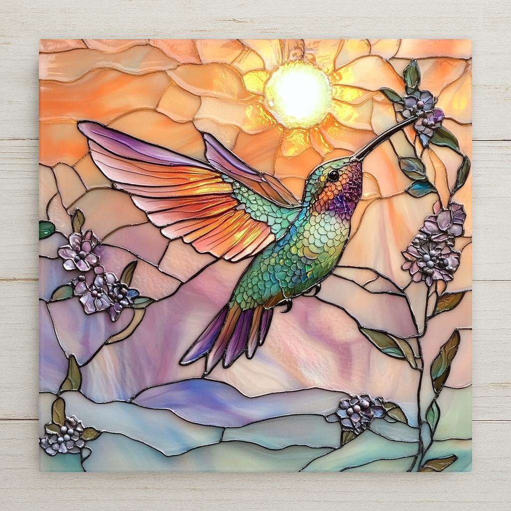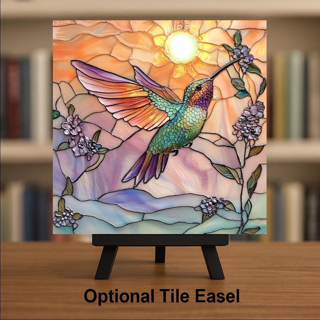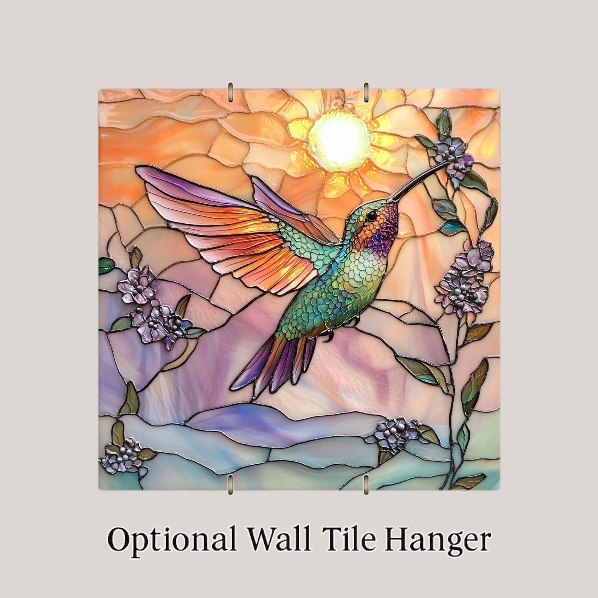 Bring the glow of a new day into your home with this vibrant sunrise hummingbird ceramic tile wall art. Featuring a luminous stained glass-style hummingbird in flight, this piece captures the joy and energy of nature. Surrounded by warm sunrise hues and intricate botanical accents, the design evokes the serenity and vitality of early morning light. It’s a stunning way to brighten your home with a touch of natural elegance.