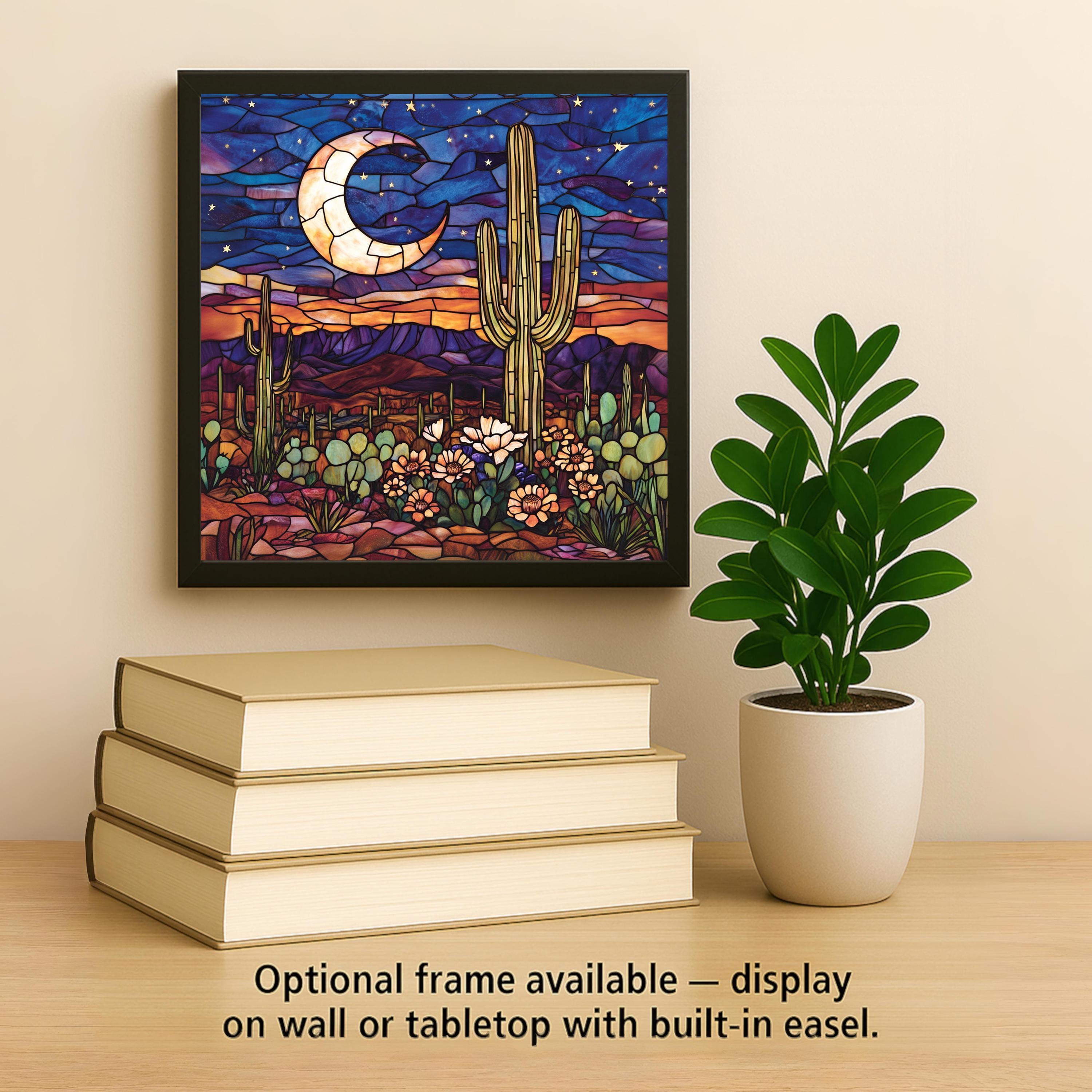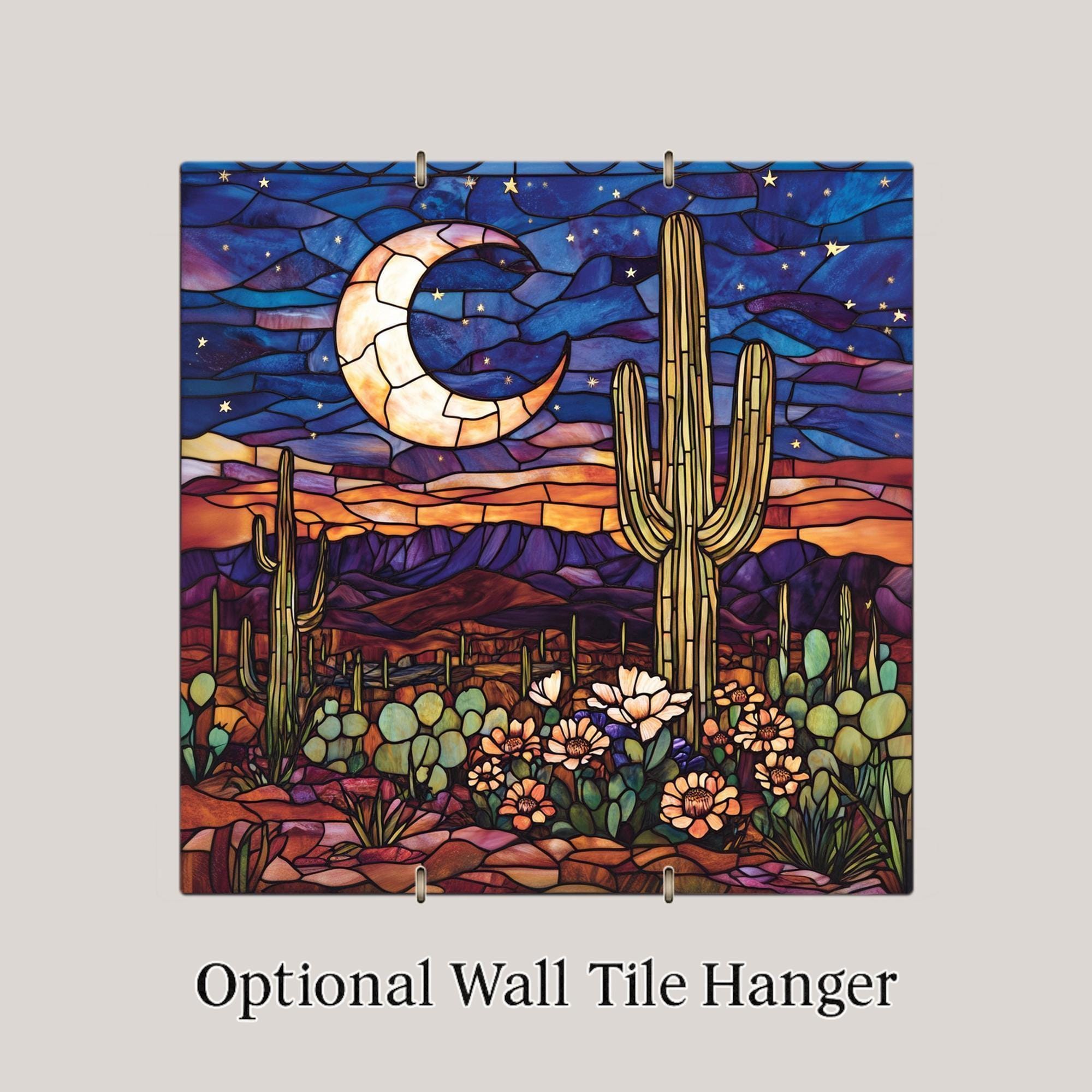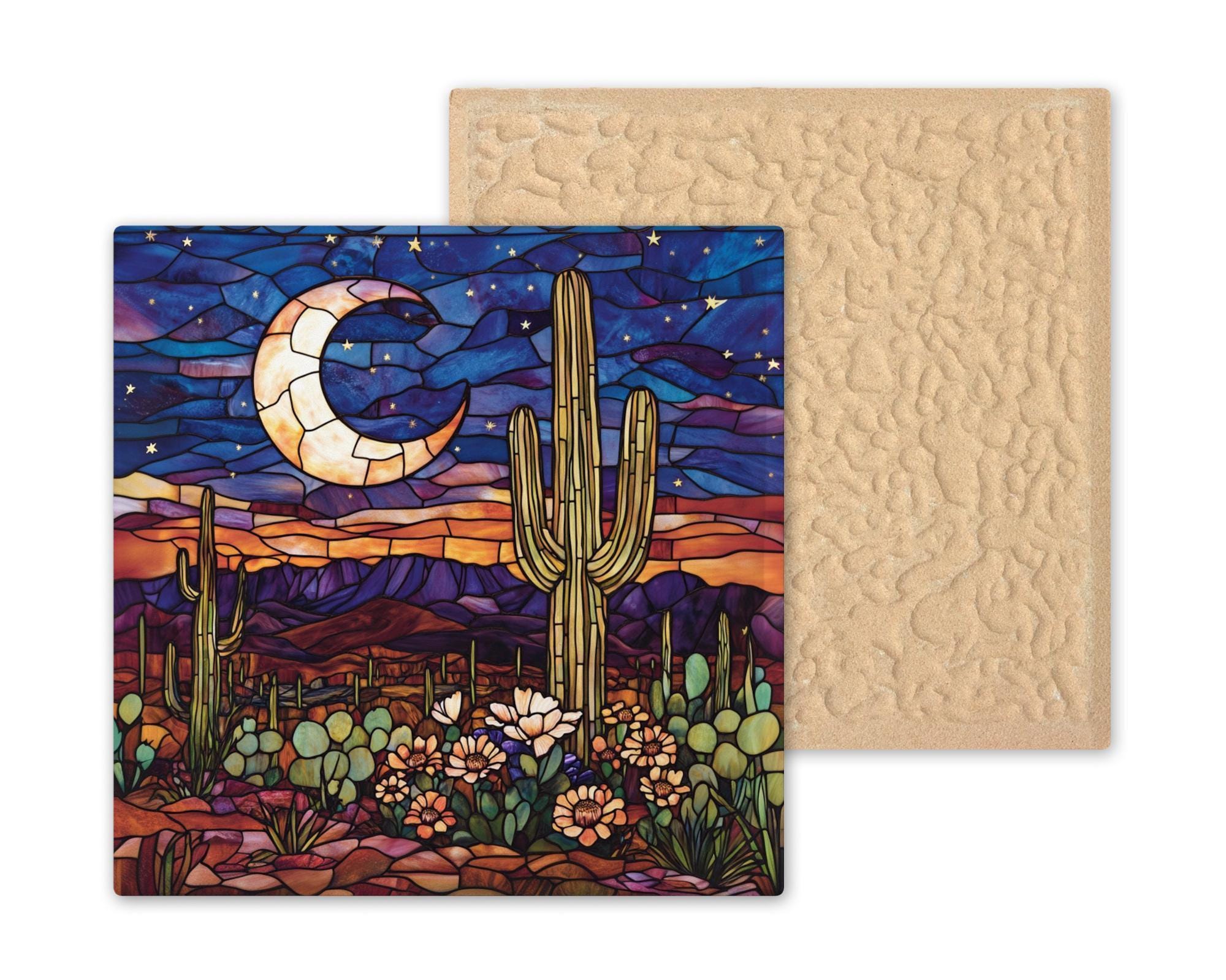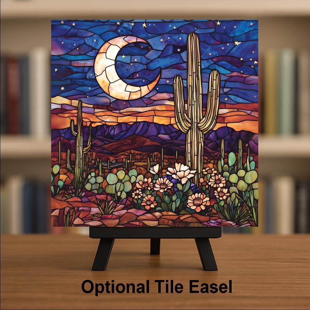 Experience the serenity of a moonlit desert with this handcrafted ceramic tile art, designed in a stained glass style to evoke warmth, color, and calm. Featuring a luminous crescent moon, golden saguaro cactus, blooming succulents, and deep desert mountains, this artwork captures the peaceful glow of a desert sunset beneath the stars.