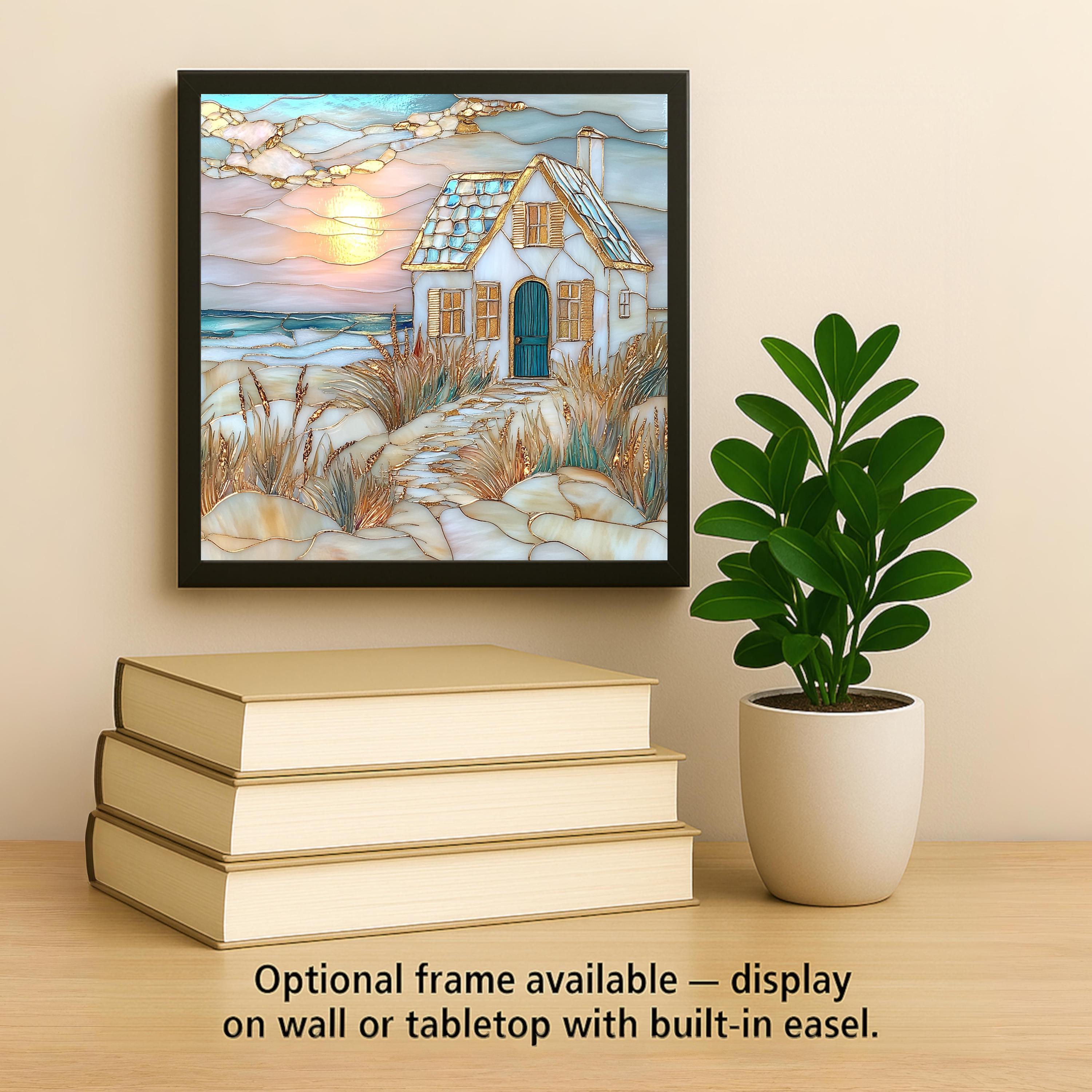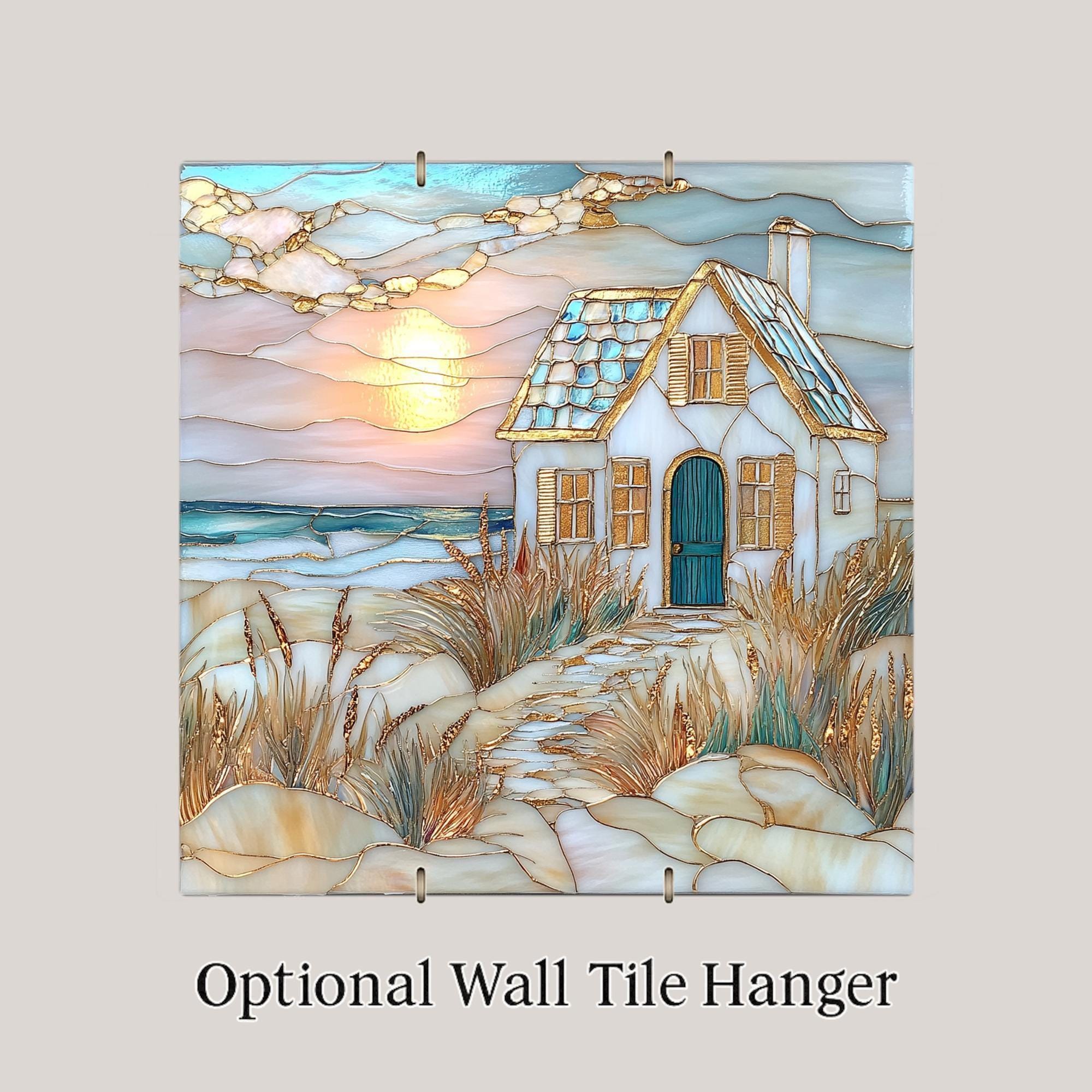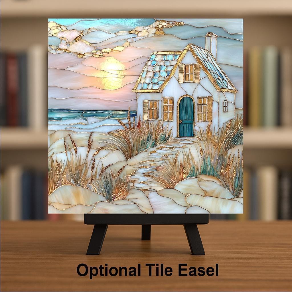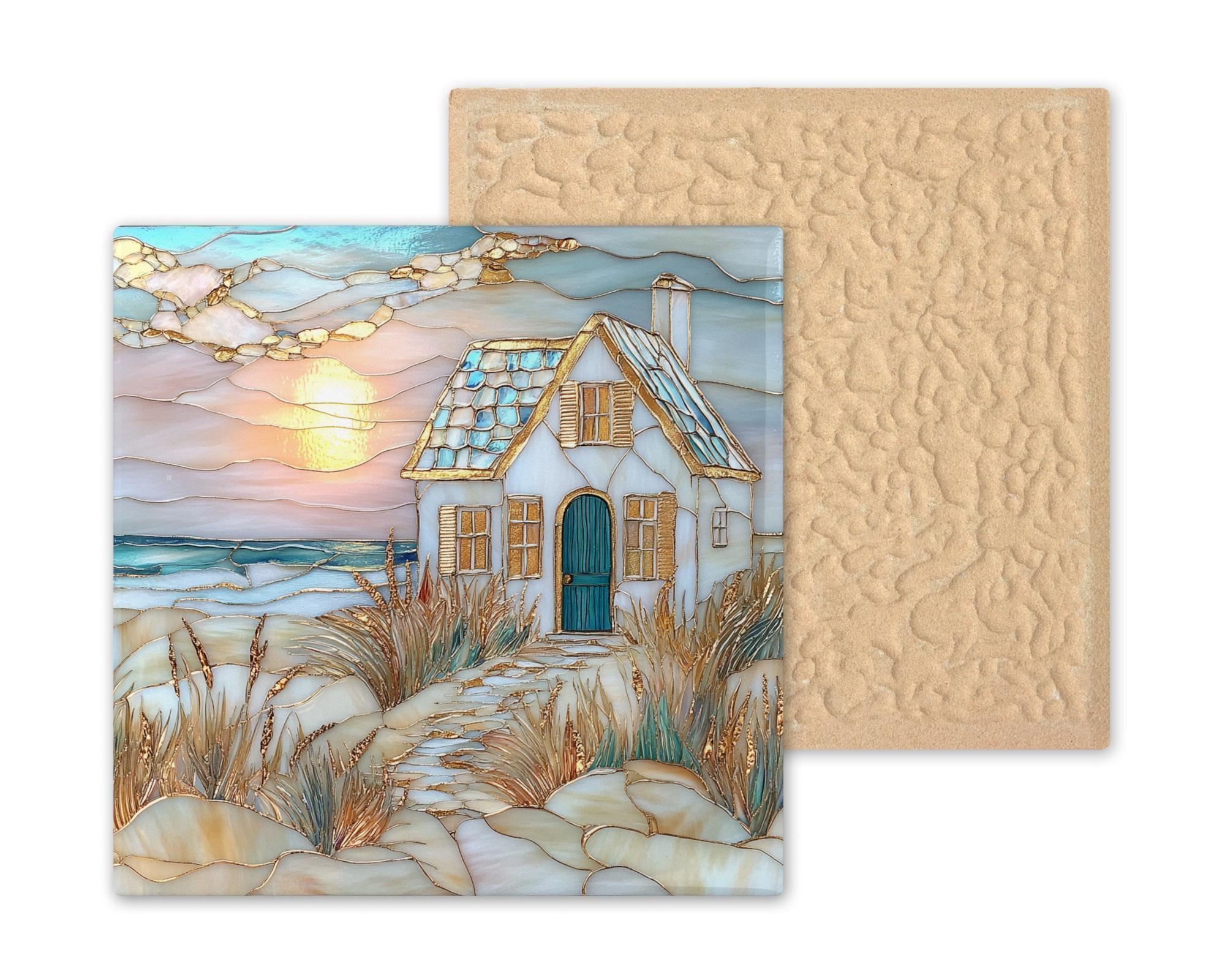 Capture the essence of beach life with this beautiful coastal cottage ceramic tile, featuring a stained glass-style seaside scene. A cozy cottage sits peacefully along the ocean shore, surrounded by seashells, water, and the glowing colors of a sunset. This elegant artwork brings coastal charm to any space, making it ideal for a beach-themed kitchen, bathroom, or entryway.