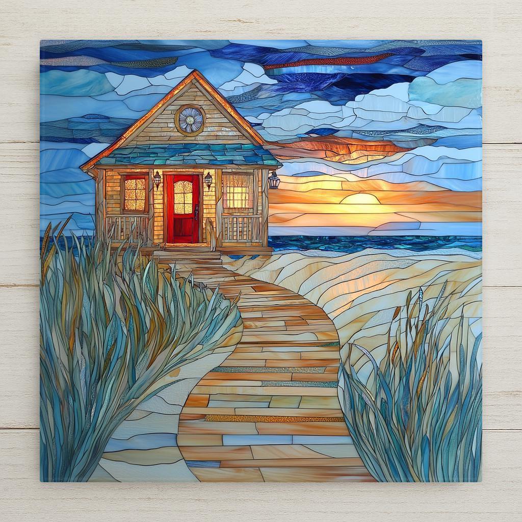 Capture the relaxing magic of coastal living with this handcrafted ceramic tile featuring a sunset beach cottage in stained glass style. The cottage glows with warm light, inviting you down a boardwalk path that winds through tall seagrass to the ocean’s edge. The stained glass-inspired design glistens with deep sea blues, driftwood browns, and glowing sunset oranges that evoke the peace of a perfect beach evening.