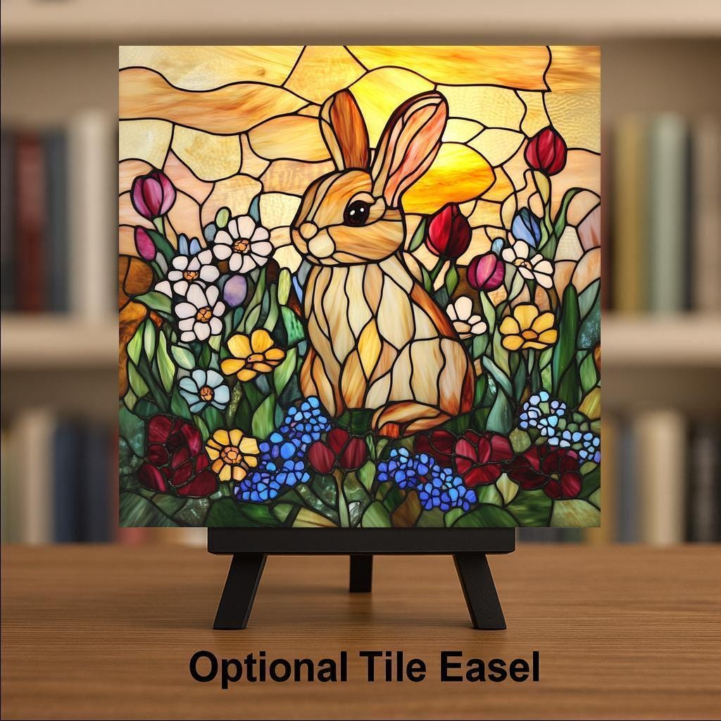 Add a touch of springtime whimsy to your home with this handcrafted ceramic tile featuring a bunny among bright flowers and a glowing sunset. The stained glass-style artwork brings together earthy browns, soft yellows, and lush garden colors to create a warm and inviting look. It’s a perfect match for cottagecore lovers, rabbit collectors, or anyone decorating for Easter or springtime.