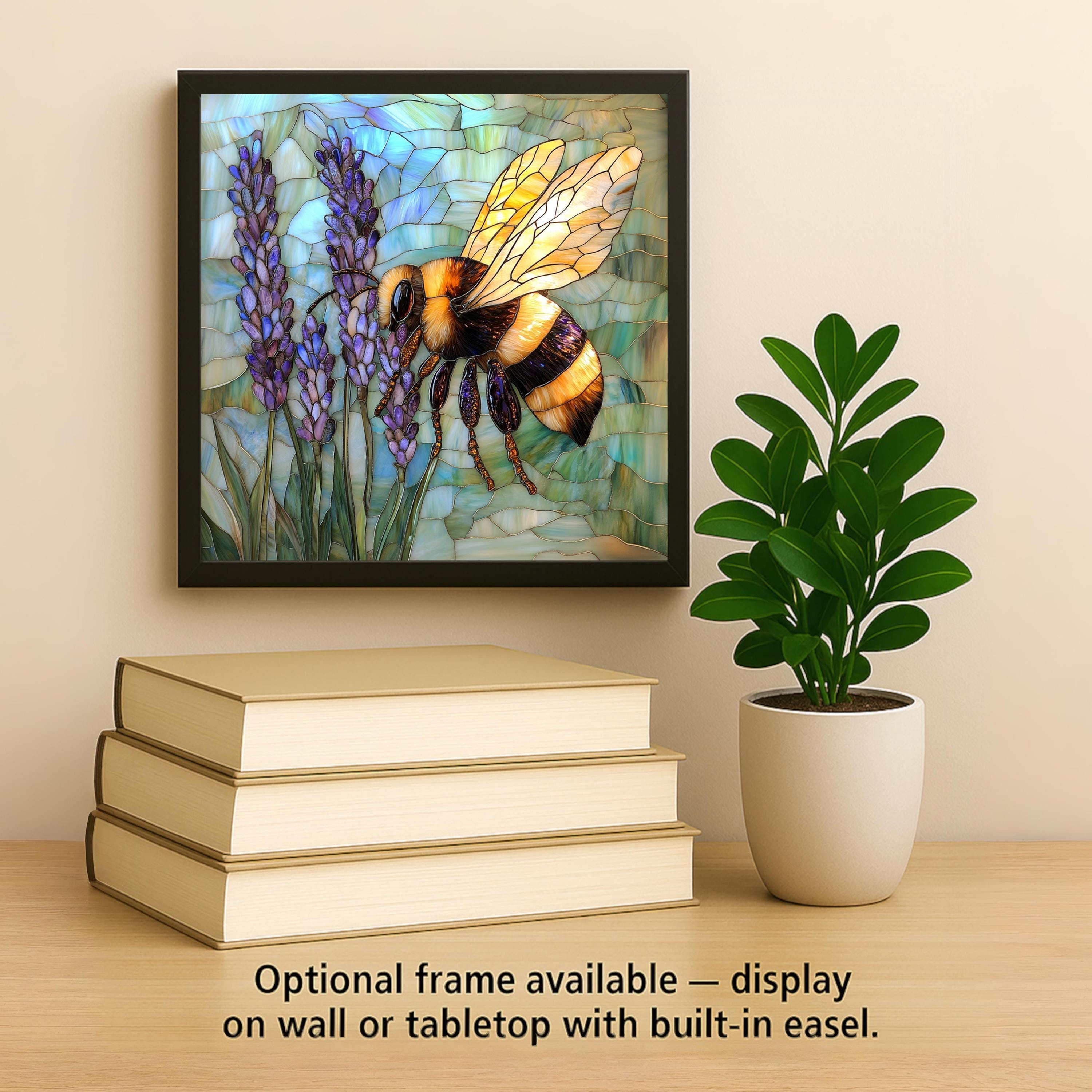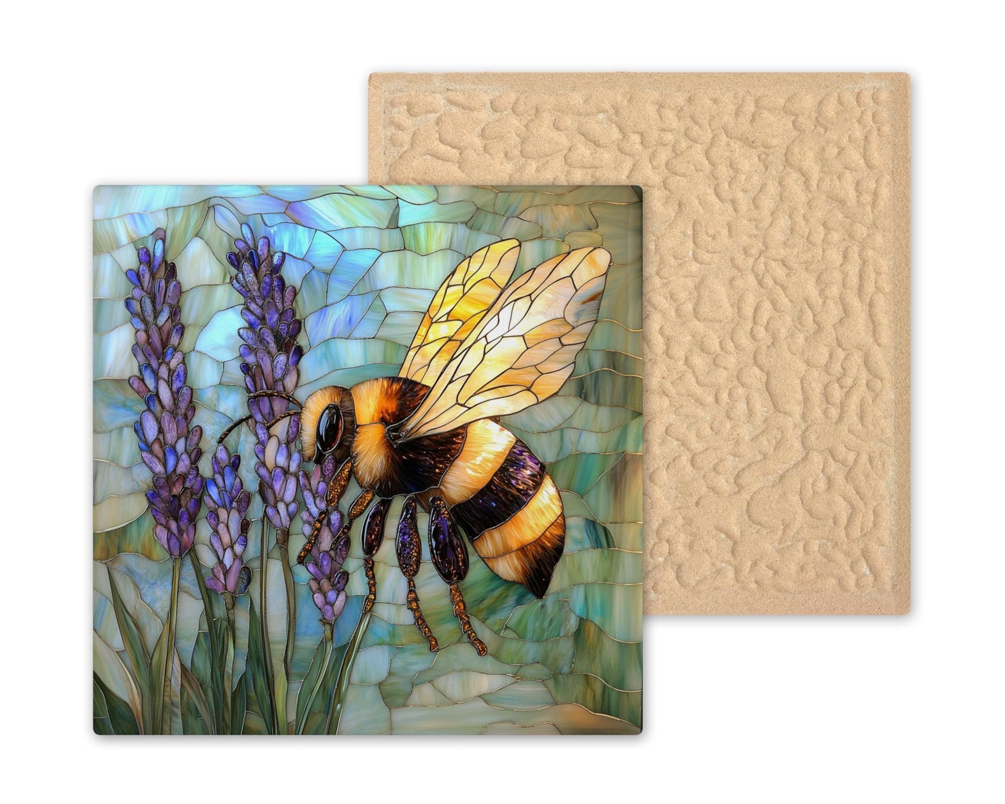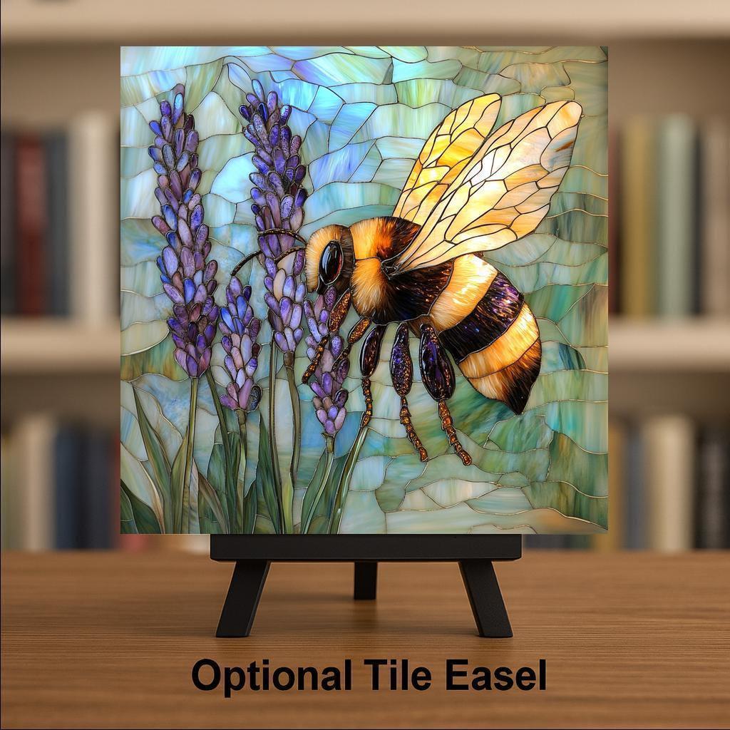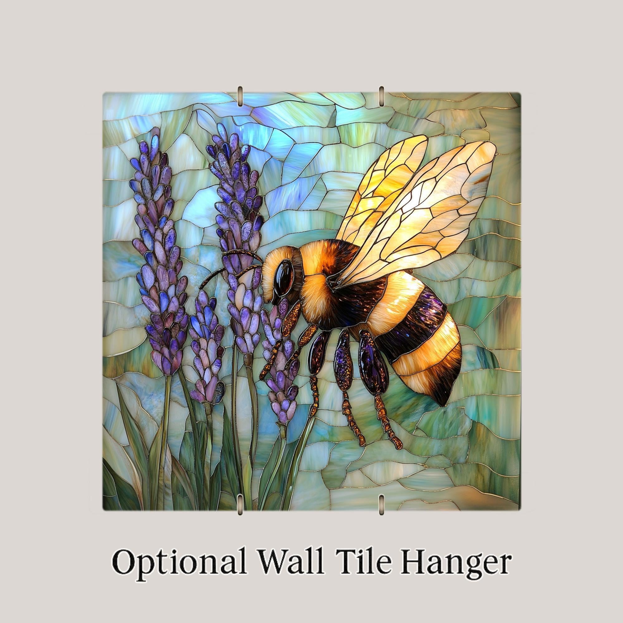 Each detail is designed to look like leaded stained glass, creating the illusion of depth and sunlight passing through colored glass. It’s especially suited for kitchen walls, she-sheds, craft rooms, or home offices where a little inspiration can brighten the day. The bee and lavender motif also pairs well with farmhouse florals, rustic herb garden themes, or even whimsical boho accents. Display is easy—just add the optional tile wall hanger or easel tile stand, or lay flat with cork backing as a decorative trivet or centerpiece.