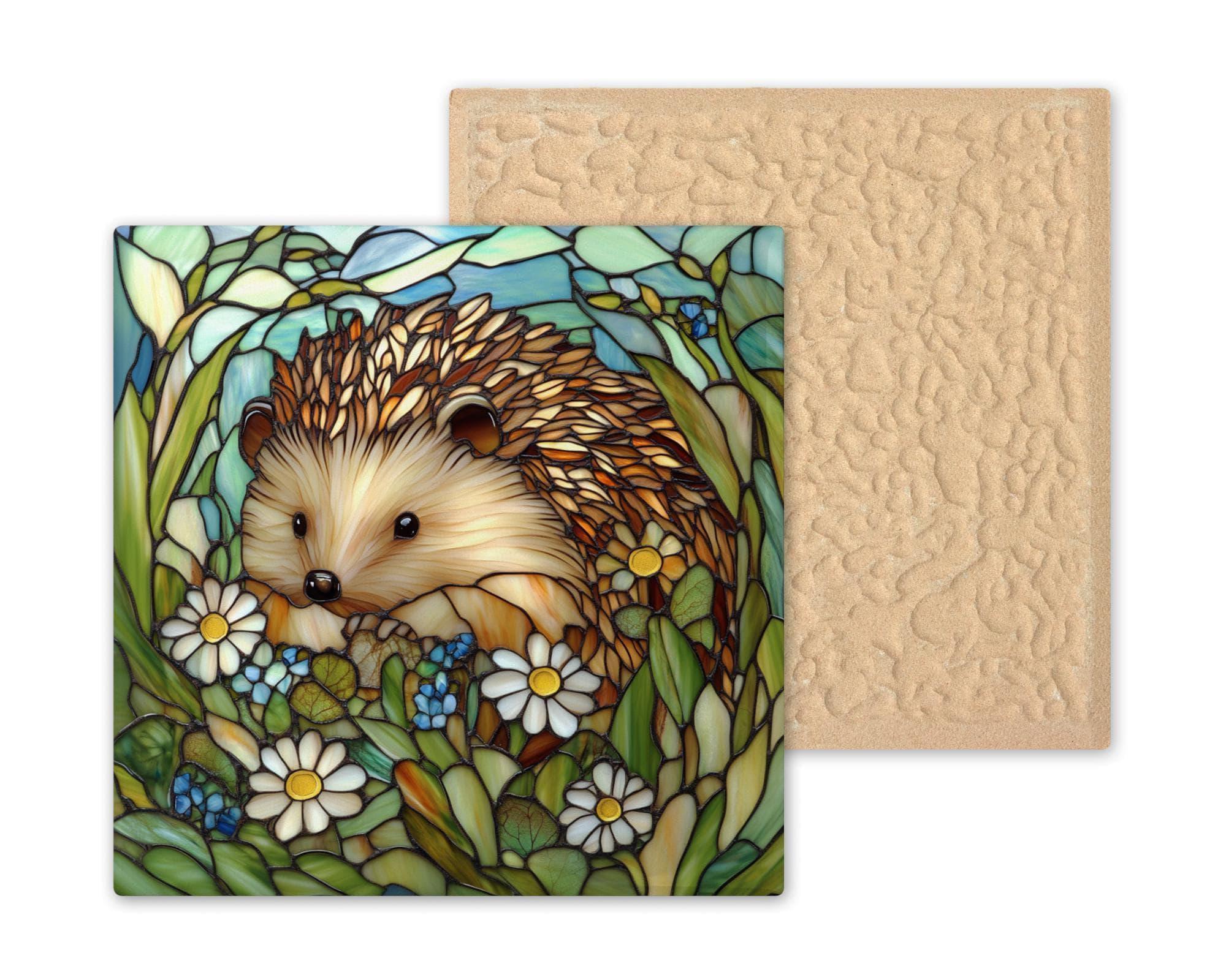 Celebrate the beauty of nature with this stained glass-style ceramic tile featuring an adorable hedgehog among wildflowers and greenery. This woodland animal wall art brings cottagecore charm to any room in your home. Rich earthy tones, vibrant green leaves, and soft floral details create a peaceful, welcoming atmosphere.