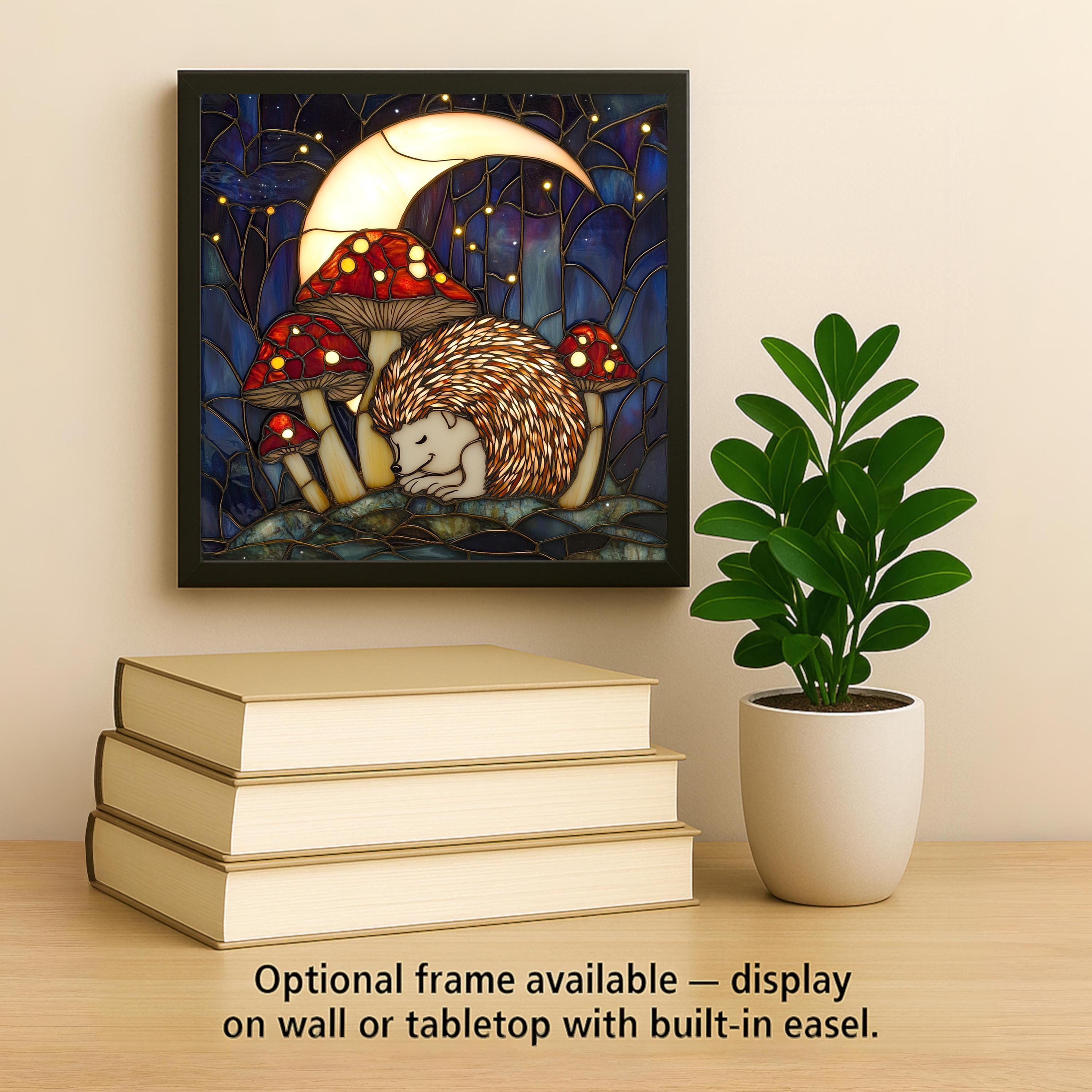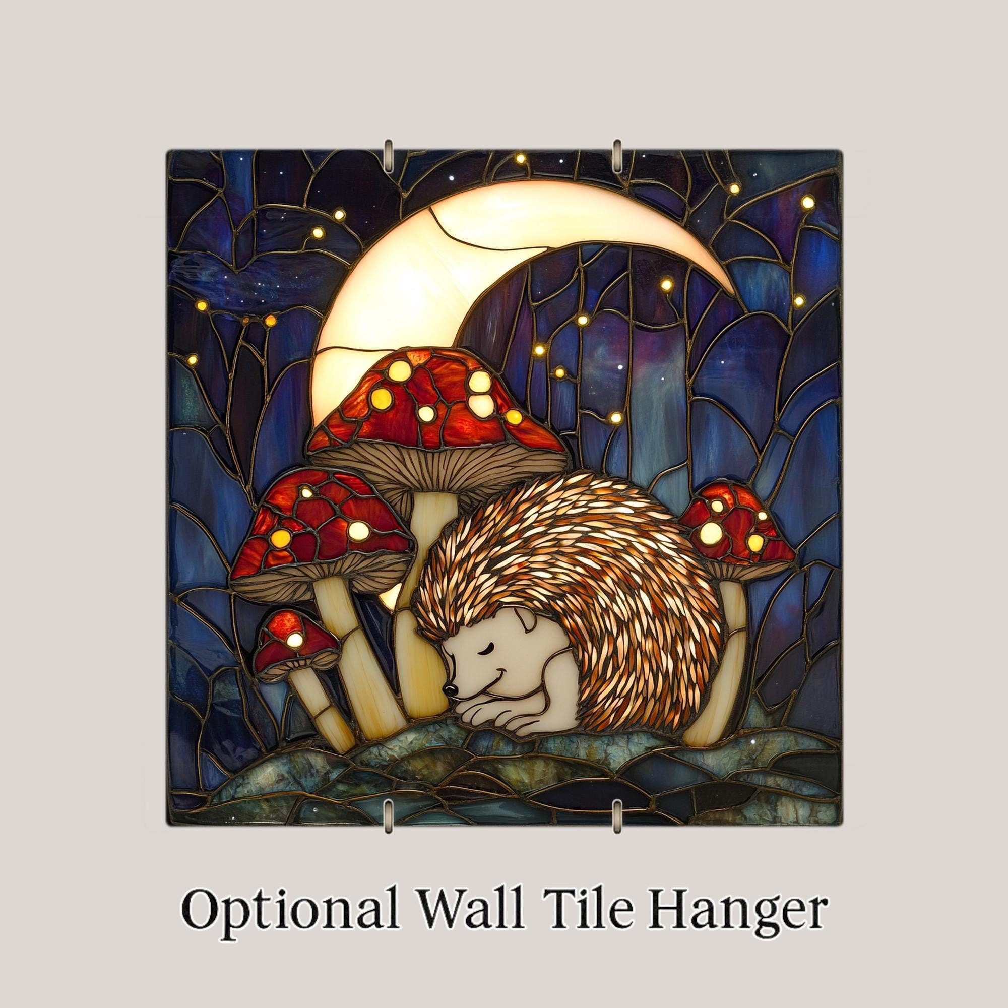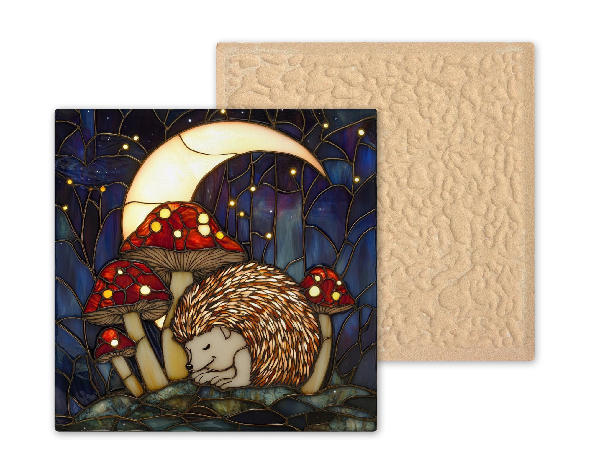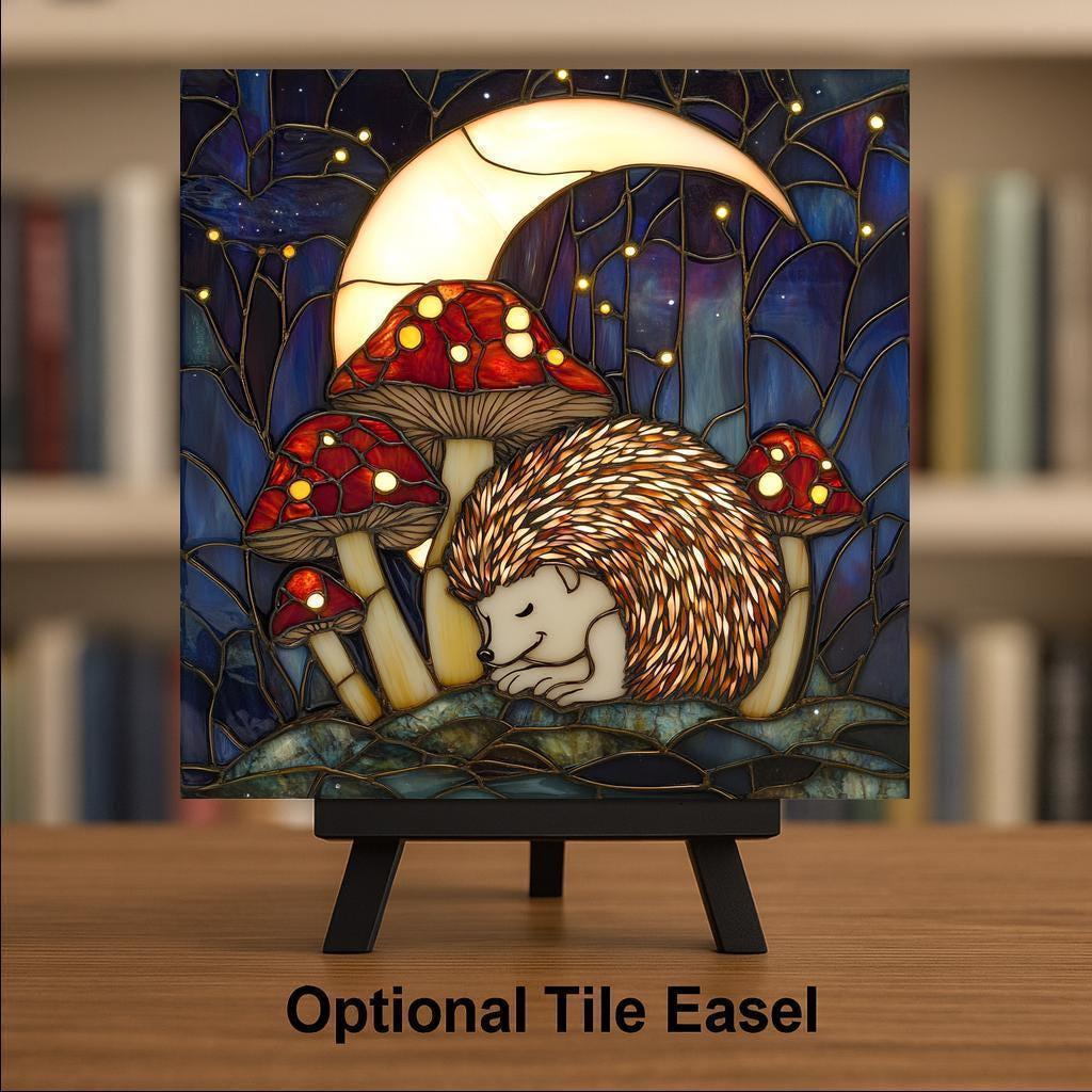 This handcrafted ceramic tile captures a peaceful woodland scene featuring a sleeping hedgehog tucked among glowing red mushrooms and forest shadows under a crescent moon. The stained glass style enhances its dreamy atmosphere with rich blues, glowing whites, and soft golds, making it an ideal piece for cottagecore, fairycore, or nature-inspired spaces.