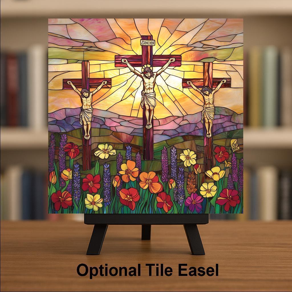 Honor the story of the crucifixion with this handcrafted ceramic tile art, designed in a stained glass style to capture the powerful imagery of Jesus on the cross. The scene is set against a glowing sunrise and fields of blooming wildflowers, symbolizing hope, renewal, and salvation. The three crosses rise from a vibrant landscape, making this piece both visually striking and spiritually meaningful.