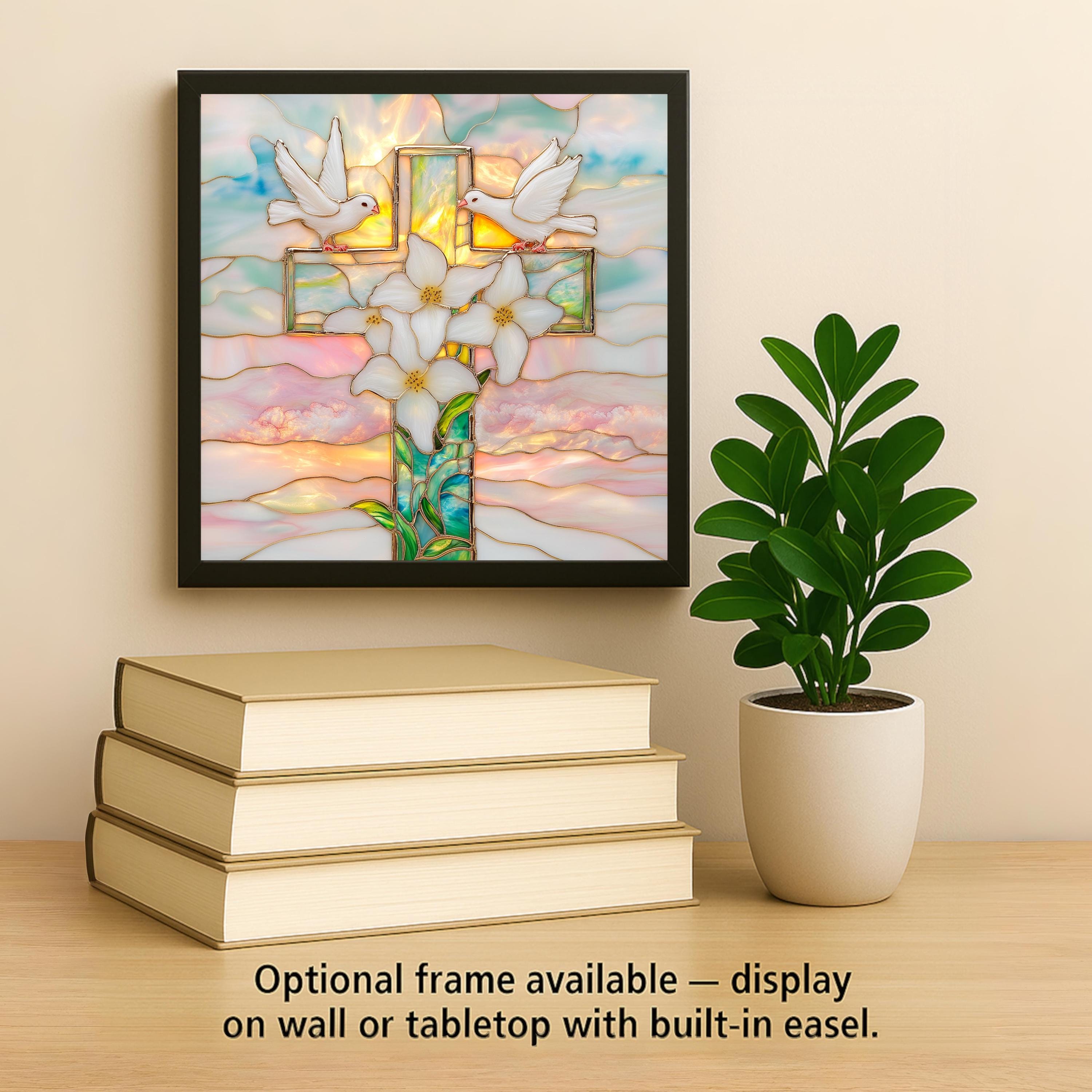 The luminous colors mimic real stained glass, with layered textures and golden outlines that catch the light beautifully. The doves represent peace and the Holy Spirit, while the lilies symbolize purity and resurrection. Together, they create a piece of sacred art that speaks to the soul.