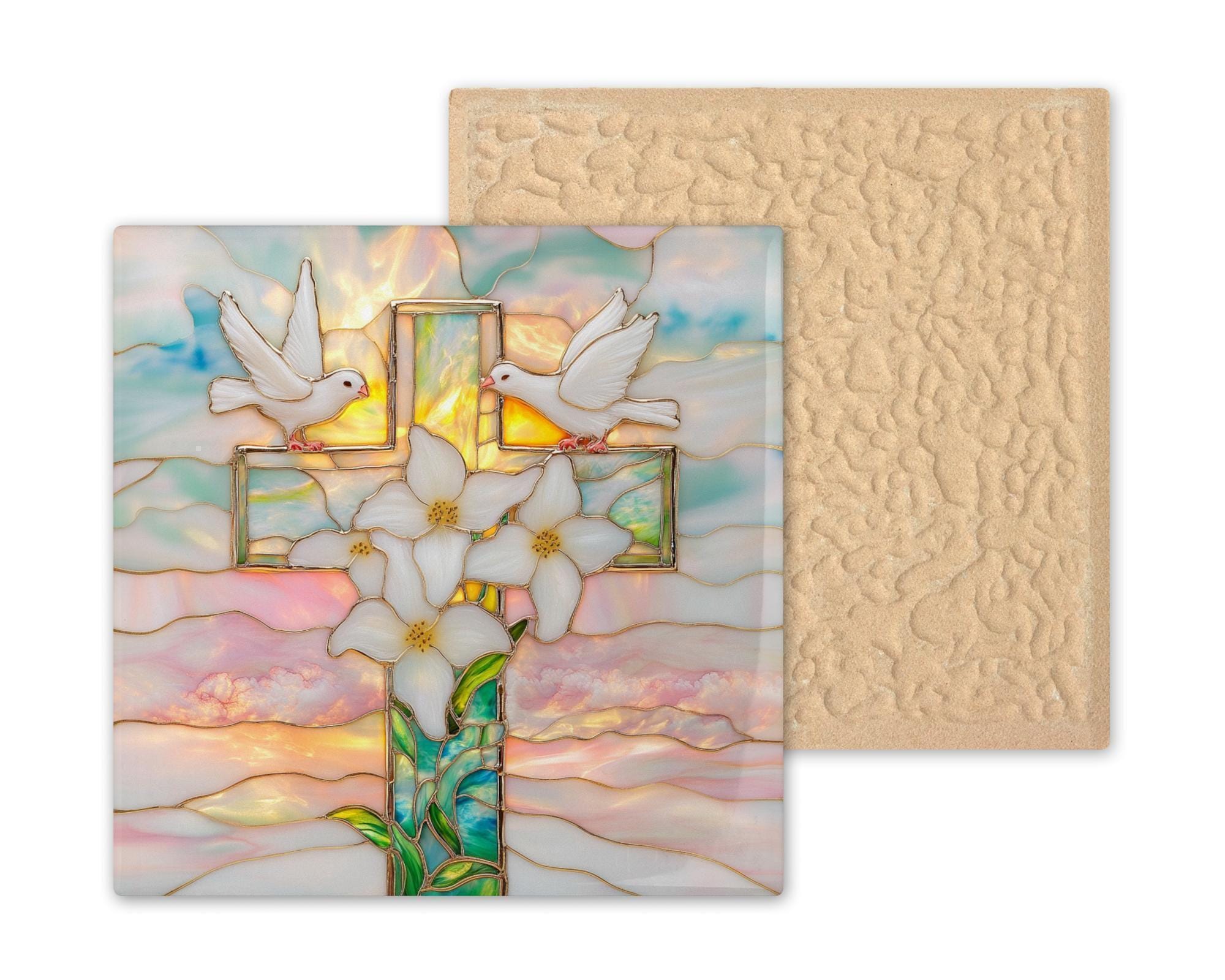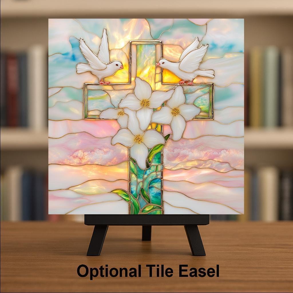 This Christian cross ceramic tile was designed for buyers who want a faith piece with real artistic presence — not a mass-produced religious print, but something that looks like it belongs in a home that values beauty and belief equally. The stained glass treatment gives the cross a luminous jewel-tone quality that changes with the light throughout the day.