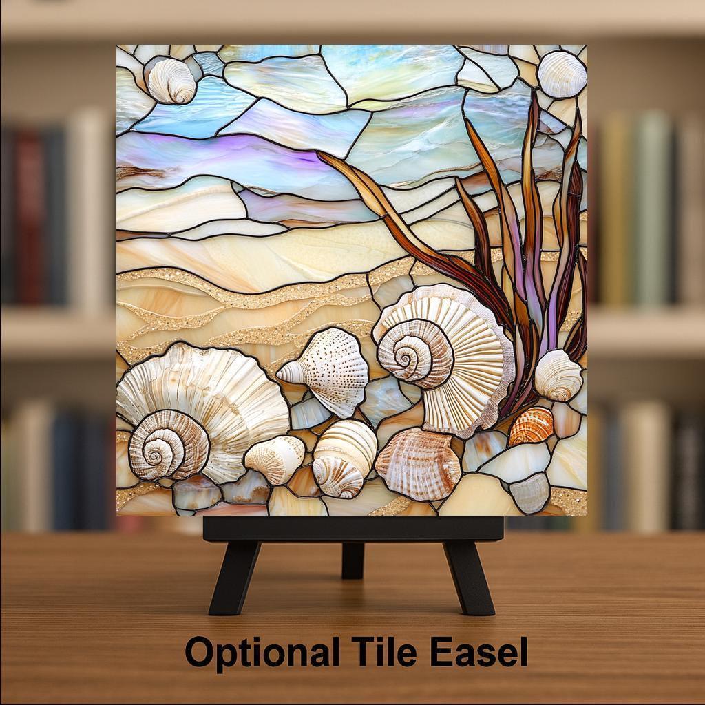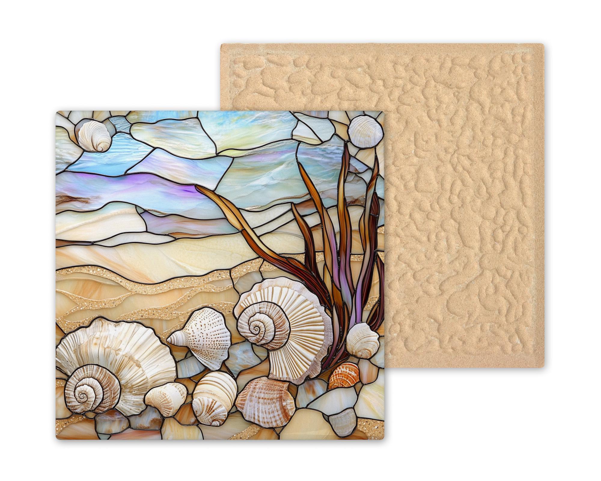 Inspired by stained glass windows and coastal landscapes, this seashell ceramic tile art brings together elegance and nature. A collection of spiraled and ridged seashells lies peacefully on a soft sand beach, framed by rich amber seaweed and backed by ocean waves in soft, flowing blues and purples. The delicate outlines and hand-drawn textures give this tile an artisanal charm, perfect for any seaside retreat.