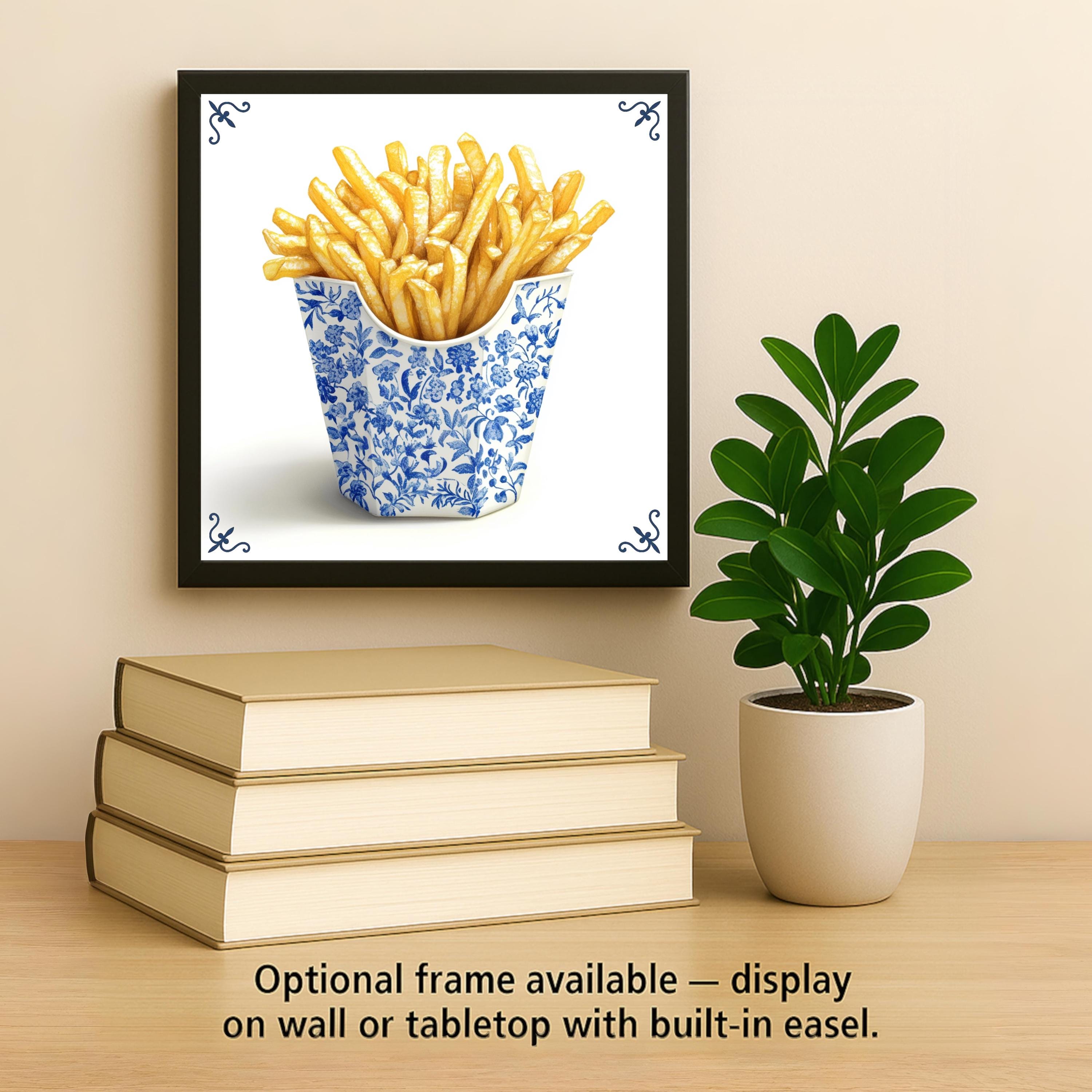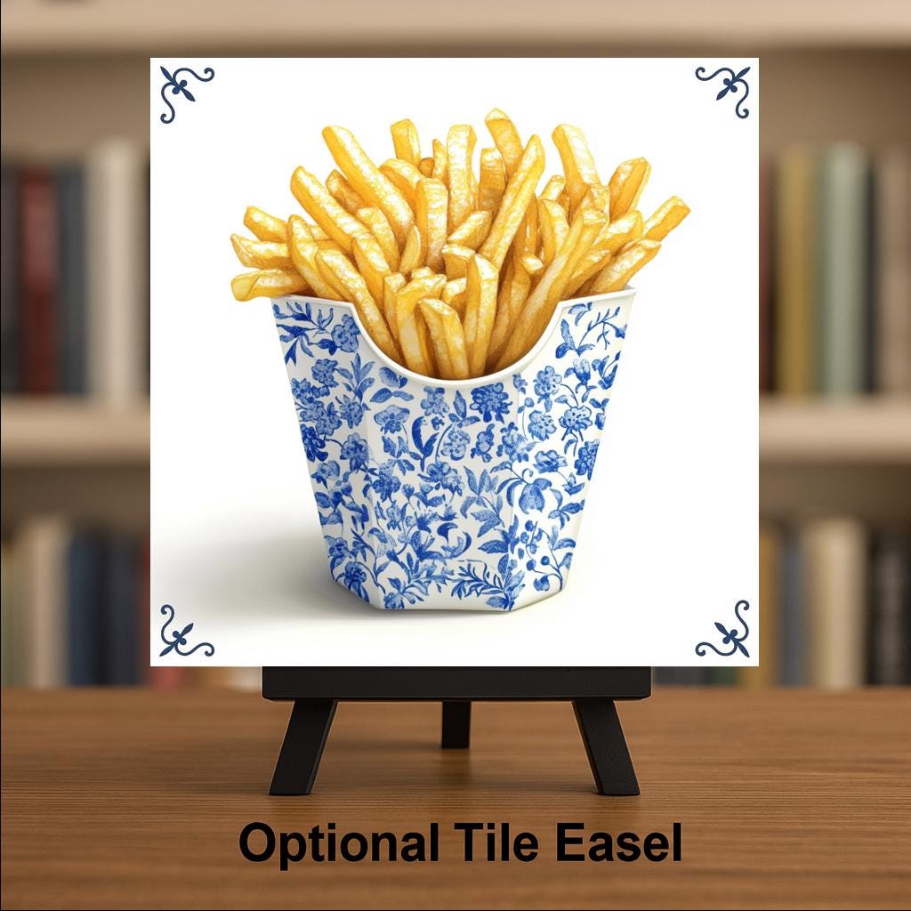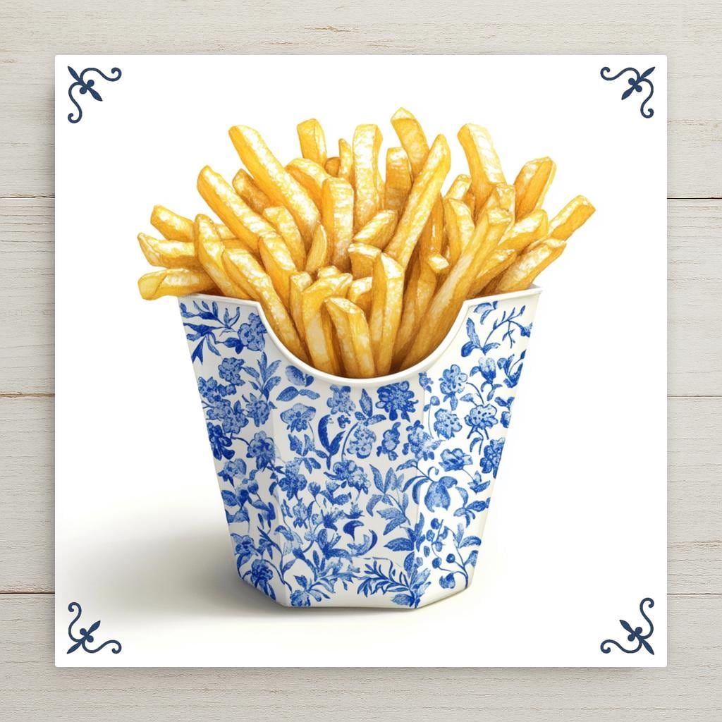 This Blue Delft Tile brings together two classics: fine floral ceramics and crispy French fries. The traditional blue-and-white floral design wraps around a takeout-style fry container, contrasting beautifully with the warm golden tones of the fries. It’s funny, stylish, and one-of-a-kind.
