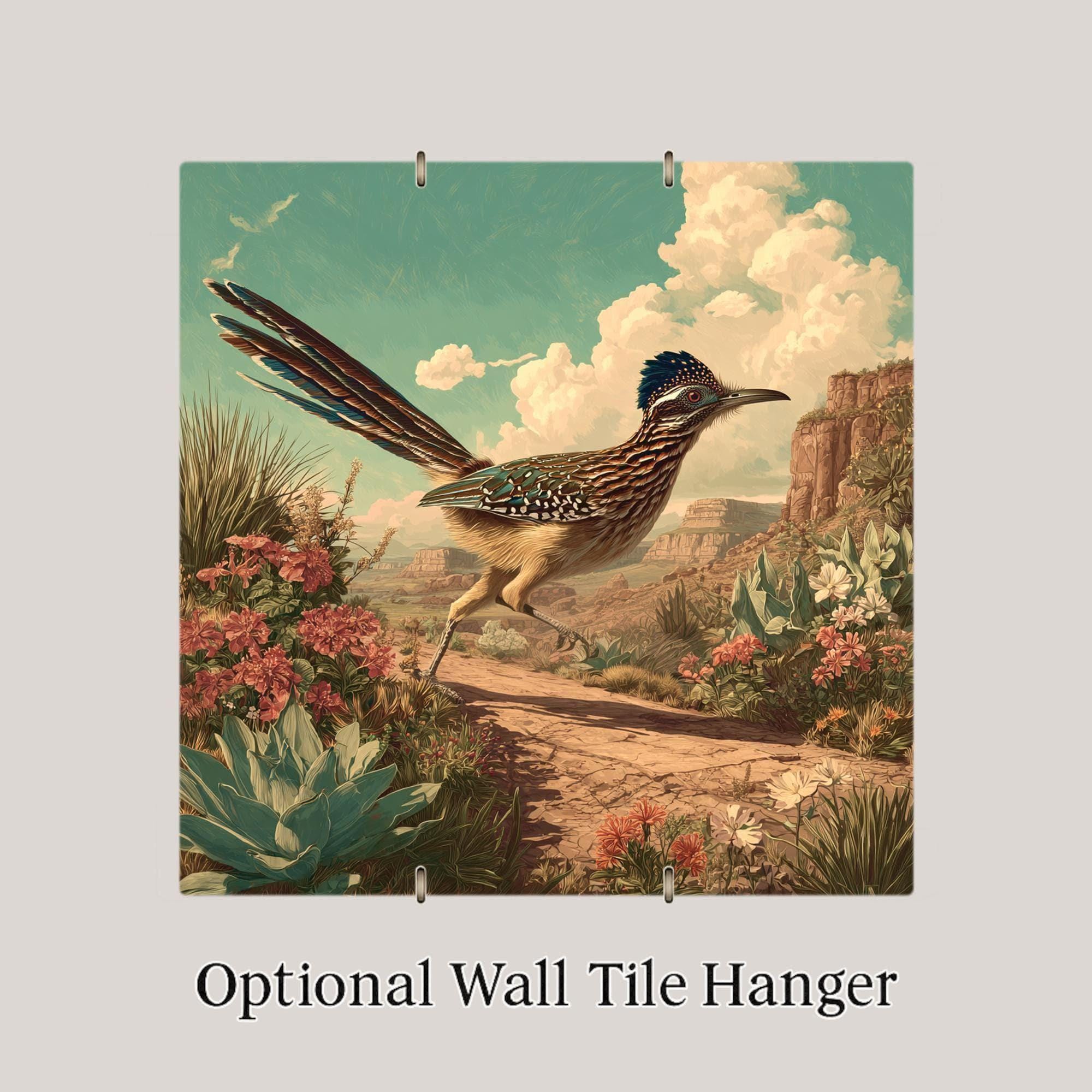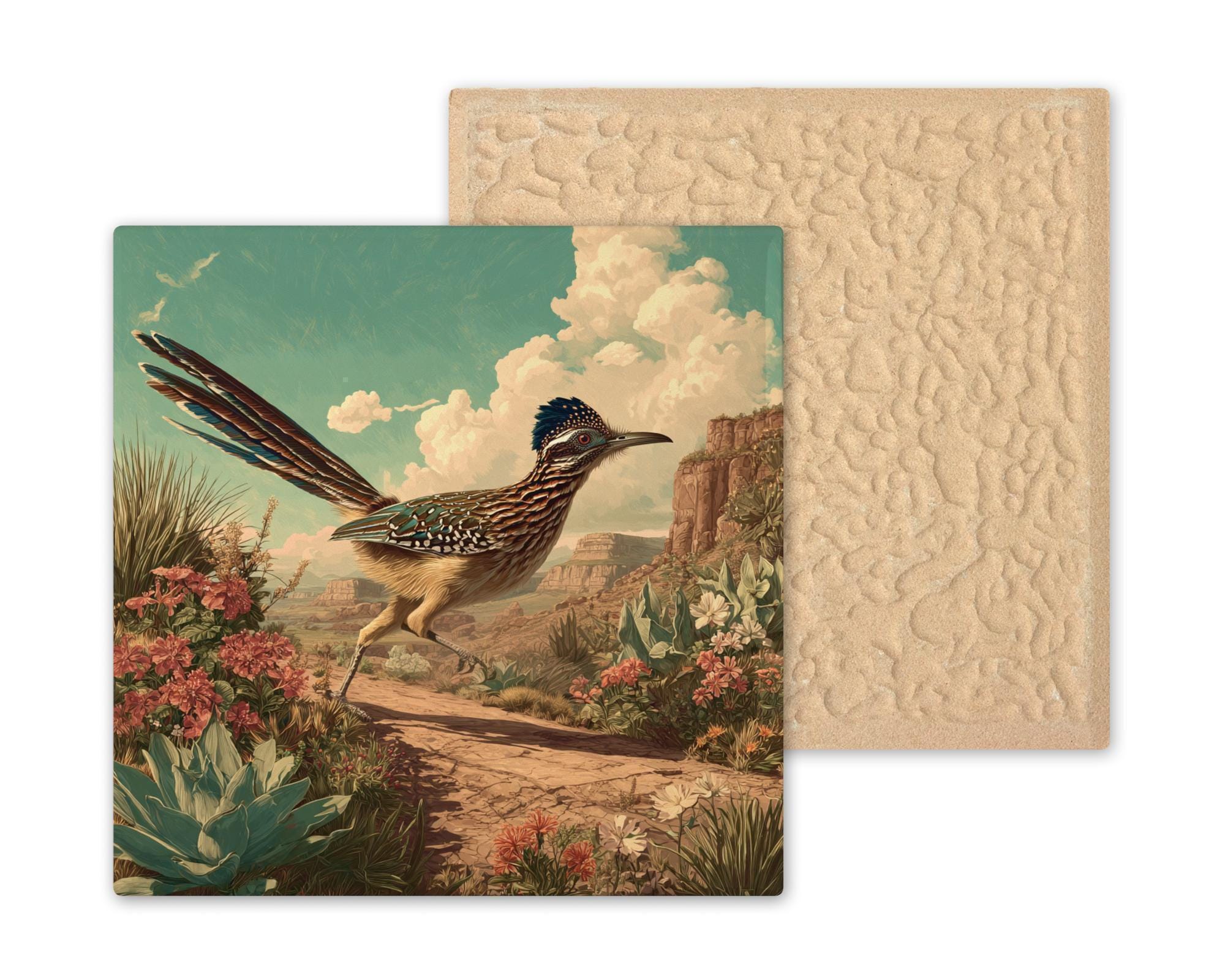 This Southwest roadrunner ceramic tile art brings the desert to life with vivid detail and natural elegance. A proud roadrunner dashes down a dusty path framed by blooming wildflowers, agave, and sandstone cliffs—making it a perfect focal piece for any southwestern-themed space.